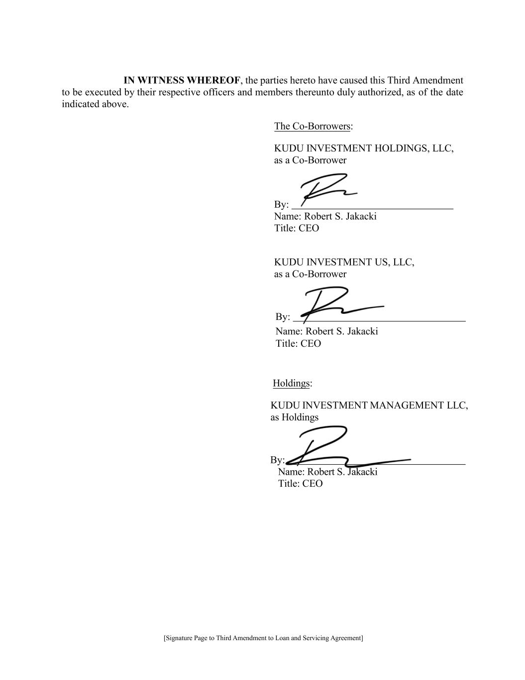[Signature Page to Third Amendment to Loan and Servicing Agreement] IN WITNESS WHEREOF, the parties hereto have caused this Third Amendment to be executed by their respective officers and members thereunto duly authorized, as of the date indicated above. The Co‐Borrowers: KUDU INVESTMENT HOLDINGS, LLC, as a Co-Borrower By: Name: Robert S. Jakacki Title: CEO KUDU INVESTMENT US, LLC, as a Co-Borrower By: Name: Robert S. Jakacki Title: CEO Holdings: KUDU INVESTMENT MANAGEMENT LLC, as Holdings By: Name: Robert S. Jakacki Title: CEO