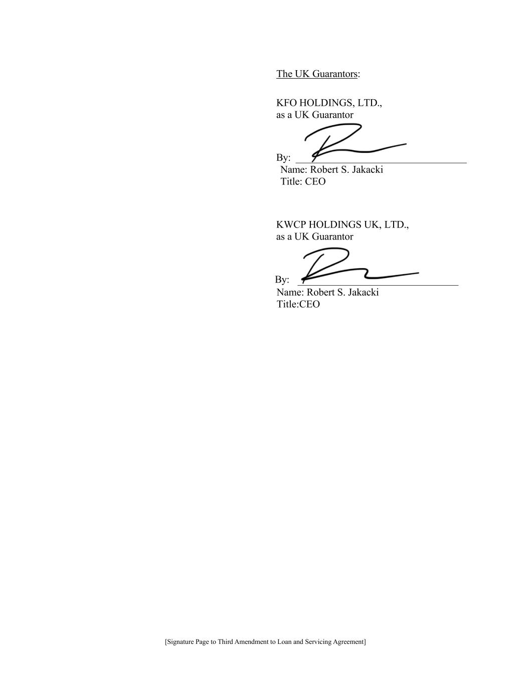 [Signature Page to Third Amendment to Loan and Servicing Agreement] The UK Guarantors: KFO HOLDINGS, LTD., as a UK Guarantor By: Name: Robert S. Jakacki Title: CEO KWCP HOLDINGS UK, LTD., as a UK Guarantor By: Name: Robert S. Jakacki Title:CEO
