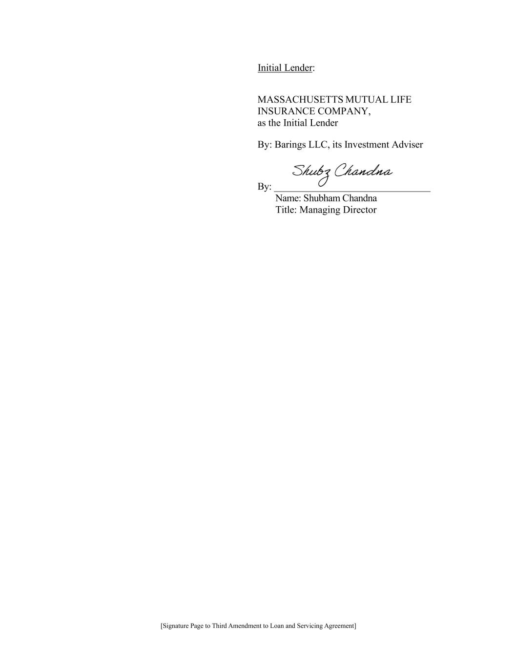 [Signature Page to Third Amendment to Loan and Servicing Agreement] Initial Lender: MASSACHUSETTS MUTUAL LIFE INSURANCE COMPANY, as the Initial Lender By: Barings LLC, its Investment Adviser By: _______________________________ Name: Shubham Chandna Title: Managing Director