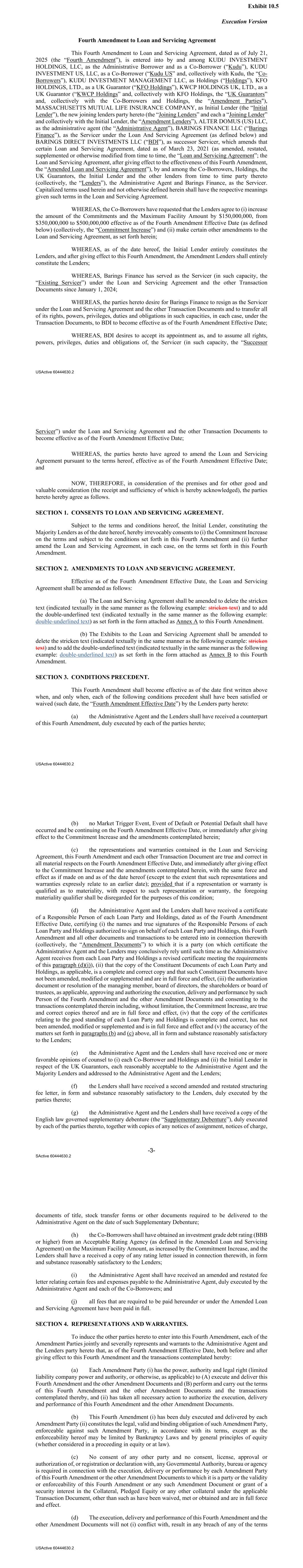 Execution Version USActive 60444630.2 Fourth Amendment to Loan and Servicing Agreement This Fourth Amendment to Loan and Servicing Agreement, dated as of July 21, 2025 (the “Fourth Amendment”), is entered into by and among KUDU INVESTMENT HOLDINGS, LLC, as the Administrative Borrower and as a Co-Borrower (“Kudu”), KUDU INVESTMENT US, LLC, as a Co-Borrower (“Kudu US” and, collectively with Kudu, the “Co- Borrowers”), KUDU INVESTMENT MANAGEMENT LLC, as Holdings (“Holdings”), KFO HOLDINGS, LTD., as a UK Guarantor (“KFO Holdings”), KWCP HOLDINGS UK, LTD., as a UK Guarantor (“KWCP Holdings” and, collectively with KFO Holdings, the “UK Guarantors” and, collectively with the Co-Borrowers and Holdings, the “Amendment Parties"), MASSACHUSETTS MUTUAL LIFE INSURANCE COMPANY, as Initial Lender (the “Initial Lender”), the new joining lenders party hereto (the “Joining Lenders” and each a “Joining Lender” and collectively with the Initial Lender, the “Amendment Lenders”), ALTER DOMUS (US) LLC, as the administrative agent (the “Administrative Agent”), BARINGS FINANCE LLC (“Barings Finance”), as the Servicer under the Loan And Servicing Agreement (as defined below) and BARINGS DIRECT INVESTMENTS LLC (“BDI”), as successor Servicer, which amends that certain Loan and Servicing Agreement, dated as of March 23, 2021 (as amended, restated, supplemented or otherwise modified from time to time, the “Loan and Servicing Agreement”; the Loan and Servicing Agreement, after giving effect to the effectiveness of this Fourth Amendment, the “Amended Loan and Servicing Agreement”), by and among the Co-Borrowers, Holdings, the UK Guarantors, the Initial Lender and the other lenders from time to time party thereto (collectively, the “Lenders”), the Administrative Agent and Barings Finance, as the Servicer. Capitalized terms used herein and not otherwise defined herein shall have the respective meanings given such terms in the Loan and Servicing Agreement. WHEREAS, the Co-Borrowers have requested that the Lenders agree to (i) increase the amount of the Commitments and the Maximum Facility Amount by $150,000,000, from $350,000,000 to $500,000,000 effective as of the Fourth Amendment Effective Date (as defined below) (collectively, the “Commitment Increase”) and (ii) make certain other amendments to the Loan and Servicing Agreement, as set forth herein; WHEREAS, as of the date hereof, the Initial Lender entirely constitutes the Lenders, and after giving effect to this Fourth Amendment, the Amendment Lenders shall entirely constitute the Lenders; WHEREAS, Barings Finance has served as the Servicer (in such capacity, the “Existing Servicer”) under the Loan and Servicing Agreement and the other Transaction Documents since January 1, 2024; WHEREAS, the parties hereto desire for Barings Finance to resign as the Servicer under the Loan and Servicing Agreement and the other Transaction Documents and to transfer all of its rights, powers, privileges, duties and obligations in such capacities, in each case, under the Transaction Documents, to BDI to become effective as of the Fourth Amendment Effective Date; WHEREAS, BDI desires to accept its appointment as, and to assume all rights, powers, privileges, duties and obligations of, the Servicer (in such capacity, the “Successor Exhibit 10.5 USActive 60444630.2 Servicer”) under the Loan and Servicing Agreement and the other Transaction Documents to become effective as of the Fourth Amendment Effective Date; WHEREAS, the parties hereto have agreed to amend the Loan and Servicing Agreement pursuant to the terms hereof, effective as of the Fourth Amendment Effective Date; and NOW, THEREFORE, in consideration of the premises and for other good and valuable consideration (the receipt and sufficiency of which is hereby acknowledged), the parties hereto hereby agree as follows. SECTION 1. CONSENTS TO LOAN AND SERVICING AGREEMENT. Subject to the terms and conditions hereof, the Initial Lender, constituting the Majority Lenders as of the date hereof, hereby irrevocably consents to (i) the Commitment Increase on the terms and subject to the conditions set forth in this Fourth Amendment and (ii) further amend the Loan and Servicing Agreement, in each case, on the terms set forth in this Fourth Amendment. SECTION 2. AMENDMENTS TO LOAN AND SERVICING AGREEMENT. Effective as of the Fourth Amendment Effective Date, the Loan and Servicing Agreement shall be amended as follows: (a) The Loan and Servicing Agreement shall be amended to delete the stricken text (indicated textually in the same manner as the following example: stricken text) and to add the double‐underlined text (indicated textually in the same manner as the following example: double‐underlined text) as set forth in the form attached as Annex A to this Fourth Amendment. (b) The Exhibits to the Loan and Servicing Agreement shall be amended to delete the stricken text (indicated textually in the same manner as the following example: stricken text) and to add the double‐underlined text (indicated textually in the same manner as the following example: double‐underlined text) as set forth in the form attached as Annex B to this Fourth Amendment. SECTION 3. CONDITIONS PRECEDENT. This Fourth Amendment shall become effective as of the date first written above when, and only when, each of the following conditions precedent shall have been satisfied or waived (such date, the “Fourth Amendment Effective Date”) by the Lenders party hereto: (a) the Administrative Agent and the Lenders shall have received a counterpart of this Fourth Amendment, duly executed by each of the parties hereto; -3- SActive 60444630.2 (b) no Market Trigger Event, Event of Default or Potential Default shall have occurred and be continuing on the Fourth Amendment Effective Date, or immediately after giving effect to the Commitment Increase and the amendments contemplated herein; (c) 
