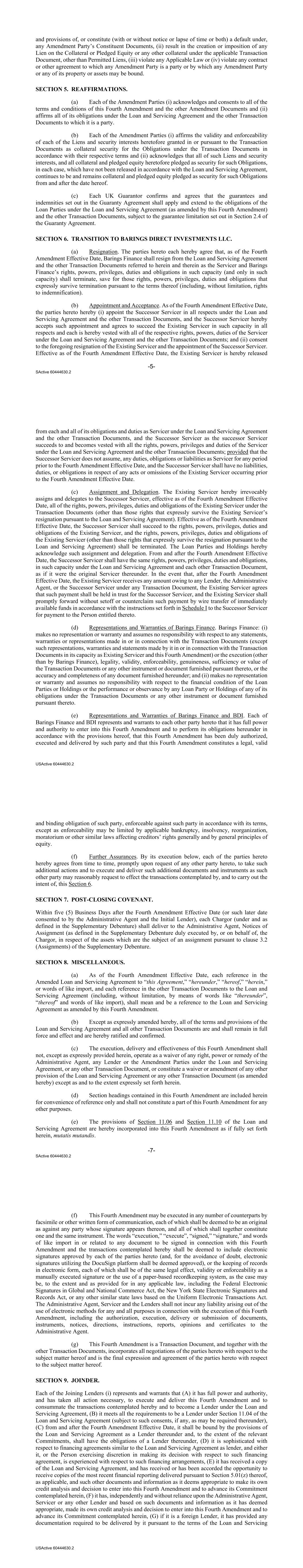 -5- SActive 60444630.2 and provisions of, or constitute (with or without notice or lapse of time or both) a default under, any Amendment Party’s Constituent Documents, (ii) result in the creation or imposition of any Lien on the Collateral or Pledged Equity or any other collateral under the applicable Transaction Document, other than Permitted Liens, (iii) violate any Applicable Law or (iv) violate any contract or other agreement to which any Amendment Party is a party or by which any Amendment Party or any of its property or assets may be bound. SECTION 5. REAFFIRMATIONS. (a) Each of the Amendment Parties (i) acknowledges and consents to all of the terms and conditions of this Fourth Amendment and the other Amendment Documents and (ii) affirms all of its obligations under the Loan and Servicing Agreement and the other Transaction Documents to which it is a party. (b) Each of the Amendment Parties (i) affirms the validity and enforceability of each of the Liens and security interests heretofore granted in or pursuant to the Transaction Documents as collateral security for the Obligations under the Transaction Documents in accordance with their respective terms and (ii) acknowledges that all of such Liens and security interests, and all collateral and pledged equity heretofore pledged as security for such Obligations, in each case, which have not been released in accordance with the Loan and Servicing Agreement, continues to be and remains collateral and pledged equity pledged as security for such Obligations from and after the date hereof. (c) Each UK Guarantor confirms and agrees that the guarantees and indemnities set out in the Guaranty Agreement shall apply and extend to the obligations of the Loan Parties under the Loan and Servicing Agreement (as amended by this Fourth Amendment) and the other Transaction Documents, subject to the guarantee limitation set out in Section 2.4 of the Guaranty Agreement. SECTION 6. TRANSITION TO BARINGS DIRECT INVESTMENTS LLC. (a) Resignation. The parties hereto each hereby agree that, as of the Fourth Amendment Effective Date, Barings Finance shall resign from the Loan and Servicing Agreement and the other Transaction Documents referred to herein and therein as the Servicer and Barings Finance’s rights, powers, privileges, duties and obligations in such capacity (and only in such capacity) shall terminate, save for those rights, powers, privileges, duties and obligations that expressly survive termination pursuant to the terms thereof (including, without limitation, rights to indemnification). (b) Appointment and Acceptance. As of the Fourth Amendment Effective Date, the parties hereto hereby (i) appoint the Successor Servicer in all respects under the Loan and Servicing Agreement and the other Transaction Documents, and the Successor Servicer hereby accepts such appointment and agrees to succeed the Existing Servicer in such capacity in all respects and each is hereby vested with all of the respective rights, powers, duties of the Servicer under the Loan and Servicing Agreement and the other Transaction Documents; and (ii) consent to the foregoing resignation of the Existing Servicer and the appointment of the Successor Servicer. Effective as of the Fourth Amendment Effective Date, the Existing Servicer is hereby released USActive 60444630.2 from each and all of its obligations and duties as Servicer under the Loan and Servicing Agreement and the other Transaction Documents, and the Successor Servicer as the successor Servicer succeeds to and becomes vested with all the rights, powers, privileges and duties of the Servicer under the Loan and Servicing Agreement and the other Transaction Documents; provided that the Successor Servicer does not assume, any duties, obligations or liabilities as Servicer for any period prior to the Fourth Amendment Effective Date, and the Successor Servicer shall have no liabilities, duties, or obligations in respect of any acts or omissions of the Existing Servicer occurring prior to the Fourth Amendment Effective Date. (c) Assignment and Delegation. The Existing Servicer hereby irrevocably assigns and delegates to the Successor Servicer, effective as of the Fourth Amendment Effective Date, all of the rights, powers, privileges, duties and obligations of the Existing Servicer under the Transaction Documents (other than those rights that expressly survive the Existing Servicer’s resignation pursuant to the Loan and Servicing Agreement). Effective as of the Fourth Amendment Effective Date, the Successor Servicer shall succeed to the rights, powers, privileges, duties and obligations of the Existing Servicer, and the rights, powers, privileges, duties and obligations of the Existing Servicer (other than those rights that expressly survive the resignation pursuant to the Loan and Servicing Agreement) shall be terminated. The Loan Parties and Holdings hereby acknowledge such assignment and delegation. From and after the Fourth Amendment Effective Date, the Successor Servicer shall have the same rights, powers, privileges, duties and obligations, in such capacity under the Loan and Servicing Agreement and each other Transaction Document, as if it were the original Servicer thereunder. In the event that, after the Fourth Amendment Effective Date, the Existing Servicer receives any amount owing to any Lender, the Administrative Agent, or the Successor Servicer under any Transaction Document, the Existing Servicer agrees that such payment shall be held in trust for the Successor Servicer, and the Existing Servicer shall promptly forward without setoff or counterclaim such payment by wire transfer of immediately available funds in accordance with the instructions set forth in Schedule I to the Successor Servicer for payment to the Person entitled thereto. (d) Representations and Warranties of Barings Finance. Barings Finance: (i) makes no representation or warranty and assumes no responsibility with respect to any statement