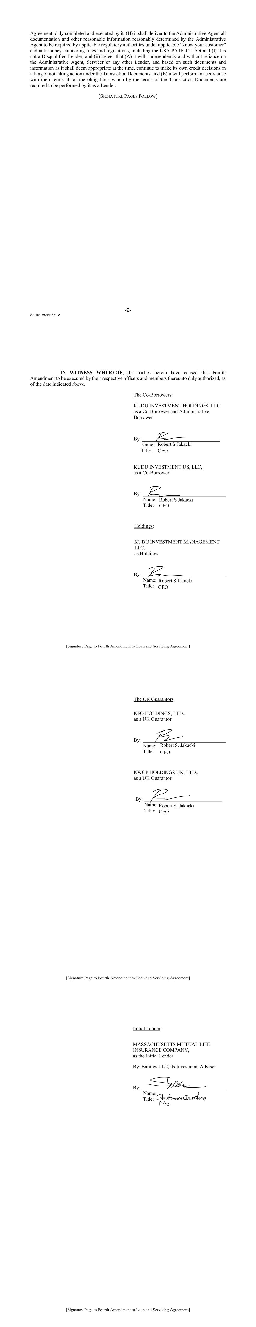 -9- SActive 60444630.2 Agreement, duly completed and executed by it, (H) it shall deliver to the Administrative Agent all documentation and other reasonable information reasonably determined by the Administrative Agent to be required by applicable regulatory authorities under applicable “know your customer” and anti-money laundering rules and regulations, including the USA PATRIOT Act and (I) it is not a Disqualified Lender; and (ii) agrees that (A) it will, independently and without reliance on the Administrative Agent, Servicer or any other Lender, and based on such documents and information as it shall deem appropriate at the time, continue to make its own credit decisions in taking or not taking action under the Transaction Documents, and (B) it will perform in accordance with their terms all of the obligations which by the terms of the Transaction Documents are required to be performed by it as a Lender. [SIGNATURE PAGES FOLLOW] [Signature Page to Fourth Amendment to Loan and Servicing Agreement] IN WITNESS WHEREOF, the parties hereto have caused this Fourth Amendment to be executed by their respective officers and members thereunto duly authorized, as of the date indicated above. The Co‐Borrowers: KUDU INVESTMENT HOLDINGS, LLC, as a Co-Borrower and Administrative Borrower By: _______________________________ Name: Title: KUDU INVESTMENT US, LLC, as a Co-Borrower By: _________________________________ Name: Title: Holdings: KUDU INVESTMENT MANAGEMENT LLC, as Holdings By: _________________________________ Name: Title: Robert S Jakacki CEO Robert S Jakacki CEO Robert S Jakacki CEO [Signature Page to Fourth Amendment to Loan and Servicing Agreement] The UK Guarantors: KFO HOLDINGS, LTD., as a UK Guarantor By: _________________________________ Name: Title: KWCP HOLDINGS UK, LTD., as a UK Guarantor By: _______________________________ Name: Title: Robert S. Jakacki CEO Robert S. Jakacki CEO [Signature Page to Fourth Amendment to Loan and Servicing Agreement] Initial Lender: MASSACHUSETTS MUTUAL LIFE INSURANCE COMPANY, as the Initial Lender By: Barings LLC, its Investment Adviser By: __________________________________ Name: Title: