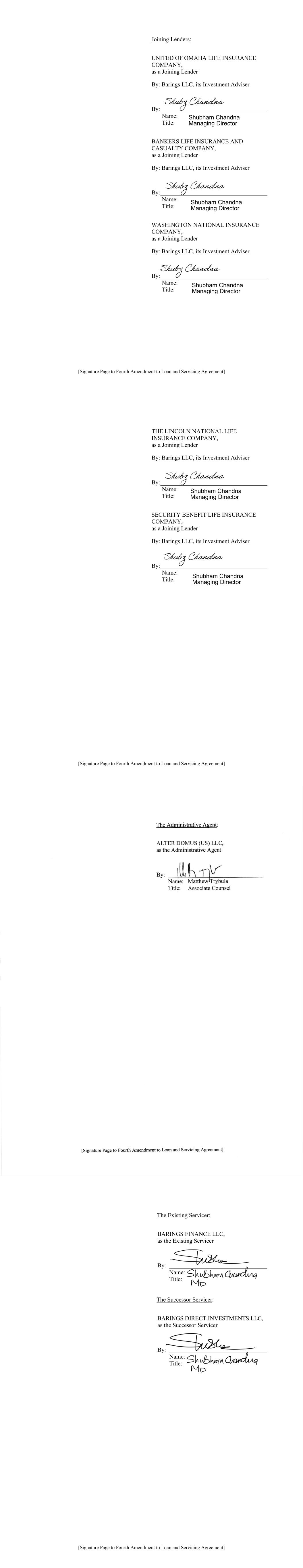 [Signature Page to Fourth Amendment to Loan and Servicing Agreement] Joining Lenders: UNITED OF OMAHA LIFE INSURANCE COMPANY, as a Joining Lender By: Barings LLC, its Investment Adviser By: ____________________________________ Name: Title: BANKERS LIFE INSURANCE AND CASUALTY COMPANY, as a Joining Lender By: Barings LLC, its Investment Adviser By: ____________________________________ Name: Title: WASHINGTON NATIONAL INSURANCE COMPANY, as a Joining Lender By: Barings LLC, its Investment Adviser By: ____________________________________ Name: Title: Shubham Chandna Managing Director Shubham Chandna Managing Director Shubham Chandna Managing Director [Signature Page to Fourth Amendment to Loan and Servicing Agreement] THE LINCOLN NATIONAL LIFE INSURANCE COMPANY, as a Joining Lender By: Barings LLC, its Investment Adviser By: ____________________________________ Name: Title: SECURITY BENEFIT LIFE INSURANCE COMPANY, as a Joining Lender By: Barings LLC, its Investment Adviser By: ____________________________________ Name: Title: Shubham Chandna Managing Director Shubham Chandna Managing Director [Signature Page to Fourth Amendment to Loan and Servicing Agreement] The Existing Servicer: BARINGS FINANCE LLC, as the Existing Servicer By: _________________________________ Name: Title: The Successor Servicer: BARINGS DIRECT INVESTMENTS LLC, as the Successor Servicer By: _________________________________ Name: Title: