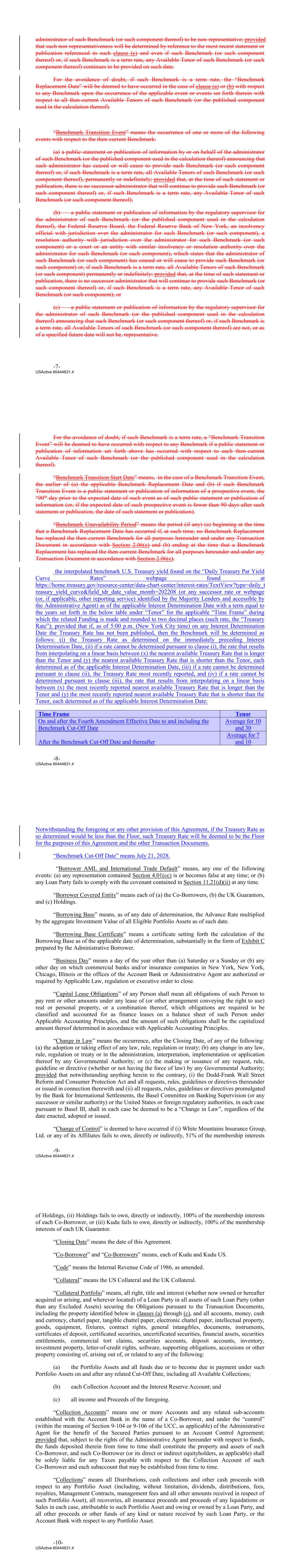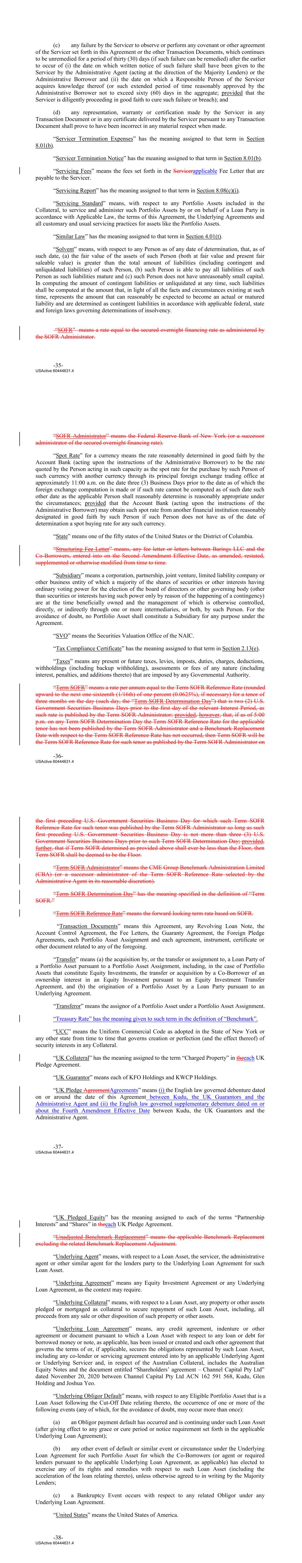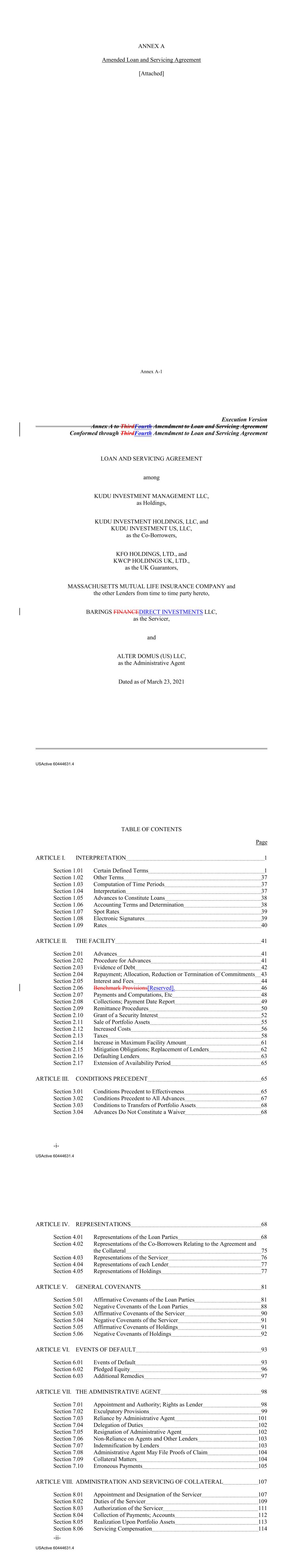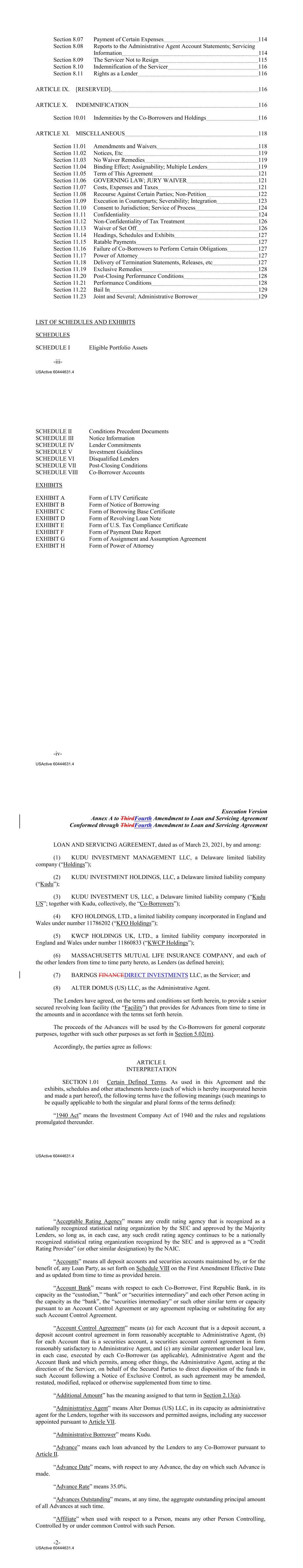 Section 8.07 Payment of Certain Expenses 114 Section 8.08 Reports to the Administrative Agent Account Statements; Servicing Information 114 Section 8.09 The Servicer Not to Resign 115 Section 8.10 Indemnification of the Servicer 116 Section 8.11 Rights as a Lender 116 ARTICLE IX. [RESERVED]. 116 ARTICLE X. INDEMNIFICATION 116 Section 10.01 Indemnities by the Co‐Borrowers and Holdings 116 ARTICLE XI. MISCELLANEOUS 118 Section 11.01 Amendments and Waivers 118 Section 11.02 Notices, Etc 119 Section 11.03 No Waiver Remedies 119 Section 11.04 Binding Effect; Assignability; Multiple Lenders 119 Section 11.05 Term of This Agreement 121 Section 11.06 GOVERNING LAW; JURY WAIVER 121 Section 11.07 Costs, Expenses and Taxes 121 Section 11.08 Recourse Against Certain Parties; Non‐Petition 122 Section 11.09 Execution in Counterparts; Severability; Integration 123 Section 11.10 Consent to Jurisdiction; Service of Process 124 Section 11.11 Confidentiality 124 Section 11.12 Non‐Confidentiality of Tax Treatment 126 Section 11.13 Waiver of Set Off 126 Section 11.14 Headings, Schedules and Exhibits 127 Section 11.15 Ratable Payments 127 Section 11.16 Failure of Co‐Borrowers to Perform Certain Obligations 127 Section 11.17 Power of Attorney 127 Section 11.18 Delivery of Termination Statements, Releases, etc 127 Section 11.19 Exclusive Remedies 128 Section 11.20 Post‐Closing Performance Conditions 128 Section 11.21 Performance Conditions 128 Section 11.22 Bail In 129 Section 11.23 Joint and Several; Administrative Borrower 129 LIST OF SCHEDULES AND EXHIBITS SCHEDULES SCHEDULE I Eligible Portfolio Assets -iii- USActive 60444631.4 SCHEDULE II Conditions Precedent Documents SCHEDULE III Notice Information SCHEDULE IV Lender Commitments SCHEDULE V Investment Guidelines SCHEDULE VI Disqualified Lenders SCHEDULE VII Post‐Closing Conditions SCHEDULE VIII Co-Borrower Accounts EXHIBITS EXHIBIT A Form of LTV Certificate EXHIBIT B Form of Notice of Borrowing EXHIBIT C Form of Borrowing Base Certificate EXHIBIT D Form of Revolving Loan Note EXHIBIT E Form of U.S. Tax Compliance Certificate EXHIBIT F Form of Payment Date Report EXHIBIT G Form of Assignment and Assumption Agreement EXHIBIT H Form of Power of Attorney -iv- USActive 60444631.4 Execution Version Annex A to ThirdFourth Amendment to Loan and Servicing Agreement Conformed through ThirdFourth Amendment to Loan and Servicing Agreement LOAN AND SERVICING AGREEMENT, dated as of March 23, 2021, by and among: (1) KUDU INVESTMENT MANAGEMENT LLC, a Delaware limited liability company (“Holdings”); (2) KUDU INVESTMENT HOLDINGS, LLC, a Delaware limited liability company (“Kudu”); (3) KUDU INVESTMENT US, LLC, a Delaware limited liability company (“Kudu US”; together with Kudu, collectively, the “Co-Borrowers”); (4) KFO HOLDINGS, LTD., a limited liability company incorporated in England and Wales under number 11786202 (“KFO Holdings”); (5) KWCP HOLDINGS UK, LTD., a limited liability company incorporated in England and Wales under number 11860833 (“KWCP Holdings”); (6) MASSACHUSETTS MUTUAL LIFE INSURANCE COMPANY, and each of the other lenders from time to time party hereto, as Lenders (as defined herein); (7) BARINGS FINANCEDIRECT INVESTMENTS LLC, as the Servicer; and (8) ALTER DOMUS (US) LLC, as the Administrative Agent. The Lenders have agreed, on the terms and conditions set forth herein, to provide a senior secured revolving loan facility (the “Facility”) that provides for Advances from time to time in the amounts and in accordance with the terms set forth herein. The proceeds of the Advances will be used by the Co‐Borrowers for general corporate purposes, together with such other purposes as set forth in Section 5.02(m). Accordingly, the parties agree as follows: ARTICLE I. INTERPRETATION SECTION 1.01 Certain Defined Terms. As used in this Agreement and the exhibits, schedules and other attachments hereto (each of which is hereby incorporated herein and made a part hereof), the following terms have the following meanings (such meanings to be equally applicable to both the singular and plural forms of the terms defined): “1940 Act” means the Investment Company Act of 1940 and the rules and regulations promulgated thereunder. USActive 60444631.4 “Acceptable Rating Agency” means any credit rating agency that is recognized as a nationally recognized statistical rating organization by the SEC and approved by the Majority Lenders, so long as, in each case, any such credit rating agency continues to be a nationally recognized statistical rating organization recognized by the SEC and is approved as a “Credit Rating Provider” (or other similar designation) by the NAIC. “Accounts” means all deposit accounts and securities accounts maintained by, or for the benefit of, any Loan Party, as set forth on Schedule VIII on the First Amendment Effective Date and as updated from time to time as provided herein. “Account Bank” means with respect to each Co‐Borrower, First Republic Bank, in its capacity as the “custodian,” “bank” or “securities intermediary” and each other Person acting in the capacity as the “bank”, the “securities intermediary” or such other similar term or capacity pursuant to an Account Control Agreement or any agreement replacing or substituting for any such Account Control Agreement. “Account Control Agreement” means (a) for each Account that is a deposit account, a deposit account control agreement in form reasonably acceptable to Administrative Agent, (b) for each Account that is a securities account, a securities account control agreement in form reasonably satisfactory to Administrative Agent, and (c) any similar agreement under local law, in each case, executed by each Co‐Borrower (as applicable), Administrative Agent and the Account Bank and which permits, among other things, the Administrative Agent, acting at the direction of the Servicer, on behalf of the Secured Parties 