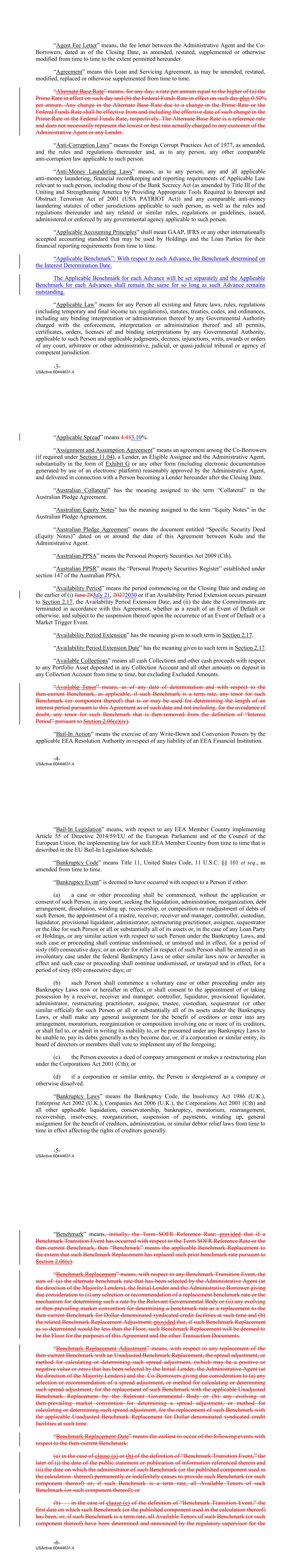 “Agent Fee Letter” means, the fee letter between the Administrative Agent and the Co‐ Borrowers, dated as of the Closing Date, as amended, restated, supplemented or otherwise modified from time to time to the extent permitted hereunder. “Agreement” means this Loan and Servicing Agreement, as may be amended, restated, modified, replaced or otherwise supplemented from time to time. “Alternate Base Rate” means, for any day, a rate per annum equal to the higher of (a) the Prime Rate in effect on such day and (b) the Federal Funds Rate in effect on such day plus 0.50% per annum. Any change in the Alternate Base Rate due to a change in the Prime Rate or the Federal Funds Rate shall be effective from and including the effective date of such change in the Prime Rate or the Federal Funds Rate, respectively. The Alternate Base Rate is a reference rate and does not necessarily represent the lowest or best rate actually charged to any customer of the Administrative Agent or any Lender. “Anti‐Corruption Laws” means the Foreign Corrupt Practices Act of 1977, as amended, and the rules and regulations thereunder and, as to any person, any other comparable anti‐corruption law applicable to such person. “Anti‐Money Laundering Laws” means, as to any person, any and all applicable anti‐money laundering, financial recordkeeping and reporting requirements of Applicable Law relevant to such person, including those of the Bank Secrecy Act (as amended by Title III of the Uniting and Strengthening America by Providing Appropriate Tools Required to Intercept and Obstruct Terrorism Act of 2001 (USA PATRIOT Act)) and any comparable anti‐money laundering statutes of other jurisdictions applicable to such person, as well as the rules and regulations thereunder and any related or similar rules, regulations or guidelines, issued, administered or enforced by any governmental agency applicable to such person. “Applicable Accounting Principles” shall mean GAAP, IFRS or any other internationally accepted accounting standard that may be used by Holdings and the Loan Parties for their financial reporting requirements from time to time. “Applicable Benchmark”: With respect to each Advance, the Benchmark determined on the Interest Determination Date. The Applicable Benchmark for each Advance will be set separately and the Applicable Benchmark for each Advances shall remain the same for so long as such Advance remains outstanding. “Applicable Law” means for any Person all existing and future laws, rules, regulations (including temporary and final income tax regulations), statutes, treaties, codes, and ordinances, including any binding interpretation or administration thereof by any Governmental Authority charged with the enforcement, interpretation or administration thereof and all permits, certificates, orders, licenses of and binding interpretations by any Governmental Authority, applicable to such Person and applicable judgments, decrees, injunctions, writs, awards or orders of any court, arbitrator or other administrative, judicial, or quasi‐judicial tribunal or agency of competent jurisdiction. -3- USActive 60444631.4 “Applicable Spread” means 4.453.10%. “Assignment and Assumption Agreement” means an agreement among the Co‐Borrowers (if required under Section 11.04), a Lender, an Eligible Assignee and the Administrative Agent, substantially in the form of Exhibit G or any other form (including electronic documentation generated by use of an electronic platform) reasonably approved by the Administrative Agent, and delivered in connection with a Person becoming a Lender hereunder after the Closing Date. “Australian Collateral” has the meaning assigned to the term “Collateral” in the Australian Pledge Agreement. “Australian Equity Notes” has the meaning assigned to the term “Equity Notes” in the Australian Pledge Agreement. “Australian Pledge Agreement” means the document entitled “Specific Security Deed (Equity Notes)” dated on or around the date of this Agreement between Kudu and the Administrative Agent. “Australian PPSA” means the Personal Property Securities Act 2009 (Cth). “Australian PPSR” means the “Personal Property Securities Register” established under section 147 of the Australian PPSA. “Availability Period” means the period commencing on the Closing Date and ending on the earlier of (i) June 28July 21, 20272030 or if an Availability Period Extension occurs pursuant to Section 2.17, the Availability Period Extension Date, and (ii) the date the Commitments are terminated in accordance with this Agreement, whether as a result of an Event of Default or otherwise, and subject to the suspension thereof upon the occurrence of an Event of Default or a Market Trigger Event. “Availability Period Extension” has the meaning given to such term in Section 2.17. “Availability Period Extension Date” has the meaning given to such term in Section 2.17. “Available Collections” means all cash Collections and other cash proceeds with respect to any Portfolio Asset deposited in any Collection Account and all other amounts on deposit in any Collection Account from time to time, but excluding Excluded Amounts. “Available Tenor” means, as of any date of determination and with respect to the then-current Benchmark, as applicable, if such Benchmark is a term rate, any tenor for such Benchmark (or component thereof) that is or may be used for determining the length of an interest period pursuant to this Agreement as of such date and not including, for the avoidance of doubt, any tenor for such Benchmark that is then-removed from the definition of “Interest Period” pursuant to Section 2.06(c)(iv). “Bail‐In Action” means the exercise of any Write‐Down and Conversion Powers by the applicable EEA Resolution Authority in respect of any liability of an EEA Financial Institution. -4- USActive 60444631.4 “Bail‐In Legislatio