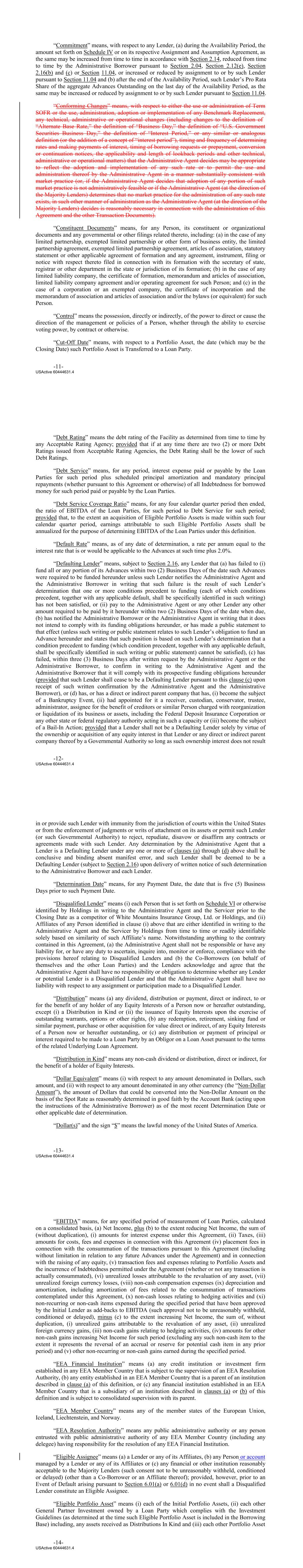 “Commitment” means, with respect to any Lender, (a) during the Availability Period, the amount set forth on Schedule IV or on its respective Assignment and Assumption Agreement, as the same may be increased from time to time in accordance with Section 2.14, reduced from time to time by the Administrative Borrower pursuant to Section 2.04, Section 2.12(e), Section 2.16(b) and (c) or Section 11.04, or increased or reduced by assignment to or by such Lender pursuant to Section 11.04 and (b) after the end of the Availability Period, such Lender’s Pro Rata Share of the aggregate Advances Outstanding on the last day of the Availability Period, as the same may be increased or reduced by assignment to or by such Lender pursuant to Section 11.04. “Conforming Changes” means, with respect to either the use or administration of Term SOFR or the use, administration, adoption or implementation of any Benchmark Replacement, any technical, administrative or operational changes (including changes to the definition of “Alternate Base Rate,” the definition of “Business Day,” the definition of “U.S. Government Securities Business Day,” the definition of “Interest Period,” or any similar or analogous definition (or the addition of a concept of “interest period”), timing and frequency of determining rates and making payments of interest, timing of borrowing requests or prepayment, conversion or continuation notices, the applicability and length of lookback periods and other technical, administrative or operational matters) that the Administrative Agent decides may be appropriate to reflect the adoption and implementation of any such rate or to permit the use and administration thereof by the Administrative Agent in a manner substantially consistent with market practice (or, if the Administrative Agent decides that adoption of any portion of such market practice is not administratively feasible or if the Administrative Agent (at the direction of the Majority Lenders) determines that no market practice for the administration of any such rate exists, in such other manner of administration as the Administrative Agent (at the direction of the Majority Lenders) decides is reasonably necessary in connection with the administration of this Agreement and the other Transaction Documents). “Constituent Documents” means, for any Person, its constituent or organizational documents and any governmental or other filings related thereto, including: (a) in the case of any limited partnership, exempted limited partnership or other form of business entity, the limited partnership agreement, exempted limited partnership agreement, articles of association, statutory statement or other applicable agreement of formation and any agreement, instrument, filing or notice with respect thereto filed in connection with its formation with the secretary of state, registrar or other department in the state or jurisdiction of its formation; (b) in the case of any limited liability company, the certificate of formation, memorandum and articles of association, limited liability company agreement and/or operating agreement for such Person; and (c) in the case of a corporation or an exempted company, the certificate of incorporation and the memorandum of association and articles of association and/or the bylaws (or equivalent) for such Person. “Control” means the possession, directly or indirectly, of the power to direct or cause the direction of the management or policies of a Person, whether through the ability to exercise voting power, by contract or otherwise. “Cut‐Off Date” means, with respect to a Portfolio Asset, the date (which may be the Closing Date) such Portfolio Asset is Transferred to a Loan Party. -11- USActive 60444631.4 “Debt Rating” means the debt rating of the Facility as determined from time to time by any Acceptable Rating Agency; provided that if at any time there are two (2) or more Debt Ratings issued from Acceptable Rating Agencies, the Debt Rating shall be the lower of such Debt Ratings. “Debt Service” means, for any period, interest expense paid or payable by the Loan Parties for such period plus scheduled principal amortization and mandatory principal repayments (whether pursuant to this Agreement or otherwise) of all Indebtedness for borrowed money for such period paid or payable by the Loan Parties. “Debt Service Coverage Ratio” means, for any four calendar quarter period then ended, the ratio of EBITDA of the Loan Parties, for such period to Debt Service for such period; provided that, to the extent an acquisition of Eligible Portfolio Assets is made within such four calendar quarter period, earnings attributable to such Eligible Portfolio Assets shall be annualized for the purpose of determining EBITDA of the Loan Parties under this definition. “Default Rate” means, as of any date of determination, a rate per annum equal to the interest rate that is or would be applicable to the Advances at such time plus 2.0%. “Defaulting Lender” means, subject to Section 2.16, any Lender that (a) has failed to (i) fund all or any portion of its Advances within two (2) Business Days of the date such Advances were required to be funded hereunder unless such Lender notifies the Administrative Agent and the Administrative Borrower in writing that such failure is the result of such Lender’s determination that one or more conditions precedent to funding (each of which conditions precedent, together with any applicable default, shall be specifically identified in such writing) has not been satisfied, or (ii) pay to the Administrative Agent or any other Lender any other amount required to be paid by it hereunder within two (2) Business Days of the date when due, (b) has notified the Administrative Borrower or the Administrative Agent in writing that it does not intend to comply with its funding obligations hereunder, or has made a public statement to that effect (unless su