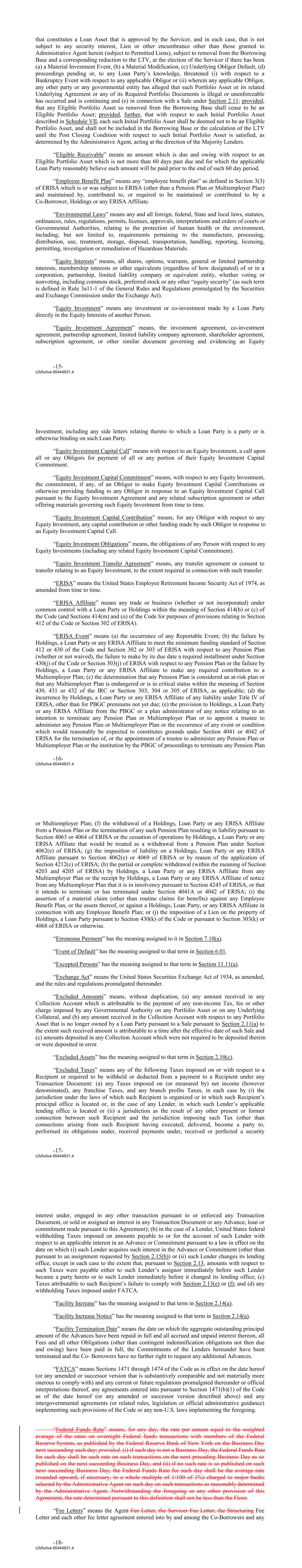 that constitutes a Loan Asset that is approved by the Servicer, and in each case, that is not subject to any security interest, Lien or other encumbrance other than those granted to Administrative Agent herein (subject to Permitted Liens), subject to removal from the Borrowing Base and a corresponding reduction to the LTV, at the election of the Servicer if there has been (a) a Material Investment Event, (b) a Material Modification, (c) Underlying Obligor Default, (d) proceedings pending or, to any Loan Party’s knowledge, threatened (i) with respect to a Bankruptcy Event with respect to any applicable Obligor or (ii) wherein any applicable Obligor, any other party or any governmental entity has alleged that such Portfolio Asset or its related Underlying Agreement or any of its Required Portfolio Documents is illegal or unenforceable has occurred and is continuing and (e) in connection with a Sale under Section 2.11; provided, that any Eligible Portfolio Asset so removed from the Borrowing Base shall cease to be an Eligible Portfolio Asset; provided, further, that with respect to each Initial Portfolio Asset described in Schedule VII, each such Initial Portfolio Asset shall be deemed not to be an Eligible Portfolio Asset, and shall not be included in the Borrowing Base or the calculation of the LTV until the Post Closing Condition with respect to such Initial Portfolio Asset is satisfied, as determined by the Administrative Agent, acting at the direction of the Majority Lenders. “Eligible Receivable” means an amount which is due and owing with respect to an Eligible Portfolio Asset which is not more than 60 days past due and for which the applicable Loan Party reasonably believe such amount will be paid prior to the end of such 60 day period. “Employee Benefit Plan” means any “employee benefit plan” as defined in Section 3(3) of ERISA which is or was subject to ERISA (other than a Pension Plan or Multiemployer Plan) and maintained by, contributed to, or required to be maintained or contributed to by a Co‐Borrower, Holdings or any ERISA Affiliate. “Environmental Laws” means any and all foreign, federal, State and local laws, statutes, ordinances, rules, regulations, permits, licenses, approvals, interpretations and orders of courts or Governmental Authorities, relating to the protection of human health or the environment, including, but not limited to, requirements pertaining to the manufacture, processing, distribution, use, treatment, storage, disposal, transportation, handling, reporting, licensing, permitting, investigation or remediation of Hazardous Materials. “Equity Interests” means, all shares, options, warrants, general or limited partnership interests, membership interests or other equivalents (regardless of how designated) of or in a corporation, partnership, limited liability company or equivalent entity, whether voting or nonvoting, including common stock, preferred stock or any other “equity security” (as such term is defined in Rule 3a11‐1 of the General Rules and Regulations promulgated by the Securities and Exchange Commission under the Exchange Act). “Equity Investment” means any investment or co‐investment made by a Loan Party directly in the Equity Interests of another Person. “Equity Investment Agreement” means, the investment agreement, co‐investment agreement, partnership agreement, limited liability company agreement, shareholder agreement, subscription agreement, or other similar document governing and evidencing an Equity -15- USActive 60444631.4 Investment, including any side letters relating thereto to which a Loan Party is a party or is otherwise binding on such Loan Party. “Equity Investment Capital Call” means with respect to an Equity Investment, a call upon all or any Obligors for payment of all or any portion of their Equity Investment Capital Commitment. “Equity Investment Capital Commitment” means, with respect to any Equity Investment, the commitment, if any, of an Obligor to make Equity Investment Capital Contributions or otherwise providing funding to any Obligor in response to an Equity Investment Capital Call pursuant to the Equity Investment Agreement and any related subscription agreement or other offering materials governing such Equity Investment from time to time. “Equity Investment Capital Contribution” means, for any Obligor with respect to any Equity Investment, any capital contribution or other funding made by such Obligor in response to an Equity Investment Capital Call. “Equity Investment Obligations” means, the obligations of any Person with respect to any Equity Investments (including any related Equity Investment Capital Commitment). “Equity Investment Transfer Agreement” means, any transfer agreement or consent to transfer relating to an Equity Investment, to the extent required in connection with such transfer. “ERISA” means the United States Employee Retirement Income Security Act of 1974, as amended from time to time. “ERISA Affiliate” means any trade or business (whether or not incorporated) under common control with a Loan Party or Holdings within the meaning of Section 414(b) or (c) of the Code (and Sections 414(m) and (o) of the Code for purposes of provisions relating to Section 412 of the Code or Section 302 of ERISA). “ERISA Event” means (a) the occurrence of any Reportable Event; (b) the failure by Holdings, a Loan Party or any ERISA Affiliate to meet the minimum funding standard of Section 412 or 430 of the Code and Section 302 or 303 of ERISA with respect to any Pension Plan (whether or not waived), the failure to make by its due date a required installment under Section 430(j) of the Code or Section 303(j) of ERISA with respect to any Pension Plan or the failure by Holdings, a Loan Party or any ERISA Affiliate to make any required contribution to a Multiemployer Plan; (c) the determination that any Pension Plan is considered an at‐risk plan or t