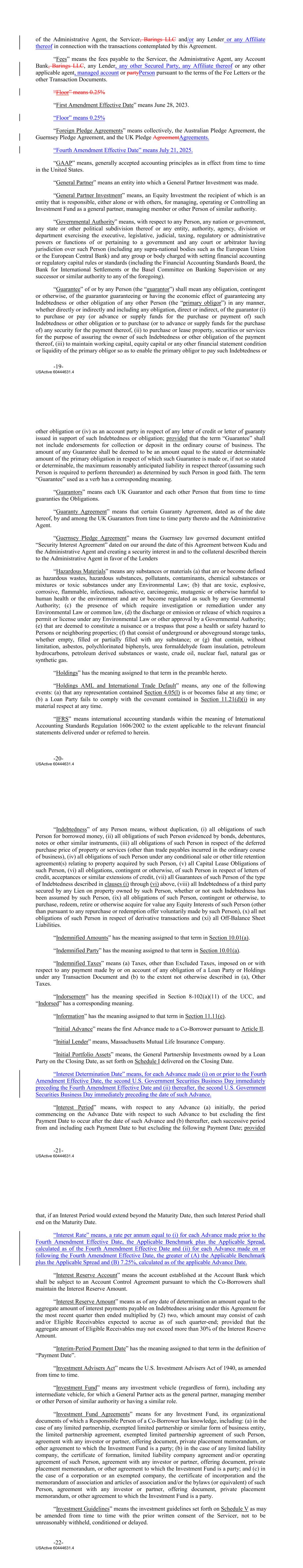of the Administrative Agent, the Servicer, Barings LLC and/or any Lender or any Affiliate thereof in connection with the transactions contemplated by this Agreement. “Fees” means the fees payable to the Servicer, the Administrative Agent, any Account Bank, Barings LLC, any Lender, any other Secured Party, any Affiliate thereof or any other applicable agent, managed account or partyPerson pursuant to the terms of the Fee Letters or the other Transaction Documents. “Floor” means 0.25% “First Amendment Effective Date” means June 28, 2023. “Floor” means 0.25% “Foreign Pledge Agreements” means collectively, the Australian Pledge Agreement, the Guernsey Pledge Agreement, and the UK Pledge AgreementAgreements. “Fourth Amendment Effective Date” means July 21, 2025. “GAAP” means, generally accepted accounting principles as in effect from time to time in the United States. “General Partner” means an entity into which a General Partner Investment was made. “General Partner Investment” means, an Equity Investment the recipient of which is an entity that is responsible, either alone or with others, for managing, operating or Controlling an Investment Fund as a general partner, managing member or other Person of similar authority. “Governmental Authority” means, with respect to any Person, any nation or government, any state or other political subdivision thereof or any entity, authority, agency, division or department exercising the executive, legislative, judicial, taxing, regulatory or administrative powers or functions of or pertaining to a government and any court or arbitrator having jurisdiction over such Person (including any supra‐national bodies such as the European Union or the European Central Bank) and any group or body charged with setting financial accounting or regulatory capital rules or standards (including the Financial Accounting Standards Board, the Bank for International Settlements or the Basel Committee on Banking Supervision or any successor or similar authority to any of the foregoing). “Guarantee” of or by any Person (the “guarantor”) shall mean any obligation, contingent or otherwise, of the guarantor guaranteeing or having the economic effect of guaranteeing any Indebtedness or other obligation of any other Person (the “primary obligor”) in any manner, whether directly or indirectly and including any obligation, direct or indirect, of the guarantor (i) to purchase or pay (or advance or supply funds for the purchase or payment of) such Indebtedness or other obligation or to purchase (or to advance or supply funds for the purchase of) any security for the payment thereof, (ii) to purchase or lease property, securities or services for the purpose of assuring the owner of such Indebtedness or other obligation of the payment thereof, (iii) to maintain working capital, equity capital or any other financial statement condition or liquidity of the primary obligor so as to enable the primary obligor to pay such Indebtedness or -19- USActive 60444631.4 other obligation or (iv) as an account party in respect of any letter of credit or letter of guaranty issued in support of such Indebtedness or obligation; provided that the term “Guarantee” shall not include endorsements for collection or deposit in the ordinary course of business. The amount of any Guarantee shall be deemed to be an amount equal to the stated or determinable amount of the primary obligation in respect of which such Guarantee is made or, if not so stated or determinable, the maximum reasonably anticipated liability in respect thereof (assuming such Person is required to perform thereunder) as determined by such Person in good faith. The term “Guarantee” used as a verb has a corresponding meaning. “Guarantors” means each UK Guarantor and each other Person that from time to time guaranties the Obligations. “Guaranty Agreement” means that certain Guaranty Agreement, dated as of the date hereof, by and among the UK Guarantors from time to time party thereto and the Administrative Agent. “Guernsey Pledge Agreement” means the Guernsey law governed document entitled “Security Interest Agreement” dated on our around the date of this Agreement between Kudu and the Administrative Agent and creating a security interest in and to the collateral described therein to the Administrative Agent in favor of the Lenders “Hazardous Materials” means any substances or materials (a) that are or become defined as hazardous wastes, hazardous substances, pollutants, contaminants, chemical substances or mixtures or toxic substances under any Environmental Law; (b) that are toxic, explosive, corrosive, flammable, infectious, radioactive, carcinogenic, mutagenic or otherwise harmful to human health or the environment and are or become regulated as such by any Governmental Authority; (c) the presence of which require investigation or remediation under any Environmental Law or common law, (d) the discharge or emission or release of which requires a permit or license under any Environmental Law or other approval by a Governmental Authority; (e) that are deemed to constitute a nuisance or a trespass that pose a health or safety hazard to Persons or neighboring properties; (f) that consist of underground or aboveground storage tanks, whether empty, filled or partially filled with any substance; or (g) that contain, without limitation, asbestos, polychlorinated biphenyls, urea formaldehyde foam insulation, petroleum hydrocarbons, petroleum derived substances or waste, crude oil, nuclear fuel, natural gas or synthetic gas. “Holdings” has the meaning assigned to that term in the preamble hereto. “Holdings AML and International Trade Default” means, any one of the following events: (a) that any representation contained Section 4.05(l) is or becomes false at any time; or (b) a Loan Party fails to comply with the covenant contained in Section 11.21(d)(i) in any materi