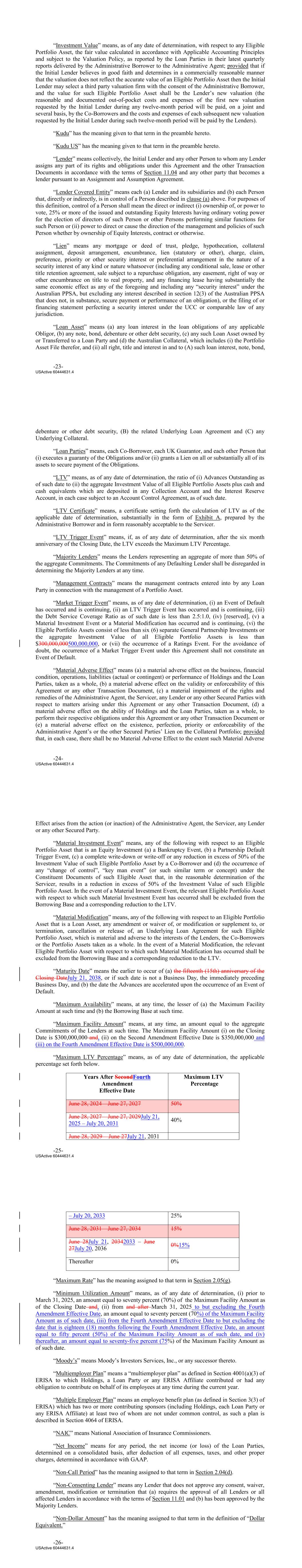 “Investment Value” means, as of any date of determination, with respect to any Eligible Portfolio Asset, the fair value calculated in accordance with Applicable Accounting Principles and subject to the Valuation Policy, as reported by the Loan Parties in their latest quarterly reports delivered by the Administrative Borrower to the Administrative Agent; provided that if the Initial Lender believes in good faith and determines in a commercially reasonable manner that the valuation does not reflect the accurate value of an Eligible Portfolio Asset then the Initial Lender may select a third party valuation firm with the consent of the Administrative Borrower, and the value for such Eligible Portfolio Asset shall be the Lender’s new valuation (the reasonable and documented out‐of‐pocket costs and expenses of the first new valuation requested by the Initial Lender during any twelve‐month period will be paid, on a joint and several basis, by the Co‐Borrowers and the costs and expenses of each subsequent new valuation requested by the Initial Lender during such twelve‐month period will be paid by the Lenders). “Kudu” has the meaning given to that term in the preamble hereto. “Kudu US” has the meaning given to that term in the preamble hereto. “Lender” means collectively, the Initial Lender and any other Person to whom any Lender assigns any part of its rights and obligations under this Agreement and the other Transaction Documents in accordance with the terms of Section 11.04 and any other party that becomes a lender pursuant to an Assignment and Assumption Agreement. “Lender Covered Entity” means each (a) Lender and its subsidiaries and (b) each Person that, directly or indirectly, is in control of a Person described in clause (a) above. For purposes of this definition, control of a Person shall mean the direct or indirect (i) ownership of, or power to vote, 25% or more of the issued and outstanding Equity Interests having ordinary voting power for the election of directors of such Person or other Persons performing similar functions for such Person or (ii) power to direct or cause the direction of the management and policies of such Person whether by ownership of Equity Interests, contract or otherwise. “Lien” means any mortgage or deed of trust, pledge, hypothecation, collateral assignment, deposit arrangement, encumbrance, lien (statutory or other), charge, claim, preference, priority or other security interest or preferential arrangement in the nature of a security interest of any kind or nature whatsoever (including any conditional sale, lease or other title retention agreement, sale subject to a repurchase obligation, any easement, right of way or other encumbrance on title to real property, and any financing lease having substantially the same economic effect as any of the foregoing and including any “security interest” under the Australian PPSA, but excluding any interest described in section 12(3) of the Australian PPSA that does not, in substance, secure payment or performance of an obligation), or the filing of or financing statement perfecting a security interest under the UCC or comparable law of any jurisdiction. “Loan Asset” means (a) any loan interest in the loan obligations of any applicable Obligor, (b) any note, bond, debenture or other debt security, (c) any such Loan Asset owned by or Transferred to a Loan Party and (d) the Australian Collateral, which includes (i) the Portfolio Asset File therefor, and (ii) all right, title and interest in and to (A) such loan interest, note, bond, -23- USActive 60444631.4 debenture or other debt security, (B) the related Underlying Loan Agreement and (C) any Underlying Collateral. “Loan Parties” means, each Co‐Borrower, each UK Guarantor, and each other Person that (i) executes a guaranty of the Obligations and/or (ii) grants a Lien on all or substantially all of its assets to secure payment of the Obligations. “LTV” means, as of any date of determination, the ratio of (i) Advances Outstanding as of such date to (ii) the aggregate Investment Value of all Eligible Portfolio Assets plus cash and cash equivalents which are deposited in any Collection Account and the Interest Reserve Account, in each case subject to an Account Control Agreement, as of such date. “LTV Certificate” means, a certificate setting forth the calculation of LTV as of the applicable date of determination, substantially in the form of Exhibit A, prepared by the Administrative Borrower and in form reasonably acceptable to the Servicer. “LTV Trigger Event” means, if, as of any date of determination, after the six month anniversary of the Closing Date, the LTV exceeds the Maximum LTV Percentage. “Majority Lenders” means the Lenders representing an aggregate of more than 50% of the aggregate Commitments. The Commitments of any Defaulting Lender shall be disregarded in determining the Majority Lenders at any time. “Management Contracts” means the management contracts entered into by any Loan Party in connection with the management of a Portfolio Asset. “Market Trigger Event” means, as of any date of determination, (i) an Event of Default has occurred and is continuing, (ii) an LTV Trigger Event has occurred and is continuing, (iii) the Debt Service Coverage Ratio as of such date is less than 2.5:1.0, (iv) [reserved], (v) a Material Investment Event or a Material Modification has occurred and is continuing, (vi) the Eligible Portfolio Assets consist of less than six (6) separate General Partnership Investments or the aggregate Investment Value of all Eligible Portfolio Assets is less than $300,000,000500,000,000, or (vii) the occurrence of a Ratings Event. For the avoidance of doubt, the occurrence of a Market Trigger Event under this Agreement shall not constitute an Event of Default. “Material Adverse Effect” means (a) a material adverse effect on the business, financial condition, operations, l