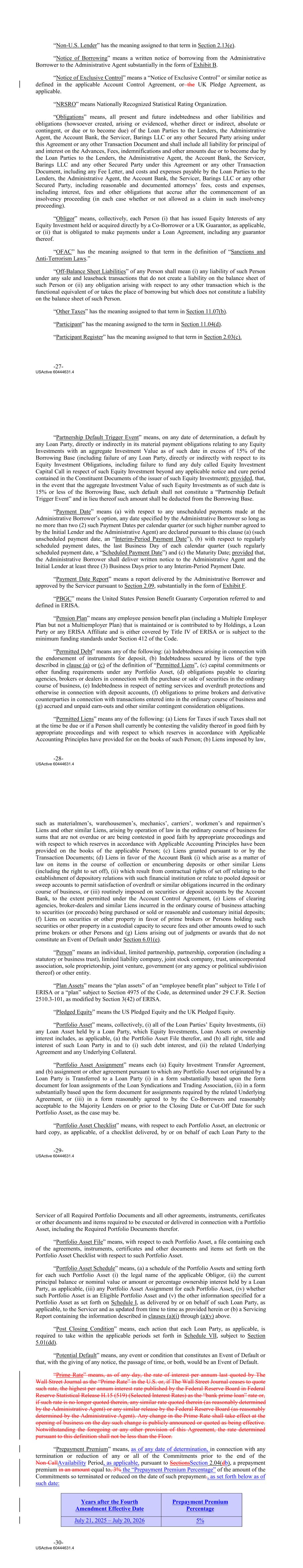 “Non‐U.S. Lender” has the meaning assigned to that term in Section 2.13(e). “Notice of Borrowing” means a written notice of borrowing from the Administrative Borrower to the Administrative Agent substantially in the form of Exhibit B. “Notice of Exclusive Control” means a “Notice of Exclusive Control” or similar notice as defined in the applicable Account Control Agreement, or the UK Pledge Agreement, as applicable. “NRSRO” means Nationally Recognized Statistical Rating Organization. “Obligations” means, all present and future indebtedness and other liabilities and obligations (howsoever created, arising or evidenced, whether direct or indirect, absolute or contingent, or due or to become due) of the Loan Parties to the Lenders, the Administrative Agent, the Account Bank, the Servicer, Barings LLC or any other Secured Party arising under this Agreement or any other Transaction Document and shall include all liability for principal of and interest on the Advances, Fees, indemnifications and other amounts due or to become due by the Loan Parties to the Lenders, the Administrative Agent, the Account Bank, the Servicer, Barings LLC and any other Secured Party under this Agreement or any other Transaction Document, including any Fee Letter, and costs and expenses payable by the Loan Parties to the Lenders, the Administrative Agent, the Account Bank, the Servicer, Barings LLC or any other Secured Party, including reasonable and documented attorneys’ fees, costs and expenses, including interest, fees and other obligations that accrue after the commencement of an insolvency proceeding (in each case whether or not allowed as a claim in such insolvency proceeding). “Obligor” means, collectively, each Person (i) that has issued Equity Interests of any Equity Investment held or acquired directly by a Co‐Borrower or a UK Guarantor, as applicable, or (ii) that is obligated to make payments under a Loan Agreement, including any guarantor thereof. “OFAC” has the meaning assigned to that term in the definition of “Sanctions and Anti‐Terrorism Laws.” “Off‐Balance Sheet Liabilities” of any Person shall mean (i) any liability of such Person under any sale and leaseback transactions that do not create a liability on the balance sheet of such Person or (ii) any obligation arising with respect to any other transaction which is the functional equivalent of or takes the place of borrowing but which does not constitute a liability on the balance sheet of such Person. “Other Taxes” has the meaning assigned to that term in Section 11.07(b). “Participant” has the meaning assigned to the term in Section 11.04(d). “Participant Register” has the meaning assigned to that term in Section 2.03(c). -27- USActive 60444631.4 “Partnership Default Trigger Event” means, on any date of determination, a default by any Loan Party, directly or indirectly in its material payment obligations relating to any Equity Investments with an aggregate Investment Value as of such date in excess of 15% of the Borrowing Base (including failure of any Loan Party, directly or indirectly with respect to its Equity Investment Obligations, including failure to fund any duly called Equity Investment Capital Call in respect of such Equity Investment beyond any applicable notice and cure period contained in the Constituent Documents of the issuer of such Equity Investment); provided, that, in the event that the aggregate Investment Value of such Equity Investments as of such date is 15% or less of the Borrowing Base, such default shall not constitute a “Partnership Default Trigger Event” and in lieu thereof such amount shall be deducted from the Borrowing Base. “Payment Date” means (a) with respect to any unscheduled payments made at the Administrative Borrower’s option, any date specified by the Administrative Borrower so long as no more than two (2) such Payment Dates per calendar quarter (or such higher number agreed to by the Initial Lender and the Administrative Agent) are declared pursuant to this clause (a) (such unscheduled payment date, an “Interim-Period Payment Date”), (b) with respect to regularly scheduled payment dates, the last Business Day of each calendar quarter (such regularly scheduled payment date, a “Scheduled Payment Date”) and (c) the Maturity Date; provided that, the Administrative Borrower shall deliver written notice to the Administrative Agent and the Initial Lender at least three (3) Business Days prior to any Interim-Period Payment Date. “Payment Date Report” means a report delivered by the Administrative Borrower and approved by the Servicer pursuant to Section 2.09, substantially in the form of Exhibit F. “PBGC” means the United States Pension Benefit Guaranty Corporation referred to and defined in ERISA. “Pension Plan” means any employee pension benefit plan (including a Multiple Employer Plan but not a Multiemployer Plan) that is maintained or is contributed to by Holdings, a Loan Party or any ERISA Affiliate and is either covered by Title IV of ERISA or is subject to the minimum funding standards under Section 412 of the Code. “Permitted Debt” means any of the following: (a) Indebtedness arising in connection with the endorsement of instruments for deposit, (b) Indebtedness secured by liens of the type described in clause (a) or (c) of the definition of “Permitted Liens”, (c) capital commitments or other funding requirements under any Portfolio Asset, (d) obligations payable to clearing agencies, brokers or dealers in connection with the purchase or sale of securities in the ordinary course of business, (e) Indebtedness in respect of netting services and overdraft protections and otherwise in connection with deposit accounts, (f) obligations to prime brokers and derivative counterparties in connection with transactions entered into in the ordinary course of business and (g) accrued and unpaid earn‐outs and other s