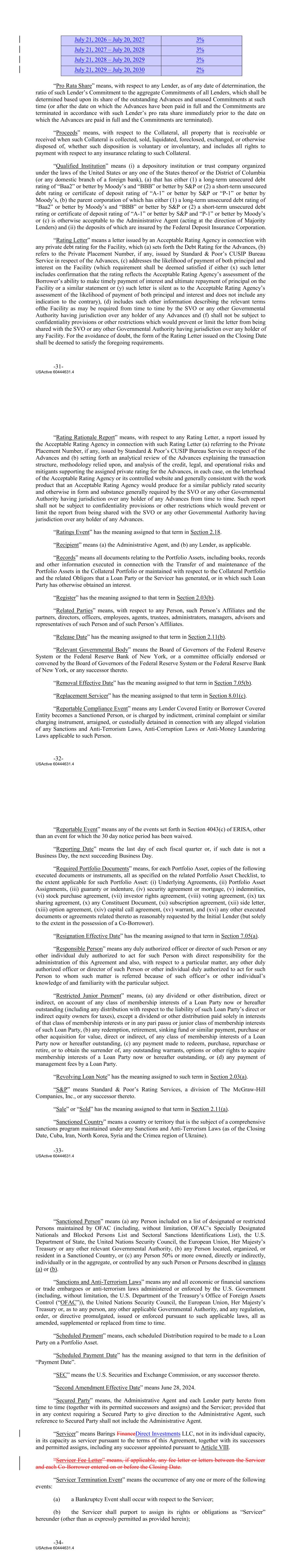 -31- USActive 60444631.4 3% July 21, 2028 – July 20, 2029 3% July 21, 2029 – July 20, 2030 July 21, 2027 – July 20, 2028 2% July 21, 2026 – July 20, 2027 “Pro Rata Share” means, with respect to any Lender, as of any date of determination, the ratio of such Lender’s Commitment to the aggregate Commitments of all Lenders, which shall be determined based upon its share of the outstanding Advances and unused Commitments at such time (or after the date on which the Advances have been paid in full and the Commitments are terminated in accordance with such Lender’s pro rata share immediately prior to the date on which the Advances are paid in full and the Commitments are terminated). “Proceeds” means, with respect to the Collateral, all property that is receivable or received when such Collateral is collected, sold, liquidated, foreclosed, exchanged, or otherwise disposed of, whether such disposition is voluntary or involuntary, and includes all rights to payment with respect to any insurance relating to such Collateral. “Qualified Institution” means (i) a depository institution or trust company organized under the laws of the United States or any one of the States thereof or the District of Columbia (or any domestic branch of a foreign bank), (a) that has either (1) a long‐term unsecured debt rating of “Baa2” or better by Moody’s and “BBB” or better by S&P or (2) a short‐term unsecured debt rating or certificate of deposit rating of “A‐1” or better by S&P or “P‐1” or better by Moody’s, (b) the parent corporation of which has either (1) a long‐term unsecured debt rating of “Baa2” or better by Moody’s and “BBB” or better by S&P or (2) a short‐term unsecured debt rating or certificate of deposit rating of “A‐1” or better by S&P and “P‐1” or better by Moody’s or (c) is otherwise acceptable to the Administrative Agent (acting at the direction of Majority Lenders) and (ii) the deposits of which are insured by the Federal Deposit Insurance Corporation. “Rating Letter” means a letter issued by an Acceptable Rating Agency in connection with any private debt rating for the Facility, which (a) sets forth the Debt Rating for the Advances, (b) refers to the Private Placement Number, if any, issued by Standard & Poor’s CUSIP Bureau Service in respect of the Advances, (c) addresses the likelihood of payment of both principal and interest on the Facility (which requirement shall be deemed satisfied if either (x) such letter includes confirmation that the rating reflects the Acceptable Rating Agency’s assessment of the Borrower’s ability to make timely payment of interest and ultimate repayment of principal on the Facility or a similar statement or (y) such letter is silent as to the Acceptable Rating Agency’s assessment of the likelihood of payment of both principal and interest and does not include any indication to the contrary), (d) includes such other information describing the relevant terms ofthe Facility as may be required from time to time by the SVO or any other Governmental Authority having jurisdiction over any holder of any Advances and (f) shall not be subject to confidentiality provisions or other restrictions which would prevent or limit the letter from being shared with the SVO or any other Governmental Authority having jurisdiction over any holder of any Facility. For the avoidance of doubt, the form of the Rating Letter issued on the Closing Date shall be deemed to satisfy the foregoing requirements. 3% “Rating Rationale Report” means, with respect to any Rating Letter, a report issued by the Acceptable Rating Agency in connection with such Rating Letter (a) referring to the Private Placement Number, if any, issued by Standard & Poor’s CUSIP Bureau Service in respect of the Advances and (b) setting forth an analytical review of the Advances explaining the transaction structure, methodology relied upon, and analysis of the credit, legal, and operational risks and mitigants supporting the assigned private rating for the Advances, in each case, on the letterhead of the Acceptable Rating Agency or its controlled website and generally consistent with the work product that an Acceptable Rating Agency would produce for a similar publicly rated security and otherwise in form and substance generally required by the SVO or any other Governmental Authority having jurisdiction over any holder of any Advances from time to time. Such report shall not be subject to confidentiality provisions or other restrictions which would prevent or limit the report from being shared with the SVO or any other Governmental Authority having jurisdiction over any holder of any Advances. “Ratings Event” has the meaning assigned to that term in Section 2.18. “Recipient” means (a) the Administrative Agent, and (b) any Lender, as applicable. “Records” means all documents relating to the Portfolio Assets, including books, records and other information executed in connection with the Transfer of and maintenance of the Portfolio Assets in the Collateral Portfolio or maintained with respect to the Collateral Portfolio and the related Obligors that a Loan Party or the Servicer has generated, or in which such Loan Party has otherwise obtained an interest. “Register” has the meaning assigned to that term in Section 2.03(b). “Related Parties” means, with respect to any Person, such Person’s Affiliates and the partners, directors, officers, employees, agents, trustees, administrators, managers, advisors and representatives of such Person and of such Person’s Affiliates. “Release Date” has the meaning assigned to that term in Section 2.11(b). “Relevant Governmental Body” means the Board of Governors of the Federal Reserve System or the Federal Reserve Bank of New York, or a committee officially endorsed or convened by the Board of Governors of the Federal Reserve System or the Federal Reserve Bank of New York
