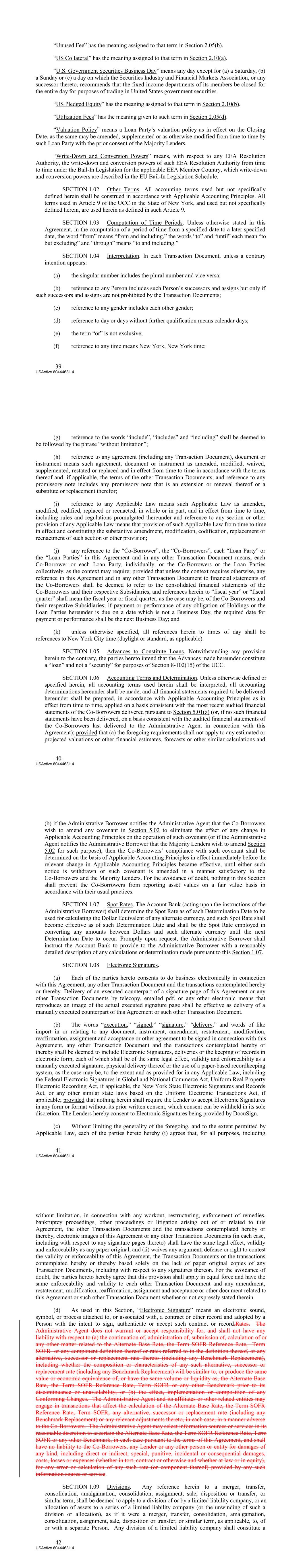 “Unused Fee” has the meaning assigned to that term in Section 2.05(b). “US Collateral” has the meaning assigned to that term in Section 2.10(a). “U.S. Government Securities Business Day” means any day except for (a) a Saturday, (b) a Sunday or (c) a day on which the Securities Industry and Financial Markets Association, or any successor thereto, recommends that the fixed income departments of its members be closed for the entire day for purposes of trading in United States government securities. “US Pledged Equity” has the meaning assigned to that term in Section 2.10(b). “Utilization Fees” has the meaning given to such term in Section 2.05(d). “Valuation Policy” means a Loan Party’s valuation policy as in effect on the Closing Date, as the same may be amended, supplemented or as otherwise modified from time to time by such Loan Party with the prior consent of the Majority Lenders. “Write‐Down and Conversion Powers” means, with respect to any EEA Resolution Authority, the write‐down and conversion powers of such EEA Resolution Authority from time to time under the Bail‐In Legislation for the applicable EEA Member Country, which write‐down and conversion powers are described in the EU Bail‐In Legislation Schedule. SECTION 1.02 Other Terms. All accounting terms used but not specifically defined herein shall be construed in accordance with Applicable Accounting Principles. All terms used in Article 9 of the UCC in the State of New York, and used but not specifically defined herein, are used herein as defined in such Article 9. SECTION 1.03 Computation of Time Periods. Unless otherwise stated in this Agreement, in the computation of a period of time from a specified date to a later specified date, the word “from” means “from and including,” the words “to” and “until” each mean “to but excluding” and “through” means “to and including.” SECTION 1.04 Interpretation. In each Transaction Document, unless a contrary intention appears: (a) the singular number includes the plural number and vice versa; (b) reference to any Person includes such Person’s successors and assigns but only if such successors and assigns are not prohibited by the Transaction Documents; (c) reference to any gender includes each other gender; (d) reference to day or days without further qualification means calendar days; (e) the term “or” is not exclusive; (f) reference to any time means New York, New York time; -39- USActive 60444631.4 (g) reference to the words “include”, “includes” and “including” shall be deemed to be followed by the phrase “without limitation”; (h) reference to any agreement (including any Transaction Document), document or instrument means such agreement, document or instrument as amended, modified, waived, supplemented, restated or replaced and in effect from time to time in accordance with the terms thereof and, if applicable, the terms of the other Transaction Documents, and reference to any promissory note includes any promissory note that is an extension or renewal thereof or a substitute or replacement therefor; (i) reference to any Applicable Law means such Applicable Law as amended, modified, codified, replaced or reenacted, in whole or in part, and in effect from time to time, including rules and regulations promulgated thereunder and reference to any section or other provision of any Applicable Law means that provision of such Applicable Law from time to time in effect and constituting the substantive amendment, modification, codification, replacement or reenactment of such section or other provision; (j) any reference to the “Co‐Borrower”, the “Co‐Borrowers”, each “Loan Party” or the “Loan Parties” in this Agreement and in any other Transaction Document means, each Co‐Borrower or each Loan Party, individually, or the Co‐Borrowers or the Loan Parties collectively, as the context may require; provided that unless the context requires otherwise, any reference in this Agreement and in any other Transaction Document to financial statements of the Co‐Borrowers shall be deemed to refer to the consolidated financial statements of the Co‐Borrowers and their respective Subsidiaries, and references herein to “fiscal year” or “fiscal quarter” shall mean the fiscal year or fiscal quarter, as the case may be, of the Co‐Borrowers and their respective Subsidiaries; if payment or performance of any obligation of Holdings or the Loan Parties hereunder is due on a date which is not a Business Day, the required date for payment or performance shall be the next Business Day; and (k) unless otherwise specified, all references herein to times of day shall be references to New York City time (daylight or standard, as applicable). SECTION 1.05 Advances to Constitute Loans. Notwithstanding any provision herein to the contrary, the parties hereto intend that the Advances made hereunder constitute a “loan” and not a “security” for purposes of Section 8‐102(15) of the UCC. SECTION 1.06 Accounting Terms and Determination. Unless otherwise defined or specified herein, all accounting terms used herein shall be interpreted, all accounting determinations hereunder shall be made, and all financial statements required to be delivered hereunder shall be prepared, in accordance with Applicable Accounting Principles as in effect from time to time, applied on a basis consistent with the most recent audited financial statements of the Co‐Borrowers delivered pursuant to Section 5.01(z) (or, if no such financial statements have been delivered, on a basis consistent with the audited financial statements of the Co‐Borrowers last delivered to the Administrative Agent in connection with this Agreement); provided that (a) the foregoing requirements shall not apply to any estimated or projected valuations or other financial estimates, forecasts or other similar calculations and -40- USActive 60444631