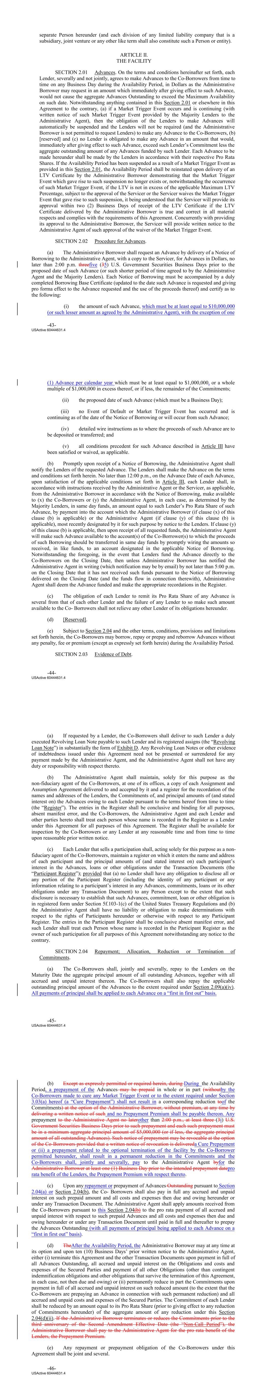 separate Person hereunder (and each division of any limited liability company that is a subsidiary, joint venture or any other like term shall also constitute such a Person or entity). ARTICLE II. THE FACILITY SECTION 2.01 Advances. On the terms and conditions hereinafter set forth, each Lender, severally and not jointly, agrees to make Advances to the Co‐Borrowers from time to time on any Business Day during the Availability Period, in Dollars as the Administrative Borrower may request in an amount which immediately after giving effect to such Advance, would not cause the aggregate Advances Outstanding to exceed the Maximum Availability on such date. Notwithstanding anything contained in this Section 2.01 or elsewhere in this Agreement to the contrary, (a) if a Market Trigger Event occurs and is continuing (with written notice of such Market Trigger Event provided by the Majority Lenders to the Administrative Agent), then the obligation of the Lenders to make Advances will automatically be suspended and the Lenders will not be required (and the Administrative Borrower is not permitted to request Lenders) to make any Advance to the Co‐Borrowers, (b) [reserved] and (c) no Lender is obligated to make any Advance in an amount that would, immediately after giving effect to such Advance, exceed such Lender’s Commitment less the aggregate outstanding amount of any Advances funded by such Lender. Each Advance to be made hereunder shall be made by the Lenders in accordance with their respective Pro Rata Shares. If the Availability Period has been suspended as a result of a Market Trigger Event as provided in this Section 2.01, the Availability Period shall be reinstated upon delivery of an LTV Certificate by the Administrative Borrower demonstrating that the Market Trigger Event which gave rise to such suspension no longer exists or, notwithstanding the occurrence of such Market Trigger Event, if the LTV is not in excess of the applicable Maximum LTV Percentage, subject to the approval of the Servicer or the Servicer waives the Market Trigger Event that gave rise to such suspension, it being understood that the Servicer will provide its approval within two (2) Business Days of receipt of the LTV Certificate if the LTV Certificate delivered by the Administrative Borrower is true and correct in all material respects and complies with the requirements of this Agreement. Concurrently with providing its approval to the Administrative Borrower, the Servicer will provide written notice to the Administrative Agent of such approval of the waiver of the Market Trigger Event. SECTION 2.02 Procedure for Advances. (a) The Administrative Borrower shall request an Advance by delivery of a Notice of Borrowing to the Administrative Agent, with a copy to the Servicer, for Advances in Dollars, no later than 2:00 p.m. threefive (35) U.S. Government Securities Business Days prior to the proposed date of such Advance (or such shorter period of time agreed to by the Administrative Agent and the Majority Lenders). Each Notice of Borrowing must be accompanied by a duly completed Borrowing Base Certificate (updated to the date such Advance is requested and giving pro forma effect to the Advance requested and the use of the proceeds thereof) and certify as to the following: (i) the amount of such Advance, which must be at least equal to $10,000,000 (or such lesser amount as agreed by the Administrative Agent), with the exception of one -43- USActive 60444631.4 (1) Advance per calendar year which must be at least equal to $1,000,000, or a whole multiple of $1,000,000 in excess thereof, or if less, the remainder of the Commitments; (ii) the proposed date of such Advance (which must be a Business Day); (iii) no Event of Default or Market Trigger Event has occurred and is continuing as of the date of the Notice of Borrowing or will occur from such Advance; (iv) detailed wire instructions as to where the proceeds of such Advance are to be deposited or transferred; and (v) all conditions precedent for such Advance described in Article III have been satisfied or waived, as applicable. (b) Promptly upon receipt of a Notice of Borrowing, the Administrative Agent shall notify the Lenders of the requested Advance. The Lenders shall make the Advance on the terms and conditions set forth herein. No later than 12:00 p.m., on the Advance Date of each Advance, upon satisfaction of the applicable conditions set forth in Article III, each Lender shall, in accordance with instructions received by the Administrative Agent or the Servicer, as applicable, from the Administrative Borrower in accordance with the Notice of Borrowing, make available to (x) the Co‐Borrowers or (y) the Administrative Agent, in each case, as determined by the Majority Lenders, in same day funds, an amount equal to such Lender’s Pro Rata Share of such Advance, by payment into the account which the Administrative Borrower (if clause (x) of this clause (b) is applicable) or the Administrative Agent (if clause (y) of this clause (b) is applicable), most recently designated by it for such purpose by notice to the Lenders. If clause (y) of this clause (b) is applicable, then upon receipt of all requested funds, the Administrative Agent will make such Advance available to the account(s) of the Co‐Borrower(s) to which the proceeds of such Borrowing should be transferred in same day funds by promptly wiring the amounts so received, in like funds, to an account designated in the applicable Notice of Borrowing. Notwithstanding the foregoing, in the event that Lenders fund the Advance directly to the Co‐Borrowers on the Closing Date, then unless Administrative Borrower has notified the Administrative Agent in writing (which notification may be by email) by not later than 5:00 p.m. on the Closing Date that it has not received such funds pursuant to the Notice of Borrowing delivered on the Closing Date (and the funds flow in connection therewith), Administrative Agen