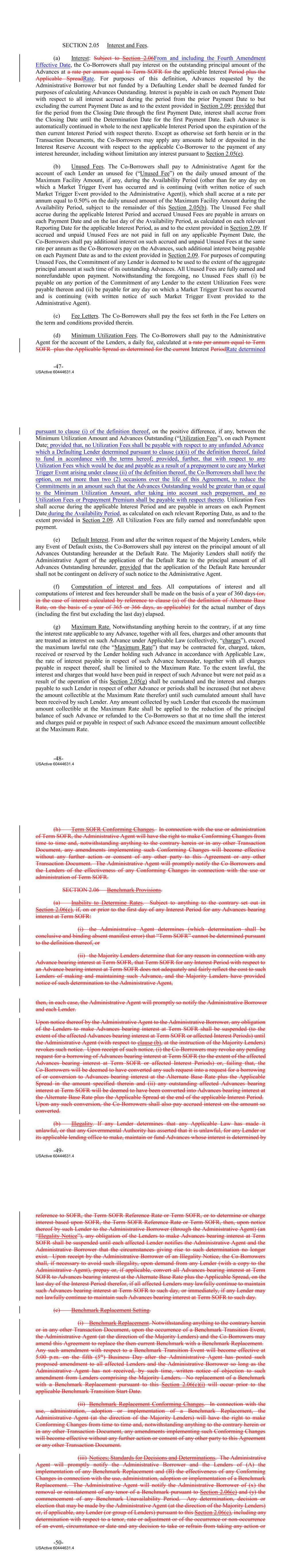 SECTION 2.05 Interest and Fees. (a) Interest: Subject to Section 2.06From and including the Fourth Amendment Effective Date, the Co‐Borrowers shall pay interest on the outstanding principal amount of the Advances at a rate per annum equal to Term SOFR for the applicable Interest Period plus the Applicable SpreadRate. For purposes of this definition, Advances requested by the Administrative Borrower but not funded by a Defaulting Lender shall be deemed funded for purposes of calculating Advances Outstanding. Interest is payable in cash on each Payment Date with respect to all interest accrued during the period from the prior Payment Date to but excluding the current Payment Date as and to the extent provided in Section 2.09; provided that for the period from the Closing Date through the first Payment Date, interest shall accrue from the Closing Date until the Determination Date for the first Payment Date. Each Advance is automatically continued in whole to the next applicable Interest Period upon the expiration of the then current Interest Period with respect thereto. Except as otherwise set forth herein or in the Transaction Documents, the Co‐Borrowers may apply any amounts held or deposited in the Interest Reserve Account with respect to the applicable Co‐Borrower to the payment of any interest hereunder, including without limitation any interest pursuant to Section 2.05(e). (b) Unused Fees. The Co-Borrowers shall pay to Administrative Agent for the account of each Lender an unused fee (“Unused Fee”) on the daily unused amount of the Maximum Facility Amount, if any, during the Availability Period (other than for any day on which a Market Trigger Event has occurred and is continuing (with written notice of such Market Trigger Event provided to the Administrative Agent)), which shall accrue at a rate per annum equal to 0.50% on the daily unused amount of the Maximum Facility Amount during the Availability Period, subject to the remainder of this Section 2.05(b). The Unused Fee shall accrue during the applicable Interest Period and accrued Unused Fees are payable in arrears on each Payment Date and on the last day of the Availability Period, as calculated on each relevant Reporting Date for the applicable Interest Period, as and to the extent provided in Section 2.09. If accrued and unpaid Unused Fees are not paid in full on any applicable Payment Date, the Co-Borrowers shall pay additional interest on such accrued and unpaid Unused Fees at the same rate per annum as the Co-Borrowers pay on the Advances, such additional interest being payable on each Payment Date as and to the extent provided in Section 2.09. For purposes of computing Unused Fees, the Commitment of any Lender is deemed to be used to the extent of the aggregate principal amount at such time of its outstanding Advances. All Unused Fees are fully earned and nonrefundable upon payment. Notwithstanding the foregoing, no Unused Fees shall (i) be payable on any portion of the Commitment of any Lender to the extent Utilization Fees were payable thereon and (ii) be payable for any day on which a Market Trigger Event has occurred and is continuing (with written notice of such Market Trigger Event provided to the Administrative Agent). (c) Fee Letters. The Co‐Borrowers shall pay the fees set forth in the Fee Letters on the term and conditions provided therein. (d) Minimum Utilization Fees. The Co-Borrowers shall pay to the Administrative Agent for the account of the Lenders, a daily fee, calculated at a rate per annum equal to Term SOFR plus the Applicable Spread as determined for the current Interest PeriodRate determined -47- USActive 60444631.4 pursuant to clause (i) of the definition thereof, on the positive difference, if any, between the Minimum Utilization Amount and Advances Outstanding (“Utilization Fees”), on each Payment Date; provided that, no Utilization Fees shall be payable with respect to any unfunded Advance which a Defaulting Lender determined pursuant to clause (a)(ii) of the definition thereof, failed to fund in accordance with the terms hereof; provided, further, that with respect to any Utilization Fees which would be due and payable as a result of a prepayment to cure any Market Trigger Event arising under clause (ii) of the definition thereof, the Co-Borrowers shall have the option, on not more than two (2) occasions over the life of this Agreement, to reduce the Commitments in an amount such that the Advances Outstanding would be greater than or equal to the Minimum Utilization Amount, after taking into account such prepayment, and no Utilization Fees or Prepayment Premium shall be payable with respect thereto. Utilization Fees shall accrue during the applicable Interest Period and are payable in arrears on each Payment Date during the Availability Period, as calculated on each relevant Reporting Date, as and to the extent provided in Section 2.09. All Utilization Fees are fully earned and nonrefundable upon payment. (e) Default Interest. From and after the written request of the Majority Lenders, while any Event of Default exists, the Co‐Borrowers shall pay interest on the principal amount of all Advances Outstanding hereunder at the Default Rate. The Majority Lenders shall notify the Administrative Agent of the application of the Default Rate to the principal amount of all Advances Outstanding hereunder, provided that the application of the Default Rate hereunder shall not be contingent on delivery of such notice to the Administrative Agent. (f) Computation of interest and fees. All computations of interest and all computations of interest and fees hereunder shall be made on the basis of a year of 360 days (or, in the case of interest calculated by reference to clause (a) of the definition of Alternate Base Rate, on the basis of a year of 365 or 366 days, as applicable) for the actual number of days (including the first but excluding the last day) elapsed. (g) Maximum Rate. Notwithstanding