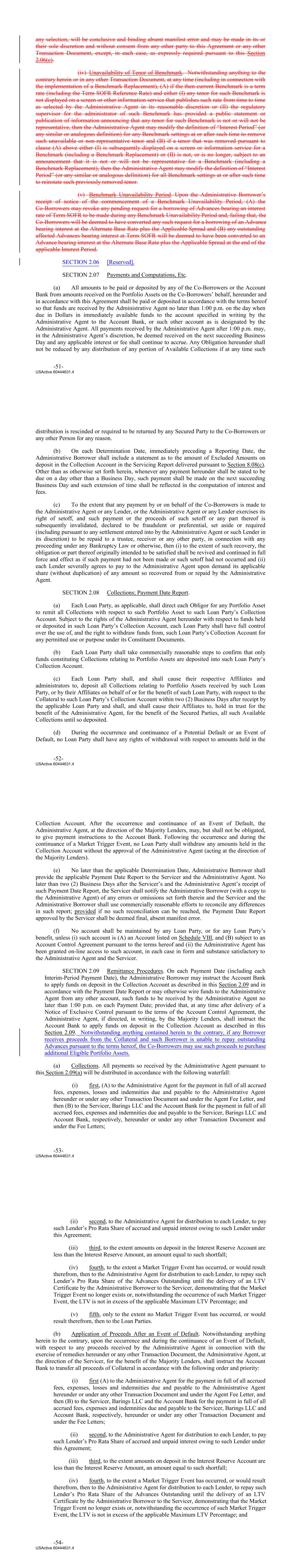 any selection, will be conclusive and binding absent manifest error and may be made in its or their sole discretion and without consent from any other party to this Agreement or any other Transaction Document, except, in each case, as expressly required pursuant to this Section 2.06(c). (iv) Unavailability of Tenor of Benchmark. Notwithstanding anything to the contrary herein or in any other Transaction Document, at any time (including in connection with the implementation of a Benchmark Replacement), (A) if the then-current Benchmark is a term rate (including the Term SOFR Reference Rate) and either (I) any tenor for such Benchmark is not displayed on a screen or other information service that publishes such rate from time to time as selected by the Administrative Agent in its reasonable discretion or (II) the regulatory supervisor for the administrator of such Benchmark has provided a public statement or publication of information announcing that any tenor for such Benchmark is not or will not be representative, then the Administrative Agent may modify the definition of “Interest Period” (or any similar or analogous definition) for any Benchmark settings at or after such time to remove such unavailable or non-representative tenor and (B) if a tenor that was removed pursuant to clause (A) above either (I) is subsequently displayed on a screen or information service for a Benchmark (including a Benchmark Replacement) or (II) is not, or is no longer, subject to an announcement that it is not or will not be representative for a Benchmark (including a Benchmark Replacement), then the Administrative Agent may modify the definition of “Interest Period” (or any similar or analogous definition) for all Benchmark settings at or after such time to reinstate such previously removed tenor. (v) Benchmark Unavailability Period. Upon the Administrative Borrower’s receipt of notice of the commencement of a Benchmark Unavailability Period, (A) the Co-Borrowers may revoke any pending request for a borrowing of Advances bearing an interest rate of Term SOFR to be made during any Benchmark Unavailability Period and, failing that, the Co-Borrowers will be deemed to have converted any such request for a borrowing of an Advance bearing interest at the Alternate Base Rate plus the Applicable Spread and (B) any outstanding affected Advances bearing interest at Term SOFR will be deemed to have been converted to an Advance bearing interest at the Alternate Base Rate plus the Applicable Spread at the end of the applicable Interest Period. SECTION 2.06 [Reserved]. SECTION 2.07 Payments and Computations, Etc. (a) All amounts to be paid or deposited by any of the Co‐Borrowers or the Account Bank from amounts received on the Portfolio Assets on the Co‐Borrowers’ behalf, hereunder and in accordance with this Agreement shall be paid or deposited in accordance with the terms hereof so that funds are received by the Administrative Agent no later than 1:00 p.m. on the day when due in Dollars in immediately available funds to the account specified in writing by the Administrative Agent to the Account Bank, or such other account as is designated by the Administrative Agent. All payments received by the Administrative Agent after 1:00 p.m. may, in the Administrative Agent’s discretion, be deemed received on the next succeeding Business Day and any applicable interest or fee shall continue to accrue. Any Obligation hereunder shall not be reduced by any distribution of any portion of Available Collections if at any time such -51- USActive 60444631.4 distribution is rescinded or required to be returned by any Secured Party to the Co‐Borrowers or any other Person for any reason. (b) On each Determination Date, immediately preceding a Reporting Date, the Administrative Borrower shall include a statement as to the amount of Excluded Amounts on deposit in the Collection Account in the Servicing Report delivered pursuant to Section 8.08(c). Other than as otherwise set forth herein, whenever any payment hereunder shall be stated to be due on a day other than a Business Day, such payment shall be made on the next succeeding Business Day and such extension of time shall be reflected in the computation of interest and fees. (c) To the extent that any payment by or on behalf of the Co‐Borrowers is made to the Administrative Agent or any Lender, or the Administrative Agent or any Lender exercises its right of setoff, and such payment or the proceeds of such setoff or any part thereof is subsequently invalidated, declared to be fraudulent or preferential, set aside or required (including pursuant to any settlement entered into by the Administrative Agent or such Lender in its discretion) to be repaid to a trustee, receiver or any other party, in connection with any proceeding under any Bankruptcy Law or otherwise, then (i) to the extent of such recovery, the obligation or part thereof originally intended to be satisfied shall be revived and continued in full force and effect as if such payment had not been made or such setoff had not occurred and (ii) each Lender severally agrees to pay to the Administrative Agent upon demand its applicable share (without duplication) of any amount so recovered from or repaid by the Administrative Agent. SECTION 2.08 Collections; Payment Date Report. (a) Each Loan Party, as applicable, shall direct each Obligor for any Portfolio Asset to remit all Collections with respect to such Portfolio Asset to such Loan Party’s Collection Account. Subject to the rights of the Administrative Agent hereunder with respect to funds held or deposited in such Loan Party’s Collection Account, each Loan Party shall have full control over the use of, and the right to withdraw funds from, such Loan Party’s Collection Account for any permitted use or purpose under its Constituent Documents. (b) Each Loan Party shall take commercially reasonable steps to confirm that only funds constituting Collections 