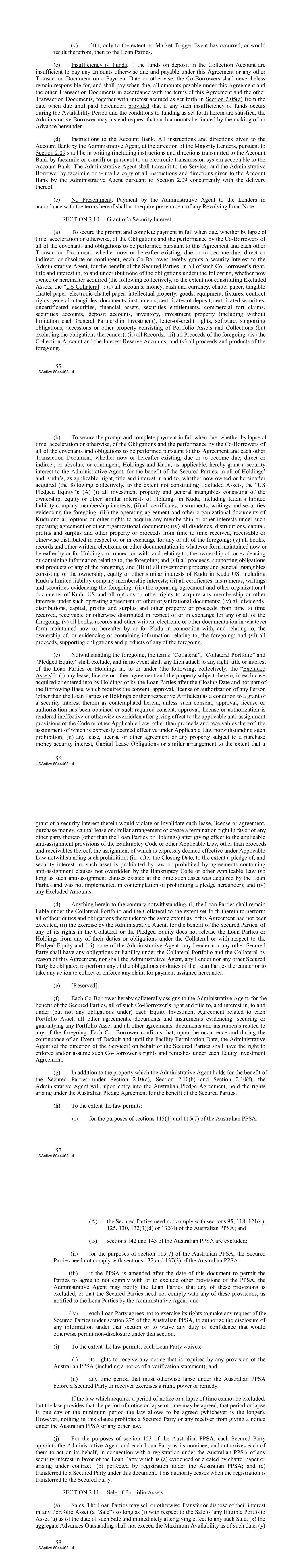 (v) fifth, only to the extent no Market Trigger Event has occurred, or would result therefrom, then to the Loan Parties. (c) Insufficiency of Funds. If the funds on deposit in the Collection Account are insufficient to pay any amounts otherwise due and payable under this Agreement or any other Transaction Document on a Payment Date or otherwise, the Co‐Borrowers shall nevertheless remain responsible for, and shall pay when due, all amounts payable under this Agreement and the other Transaction Documents in accordance with the terms of this Agreement and the other Transaction Documents, together with interest accrued as set forth in Section 2.05(a) from the date when due until paid hereunder; provided that if any such insufficiency of funds occurs during the Availability Period and the conditions to funding as set forth herein are satisfied, the Administrative Borrower may instead request that such amounts be funded by the making of an Advance hereunder. (d) Instructions to the Account Bank. All instructions and directions given to the Account Bank by the Administrative Agent, at the direction of the Majority Lenders, pursuant to Section 2.09 shall be in writing (including instructions and directions transmitted to the Account Bank by facsimile or e‐mail) or pursuant to an electronic transmission system acceptable to the Account Bank. The Administrative Agent shall transmit to the Servicer and the Administrative Borrower by facsimile or e‐ mail a copy of all instructions and directions given to the Account Bank by the Administrative Agent pursuant to Section 2.09 concurrently with the delivery thereof. (e) No Presentment. Payment by the Administrative Agent to the Lenders in accordance with the terms hereof shall not require presentment of any Revolving Loan Note. SECTION 2.10 Grant of a Security Interest. (a) To secure the prompt and complete payment in full when due, whether by lapse of time, acceleration or otherwise, of the Obligations and the performance by the Co‐Borrowers of all of the covenants and obligations to be performed pursuant to this Agreement and each other Transaction Document, whether now or hereafter existing, due or to become due, direct or indirect, or absolute or contingent, each Co‐Borrower hereby grants a security interest to the Administrative Agent, for the benefit of the Secured Parties, in all of such Co‐Borrower’s right, title and interest in, to and under (but none of the obligations under) the following, whether now owned or hereinafter acquired (the following collectively, to the extent not constituting Excluded Assets, the “US Collateral”): (i) all accounts, money, cash and currency, chattel paper, tangible chattel paper, electronic chattel paper, intellectual property, goods, equipment, fixtures, contract rights, general intangibles, documents, instruments, certificates of deposit, certificated securities, uncertificated securities, financial assets, securities entitlements, commercial tort claims, securities accounts, deposit accounts, inventory, investment property (including without limitation each General Partnership Investment), letter‐of‐credit rights, software, supporting obligations, accessions or other property consisting of Portfolio Assets and Collections (but excluding the obligations thereunder); (ii) all Records; (iii) all Proceeds of the foregoing; (iv) the Collection Account and the Interest Reserve Accounts; and (v) all proceeds and products of the foregoing. -55- USActive 60444631.4 (b) To secure the prompt and complete payment in full when due, whether by lapse of time, acceleration or otherwise, of the Obligations and the performance by the Co‐Borrowers of all of the covenants and obligations to be performed pursuant to this Agreement and each other Transaction Document, whether now or hereafter existing, due or to become due, direct or indirect, or absolute or contingent, Holdings and Kudu, as applicable, hereby grant a security interest to the Administrative Agent, for the benefit of the Secured Parties, in all of Holdings’ and Kudu’s, as applicable, right, title and interest in and to, whether now owned or hereinafter acquired (the following collectively, to the extent not constituting Excluded Assets, the “US Pledged Equity”): (A) (i) all investment property and general intangibles consisting of the ownership, equity or other similar interests of Holdings in Kudu, including Kudu’s limited liability company membership interests; (ii) all certificates, instruments, writings and securities evidencing the foregoing; (iii) the operating agreement and other organizational documents of Kudu and all options or other rights to acquire any membership or other interests under such operating agreement or other organizational documents; (iv) all dividends, distributions, capital, profits and surplus and other property or proceeds from time to time received, receivable or otherwise distributed in respect of or in exchange for any or all of the foregoing; (v) all books, records and other written, electronic or other documentation in whatever form maintained now or hereafter by or for Holdings in connection with, and relating to, the ownership of, or evidencing or containing information relating to, the foregoing; and (vi) all proceeds, supporting obligations and products of any of the foregoing, and (B) (i) all investment property and general intangibles consisting of the ownership, equity or other similar interests of Kudu in Kudu US, including Kudu’s limited liability company membership interests; (ii) all certificates, instruments, writings and securities evidencing the foregoing; (iii) the operating agreement and other organizational documents of Kudu US and all options or other rights to acquire any membership or other interests under such operating agreement or other organizational documents; (iv) all dividends, distributions, capital, profits and surplus and other property or proceeds from time to time