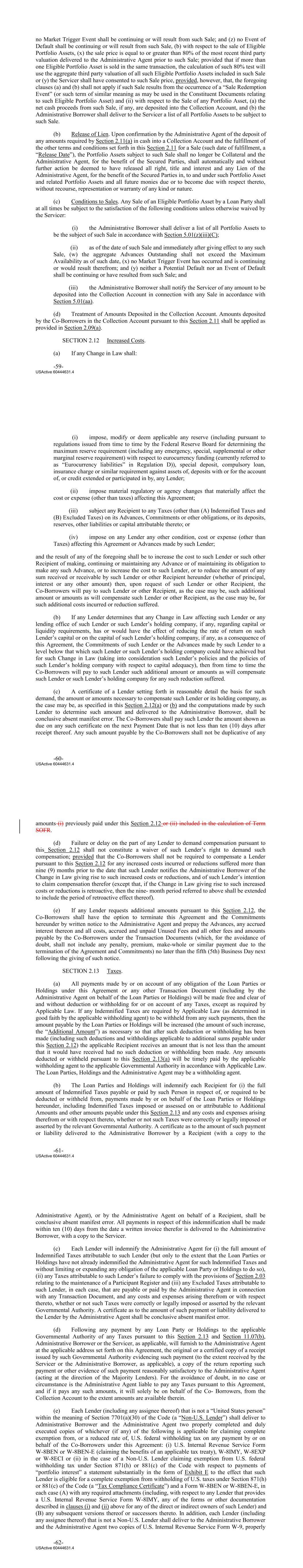no Market Trigger Event shall be continuing or will result from such Sale; and (z) no Event of Default shall be continuing or will result from such Sale, (b) with respect to the sale of Eligible Portfolio Assets, (x) the sale price is equal to or greater than 80% of the most recent third party valuation delivered to the Administrative Agent prior to such Sale; provided that if more than one Eligible Portfolio Asset is sold in the same transaction, the calculation of such 80% test will use the aggregate third party valuation of all such Eligible Portfolio Assets included in such Sale or (y) the Servicer shall have consented to such Sale price, provided, however, that, the foregoing clauses (a) and (b) shall not apply if such Sale results from the occurrence of a “Sale Redemption Event” (or such term of similar meaning as may be used in the Constituent Documents relating to such Eligible Portfolio Asset) and (ii) with respect to the Sale of any Portfolio Asset, (a) the net cash proceeds from such Sale, if any, are deposited into the Collection Account, and (b) the Administrative Borrower shall deliver to the Servicer a list of all Portfolio Assets to be subject to such Sale. (b) Release of Lien. Upon confirmation by the Administrative Agent of the deposit of any amounts required by Section 2.11(a) in cash into a Collection Account and the fulfillment of the other terms and conditions set forth in this Section 2.11 for a Sale (such date of fulfillment, a “Release Date”), the Portfolio Assets subject to such Sale shall no longer be Collateral and the Administrative Agent, for the benefit of the Secured Parties, shall automatically and without further action be deemed to have released all right, title and interest and any Lien of the Administrative Agent, for the benefit of the Secured Parties in, to and under such Portfolio Asset and related Portfolio Assets and all future monies due or to become due with respect thereto, without recourse, representation or warranty of any kind or nature. (c) Conditions to Sales. Any Sale of an Eligible Portfolio Asset by a Loan Party shall at all times be subject to the satisfaction of the following conditions unless otherwise waived by the Servicer: (i) the Administrative Borrower shall deliver a list of all Portfolio Assets to be the subject of such Sale in accordance with Section 5.01(z)(iii)(C); (ii) as of the date of such Sale and immediately after giving effect to any such Sale, (w) the aggregate Advances Outstanding shall not exceed the Maximum Availability as of such date, (x) no Market Trigger Event has occurred and is continuing or would result therefrom; and (y) neither a Potential Default nor an Event of Default shall be continuing or have resulted from such Sale; and (iii) the Administrative Borrower shall notify the Servicer of any amount to be deposited into the Collection Account in connection with any Sale in accordance with Section 5.01(aa). (d) Treatment of Amounts Deposited in the Collection Account. Amounts deposited by the Co‐Borrowers in the Collection Account pursuant to this Section 2.11 shall be applied as provided in Section 2.09(a). SECTION 2.12 Increased Costs. (a) If any Change in Law shall: -59- USActive 60444631.4 (i) impose, modify or deem applicable any reserve (including pursuant to regulations issued from time to time by the Federal Reserve Board for determining the maximum reserve requirement (including any emergency, special, supplemental or other marginal reserve requirement) with respect to eurocurrency funding (currently referred to as “Eurocurrency liabilities” in Regulation D)), special deposit, compulsory loan, insurance charge or similar requirement against assets of, deposits with or for the account of, or credit extended or participated in by, any Lender; (ii) impose material regulatory or agency changes that materially affect the cost or expense (other than taxes) affecting this Agreement; (iii) subject any Recipient to any Taxes (other than (A) Indemnified Taxes and (B) Excluded Taxes) on its Advances, Commitments or other obligations, or its deposits, reserves, other liabilities or capital attributable thereto; or (iv) impose on any Lender any other condition, cost or expense (other than Taxes) affecting this Agreement or Advances made by such Lender; and the result of any of the foregoing shall be to increase the cost to such Lender or such other Recipient of making, continuing or maintaining any Advance or of maintaining its obligation to make any such Advance, or to increase the cost to such Lender, or to reduce the amount of any sum received or receivable by such Lender or other Recipient hereunder (whether of principal, interest or any other amount) then, upon request of such Lender or other Recipient, the Co-Borrowers will pay to such Lender or other Recipient, as the case may be, such additional amount or amounts as will compensate such Lender or other Recipient, as the case may be, for such additional costs incurred or reduction suffered. (b) If any Lender determines that any Change in Law affecting such Lender or any lending office of such Lender or such Lender’s holding company, if any, regarding capital or liquidity requirements, has or would have the effect of reducing the rate of return on such Lender’s capital or on the capital of such Lender’s holding company, if any, as a consequence of this Agreement, the Commitments of such Lender or the Advances made by such Lender to a level below that which such Lender or such Lender’s holding company could have achieved but for such Change in Law (taking into consideration such Lender’s policies and the policies of such Lender’s holding company with respect to capital adequacy), then from time to time the Co-Borrowers will pay to such Lender such additional amount or amounts as will compensate such Lender or such Lender’s holding company for any such reduction suffered. (c) A certificate of a Lender setting forth in reasonabl
