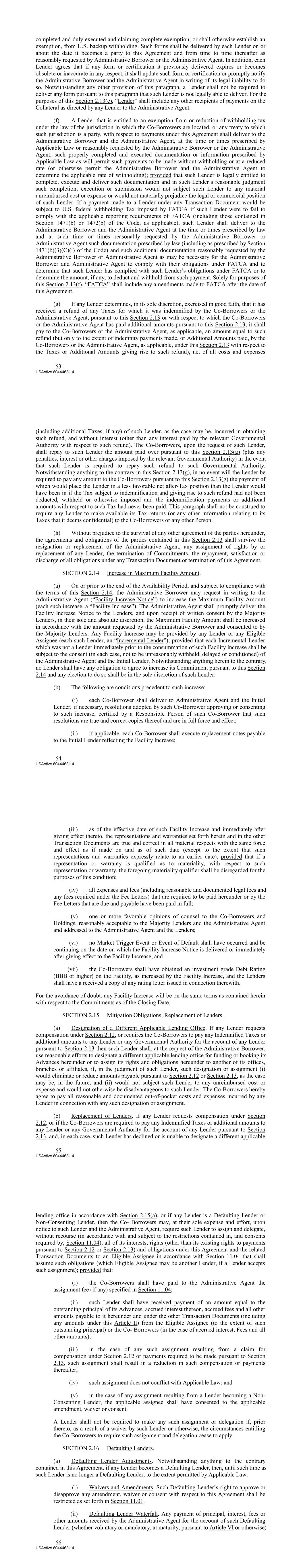 completed and duly executed and claiming complete exemption, or shall otherwise establish an exemption, from U.S. backup withholding. Such forms shall be delivered by each Lender on or about the date it becomes a party to this Agreement and from time to time thereafter as reasonably requested by Administrative Borrower or the Administrative Agent. In addition, each Lender agrees that if any form or certification it previously delivered expires or becomes obsolete or inaccurate in any respect, it shall update such form or certification or promptly notify the Administrative Borrower and the Administrative Agent in writing of its legal inability to do so. Notwithstanding any other provision of this paragraph, a Lender shall not be required to deliver any form pursuant to this paragraph that such Lender is not legally able to deliver. For the purposes of this Section 2.13(e), “Lender” shall include any other recipients of payments on the Collateral as directed by any Lender to the Administrative Agent. (f) A Lender that is entitled to an exemption from or reduction of withholding tax under the law of the jurisdiction in which the Co‐Borrowers are located, or any treaty to which such jurisdiction is a party, with respect to payments under this Agreement shall deliver to the Administrative Borrower and the Administrative Agent, at the time or times prescribed by Applicable Law or reasonably requested by the Administrative Borrower or the Administrative Agent, such properly completed and executed documentation or information prescribed by Applicable Law as will permit such payments to be made without withholding or at a reduced rate (or otherwise permit the Administrative Borrower and the Administrative Agent to determine the applicable rate of withholding); provided that such Lender is legally entitled to complete, execute and deliver such documentation and in such Lender’s reasonable judgment such completion, execution or submission would not subject such Lender to any material unreimbursed cost or expense or would not materially prejudice the legal or commercial position of such Lender. If a payment made to a Lender under any Transaction Document would be subject to U.S. federal withholding Tax imposed by FATCA if such Lender were to fail to comply with the applicable reporting requirements of FATCA (including those contained in Section 1471(b) or 1472(b) of the Code, as applicable), such Lender shall deliver to the Administrative Borrower and the Administrative Agent at the time or times prescribed by law and at such time or times reasonably requested by the Administrative Borrower or Administrative Agent such documentation prescribed by law (including as prescribed by Section 1471(b)(3)(C)(i) of the Code) and such additional documentation reasonably requested by the Administrative Borrower or Administrative Agent as may be necessary for the Administrative Borrower and Administrative Agent to comply with their obligations under FATCA and to determine that such Lender has complied with such Lender’s obligations under FATCA or to determine the amount, if any, to deduct and withhold from such payment. Solely for purposes of this Section 2.13(f), “FATCA” shall include any amendments made to FATCA after the date of this Agreement. (g) If any Lender determines, in its sole discretion, exercised in good faith, that it has received a refund of any Taxes for which it was indemnified by the Co‐Borrowers or the Administrative Agent, pursuant to this Section 2.13 or with respect to which the Co‐Borrowers or the Administrative Agent has paid additional amounts pursuant to this Section 2.13, it shall pay to the Co‐Borrowers or the Administrative Agent, as applicable, an amount equal to such refund (but only to the extent of indemnity payments made, or Additional Amounts paid, by the Co‐Borrowers or the Administrative Agent, as applicable, under this Section 2.13 with respect to the Taxes or Additional Amounts giving rise to such refund), net of all costs and expenses -63- USActive 60444631.4 (including additional Taxes, if any) of such Lender, as the case may be, incurred in obtaining such refund, and without interest (other than any interest paid by the relevant Governmental Authority with respect to such refund). The Co‐Borrowers, upon the request of such Lender, shall repay to such Lender the amount paid over pursuant to this Section 2.13(g) (plus any penalties, interest or other charges imposed by the relevant Governmental Authority) in the event that such Lender is required to repay such refund to such Governmental Authority. Notwithstanding anything to the contrary in this Section 2.13(g), in no event will the Lender be required to pay any amount to the Co‐Borrowers pursuant to this Section 2.13(g) the payment of which would place the Lender in a less favorable net after‐Tax position than the Lender would have been in if the Tax subject to indemnification and giving rise to such refund had not been deducted, withheld or otherwise imposed and the indemnification payments or additional amounts with respect to such Tax had never been paid. This paragraph shall not be construed to require any Lender to make available its Tax returns (or any other information relating to its Taxes that it deems confidential) to the Co‐Borrowers or any other Person. (h) Without prejudice to the survival of any other agreement of the parties hereunder, the agreements and obligations of the parties contained in this Section 2.13 shall survive the resignation or replacement of the Administrative Agent, any assignment of rights by or replacement of any Lender, the termination of Commitments, the repayment, satisfaction or discharge of all obligations under any Transaction Document or termination of this Agreement. SECTION 2.14 Increase in Maximum Facility Amount. (a) On or prior to the end of the Availability Period, and subject to compliance with the terms of this Section 2.14, the Administrati