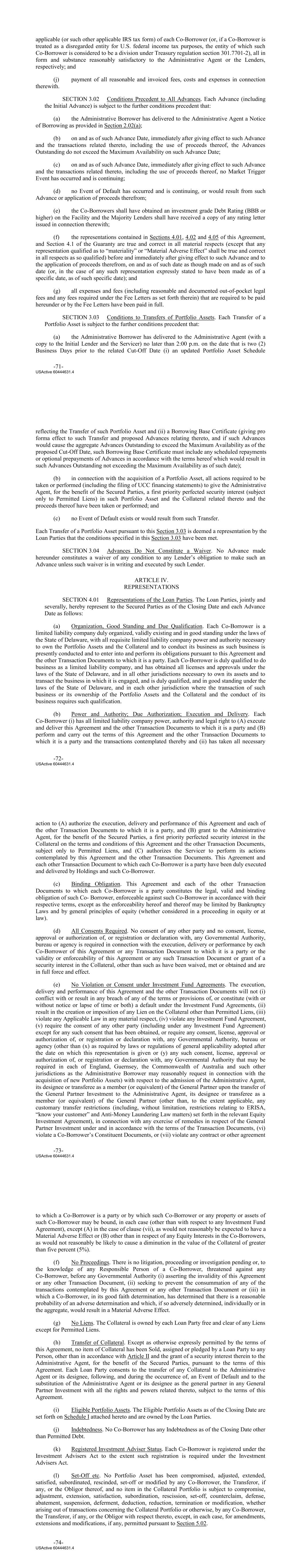 applicable (or such other applicable IRS tax form) of each Co‐Borrower (or, if a Co‐Borrower is treated as a disregarded entity for U.S. federal income tax purposes, the entity of which such Co‐Borrower is considered to be a division under Treasury regulation section 301.7701‐2), all in form and substance reasonably satisfactory to the Administrative Agent or the Lenders, respectively; and (j) payment of all reasonable and invoiced fees, costs and expenses in connection therewith. SECTION 3.02 Conditions Precedent to All Advances. Each Advance (including the Initial Advance) is subject to the further conditions precedent that: (a) the Administrative Borrower has delivered to the Administrative Agent a Notice of Borrowing as provided in Section 2.02(a); (b) on and as of such Advance Date, immediately after giving effect to such Advance and the transactions related thereto, including the use of proceeds thereof, the Advances Outstanding do not exceed the Maximum Availability on such Advance Date; (c) on and as of such Advance Date, immediately after giving effect to such Advance and the transactions related thereto, including the use of proceeds thereof, no Market Trigger Event has occurred and is continuing; (d) no Event of Default has occurred and is continuing, or would result from such Advance or application of proceeds therefrom; (e) the Co‐Borrowers shall have obtained an investment grade Debt Rating (BBB or higher) on the Facility and the Majority Lenders shall have received a copy of any rating letter issued in connection therewith; (f) the representations contained in Sections 4.01, 4.02 and 4.05 of this Agreement, and Section 4.1 of the Guaranty are true and correct in all material respects (except that any representation qualified as to “materiality” or “Material Adverse Effect” shall be true and correct in all respects as so qualified) before and immediately after giving effect to such Advance and to the application of proceeds therefrom, on and as of such date as though made on and as of such date (or, in the case of any such representation expressly stated to have been made as of a specific date, as of such specific date); and (g) all expenses and fees (including reasonable and documented out‐of‐pocket legal fees and any fees required under the Fee Letters as set forth therein) that are required to be paid hereunder or by the Fee Letters have been paid in full. SECTION 3.03 Conditions to Transfers of Portfolio Assets. Each Transfer of a Portfolio Asset is subject to the further conditions precedent that: (a) the Administrative Borrower has delivered to the Administrative Agent (with a copy to the Initial Lender and the Servicer) no later than 2:00 p.m. on the date that is two (2) Business Days prior to the related Cut‐Off Date (i) an updated Portfolio Asset Schedule -71- USActive 60444631.4 reflecting the Transfer of such Portfolio Asset and (ii) a Borrowing Base Certificate (giving pro forma effect to such Transfer and proposed Advances relating thereto, and if such Advances would cause the aggregate Advances Outstanding to exceed the Maximum Availability as of the proposed Cut‐Off Date, such Borrowing Base Certificate must include any scheduled repayments or optional prepayments of Advances in accordance with the terms hereof which would result in such Advances Outstanding not exceeding the Maximum Availability as of such date); (b) in connection with the acquisition of a Portfolio Asset, all actions required to be taken or performed (including the filing of UCC financing statements) to give the Administrative Agent, for the benefit of the Secured Parties, a first priority perfected security interest (subject only to Permitted Liens) in such Portfolio Asset and the Collateral related thereto and the proceeds thereof have been taken or performed; and (c) no Event of Default exists or would result from such Transfer. Each Transfer of a Portfolio Asset pursuant to this Section 3.03 is deemed a representation by the Loan Parties that the conditions specified in this Section 3.03 have been met. SECTION 3.04 Advances Do Not Constitute a Waiver. No Advance made hereunder constitutes a waiver of any condition to any Lender’s obligation to make such an Advance unless such waiver is in writing and executed by such Lender. ARTICLE IV. REPRESENTATIONS SECTION 4.01 Representations of the Loan Parties. The Loan Parties, jointly and severally, hereby represent to the Secured Parties as of the Closing Date and each Advance Date as follows: (a) Organization, Good Standing and Due Qualification. Each Co‐Borrower is a limited liability company duly organized, validly existing and in good standing under the laws of the State of Delaware, with all requisite limited liability company power and authority necessary to own the Portfolio Assets and the Collateral and to conduct its business as such business is presently conducted and to enter into and perform its obligations pursuant to this Agreement and the other Transaction Documents to which it is a party. Each Co‐Borrower is duly qualified to do business as a limited liability company, and has obtained all licenses and approvals under the laws of the State of Delaware, and in all other jurisdictions necessary to own its assets and to transact the business in which it is engaged, and is duly qualified, and in good standing under the laws of the State of Delaware, and in each other jurisdiction where the transaction of such business or its ownership of the Portfolio Assets and the Collateral and the conduct of its business requires such qualification. (b) Power and Authority; Due Authorization; Execution and Delivery. Each Co‐Borrower (i) has all limited liability company power, authority and legal right to (A) execute and deliver this Agreement and the other Transaction Documents to which it is a party and (B) perform and carry out the terms of this Agreement and the other Transaction Documents to which it is a 