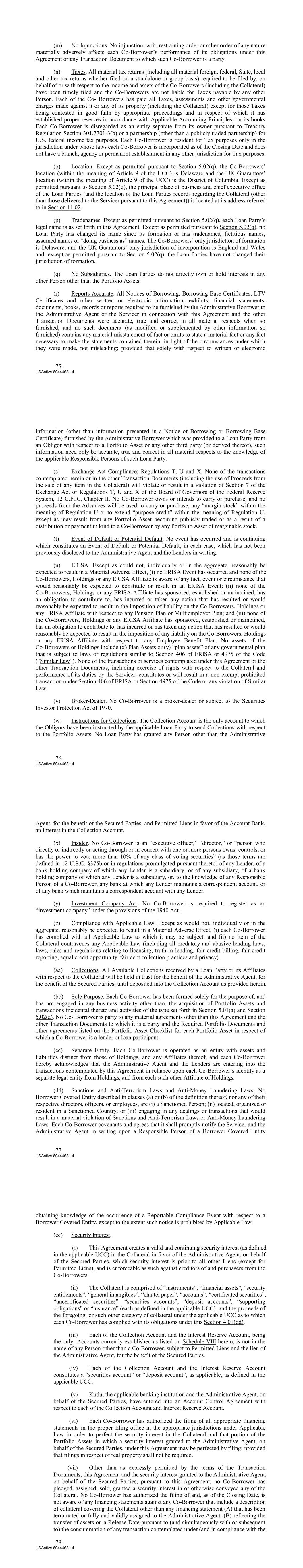 (m) No Injunctions. No injunction, writ, restraining order or other order of any nature materially adversely affects each Co‐Borrower’s performance of its obligations under this Agreement or any Transaction Document to which such Co‐Borrower is a party. (n) Taxes. All material tax returns (including all material foreign, federal, State, local and other tax returns whether filed on a standalone or group basis) required to be filed by, on behalf of or with respect to the income and assets of the Co‐Borrowers (including the Collateral) have been timely filed and the Co‐Borrowers are not liable for Taxes payable by any other Person. Each of the Co‐ Borrowers has paid all Taxes, assessments and other governmental charges made against it or any of its property (including the Collateral) except for those Taxes being contested in good faith by appropriate proceedings and in respect of which it has established proper reserves in accordance with Applicable Accounting Principles, on its books Each Co‐Borrower is disregarded as an entity separate from its owner pursuant to Treasury Regulation Section 301.7701‐3(b) or a partnership (other than a publicly traded partnership) for U.S. federal income tax purposes. Each Co‐Borrower is resident for Tax purposes only in the jurisdiction under whose laws each Co‐Borrower is incorporated as of the Closing Date and does not have a branch, agency or permanent establishment in any other jurisdiction for Tax purposes. (o) Location. Except as permitted pursuant to Section 5.02(q), the Co‐Borrowers’ location (within the meaning of Article 9 of the UCC) is Delaware and the UK Guarantors’ location (within the meaning of Article 9 of the UCC) is the District of Columbia. Except as permitted pursuant to Section 5.02(q), the principal place of business and chief executive office of the Loan Parties (and the location of the Loan Parties records regarding the Collateral (other than those delivered to the Servicer pursuant to this Agreement)) is located at its address referred to in Section 11.02. (p) Tradenames. Except as permitted pursuant to Section 5.02(q), each Loan Party’s legal name is as set forth in this Agreement. Except as permitted pursuant to Section 5.02(q), no Loan Party has changed its name since its formation or has tradenames, fictitious names, assumed names or “doing business as” names. The Co‐Borrowers’ only jurisdiction of formation is Delaware, and the UK Guarantors’ only jurisdiction of incorporation is England and Wales and, except as permitted pursuant to Section 5.02(q), the Loan Parties have not changed their jurisdiction of formation. (q) No Subsidiaries. The Loan Parties do not directly own or hold interests in any other Person other than the Portfolio Assets. (r) Reports Accurate. All Notices of Borrowing, Borrowing Base Certificates, LTV Certificates and other written or electronic information, exhibits, financial statements, documents, books, records or reports required to be furnished by the Administrative Borrower to the Administrative Agent or the Servicer in connection with this Agreement and the other Transaction Documents were accurate, true and correct in all material respects when so furnished, and no such document (as modified or supplemented by other information so furnished) contains any material misstatement of fact or omits to state a material fact or any fact necessary to make the statements contained therein, in light of the circumstances under which they were made, not misleading; provided that solely with respect to written or electronic -75- USActive 60444631.4 information (other than information presented in a Notice of Borrowing or Borrowing Base Certificate) furnished by the Administrative Borrower which was provided to a Loan Party from an Obligor with respect to a Portfolio Asset or any other third party (or derived thereof), such information need only be accurate, true and correct in all material respects to the knowledge of the applicable Responsible Persons of such Loan Party. (s) Exchange Act Compliance; Regulations T, U and X. None of the transactions contemplated herein or in the other Transaction Documents (including the use of Proceeds from the sale of any item in the Collateral) will violate or result in a violation of Section 7 of the Exchange Act or Regulations T, U and X of the Board of Governors of the Federal Reserve System, 12 C.F.R., Chapter II. No Co‐Borrower owns or intends to carry or purchase, and no proceeds from the Advances will be used to carry or purchase, any “margin stock” within the meaning of Regulation U or to extend “purpose credit” within the meaning of Regulation U, except as may result from any Portfolio Asset becoming publicly traded or as a result of a distribution or payment in kind to a Co‐Borrower by any Portfolio Asset of marginable stock. (t) Event of Default or Potential Default. No event has occurred and is continuing which constitutes an Event of Default or Potential Default, in each case, which has not been previously disclosed to the Administrative Agent and the Lenders in writing. (u) ERISA. Except as could not, individually or in the aggregate, reasonably be expected to result in a Material Adverse Effect, (i) no ERISA Event has occurred and none of the Co‐Borrowers, Holdings or any ERISA Affiliate is aware of any fact, event or circumstance that would reasonably be expected to constitute or result in an ERISA Event; (ii) none of the Co‐Borrowers, Holdings or any ERISA Affiliate has sponsored, established or maintained, has an obligation to contribute to, has incurred or taken any action that has resulted or would reasonably be expected to result in the imposition of liability on the Co‐Borrowers, Holdings or any ERISA Affiliate with respect to any Pension Plan or Multiemployer Plan; and (iii) none of the Co‐Borrowers, Holdings or any ERISA Affiliate has sponsored, established or maintained, has an obligation to c