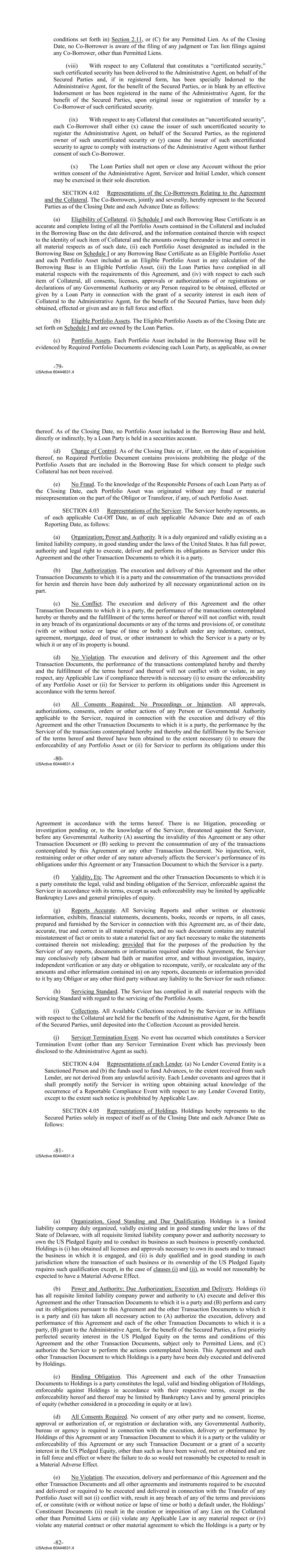 conditions set forth in) Section 2.11, or (C) for any Permitted Lien. As of the Closing Date, no Co‐Borrower is aware of the filing of any judgment or Tax lien filings against any Co‐Borrower, other than Permitted Liens. (viii) With respect to any Collateral that constitutes a “certificated security,” such certificated security has been delivered to the Administrative Agent, on behalf of the Secured Parties and, if in registered form, has been specially Indorsed to the Administrative Agent, for the benefit of the Secured Parties, or in blank by an effective Indorsement or has been registered in the name of the Administrative Agent, for the benefit of the Secured Parties, upon original issue or registration of transfer by a Co‐Borrower of such certificated security. (ix) With respect to any Collateral that constitutes an “uncertificated security”, each Co‐Borrower shall either (x) cause the issuer of such uncertificated security to register the Administrative Agent, on behalf of the Secured Parties, as the registered owner of such uncertificated security or (y) cause the issuer of such uncertificated security to agree to comply with instructions of the Administrative Agent without further consent of such Co‐Borrower. (x) The Loan Parties shall not open or close any Account without the prior written consent of the Administrative Agent, Servicer and Initial Lender, which consent may be exercised in their sole discretion. SECTION 4.02 Representations of the Co‐Borrowers Relating to the Agreement and the Collateral. The Co‐Borrowers, jointly and severally, hereby represent to the Secured Parties as of the Closing Date and each Advance Date as follows: (a) Eligibility of Collateral. (i) Schedule I and each Borrowing Base Certificate is an accurate and complete listing of all the Portfolio Assets contained in the Collateral and included in the Borrowing Base on the date delivered, and the information contained therein with respect to the identity of such item of Collateral and the amounts owing thereunder is true and correct in all material respects as of such date, (ii) each Portfolio Asset designated as included in the Borrowing Base on Schedule I or any Borrowing Base Certificate as an Eligible Portfolio Asset and each Portfolio Asset included as an Eligible Portfolio Asset in any calculation of the Borrowing Base is an Eligible Portfolio Asset, (iii) the Loan Parties have complied in all material respects with the requirements of this Agreement, and (iv) with respect to each such item of Collateral, all consents, licenses, approvals or authorizations of or registrations or declarations of any Governmental Authority or any Person required to be obtained, effected or given by a Loan Party in connection with the grant of a security interest in each item of Collateral to the Administrative Agent, for the benefit of the Secured Parties, have been duly obtained, effected or given and are in full force and effect. (b) Eligible Portfolio Assets. The Eligible Portfolio Assets as of the Closing Date are set forth on Schedule I and are owned by the Loan Parties. (c) Portfolio Assets. Each Portfolio Asset included in the Borrowing Base will be evidenced by Required Portfolio Documents evidencing each Loan Party, as applicable, as owner -79- USActive 60444631.4 thereof. As of the Closing Date, no Portfolio Asset included in the Borrowing Base and held, directly or indirectly, by a Loan Party is held in a securities account. (d) Change of Control. As of the Closing Date or, if later, on the date of acquisition thereof, no Required Portfolio Document contains provisions prohibiting the pledge of the Portfolio Assets that are included in the Borrowing Base for which consent to pledge such Collateral has not been received. (e) No Fraud. To the knowledge of the Responsible Persons of each Loan Party as of the Closing Date, each Portfolio Asset was originated without any fraud or material misrepresentation on the part of the Obligor or Transferor, if any, of such Portfolio Asset. SECTION 4.03 Representations of the Servicer. The Servicer hereby represents, as of each applicable Cut‐Off Date, as of each applicable Advance Date and as of each Reporting Date, as follows: (a) Organization; Power and Authority. It is a duly organized and validly existing as a limited liability company, in good standing under the laws of the United States. It has full power, authority and legal right to execute, deliver and perform its obligations as Servicer under this Agreement and the other Transaction Documents to which it is a party. (b) Due Authorization. The execution and delivery of this Agreement and the other Transaction Documents to which it is a party and the consummation of the transactions provided for herein and therein have been duly authorized by all necessary organizational action on its part. (c) No Conflict. The execution and delivery of this Agreement and the other Transaction Documents to which it is a party, the performance of the transactions contemplated hereby or thereby and the fulfillment of the terms hereof or thereof will not conflict with, result in any breach of its organizational documents or any of the terms and provisions of, or constitute (with or without notice or lapse of time or both) a default under any indenture, contract, agreement, mortgage, deed of trust, or other instrument to which the Servicer is a party or by which it or any of its property is bound. (d) No Violation. The execution and delivery of this Agreement and the other Transaction Documents, the performance of the transactions contemplated hereby and thereby and the fulfillment of the terms hereof and thereof will not conflict with or violate, in any respect, any Applicable Law if compliance therewith is necessary (i) to ensure the enforceability of any Portfolio Asset or (ii) for Servicer to perform its obligations under this Agreement in accordance with the terms hereof. (e) All Consents Required; No P