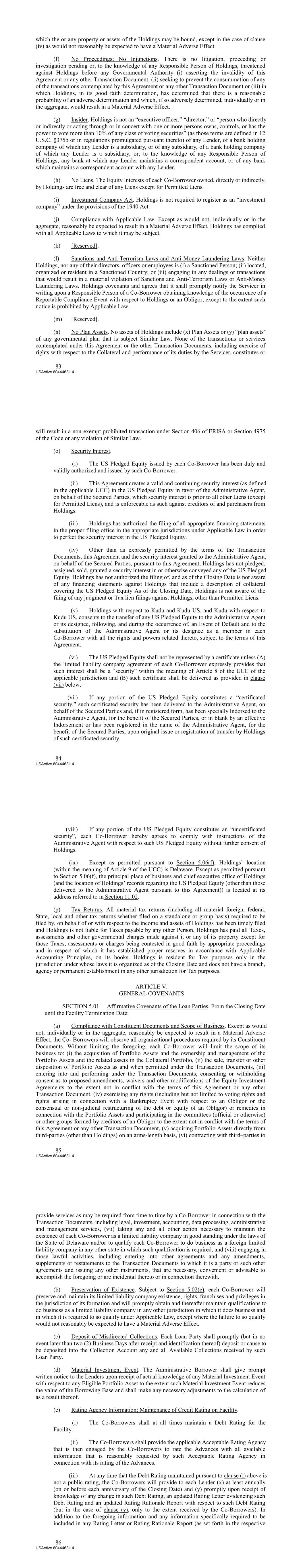 which the or any property or assets of the Holdings may be bound, except in the case of clause (iv) as would not reasonably be expected to have a Material Adverse Effect. (f) No Proceedings; No Injunctions. There is no litigation, proceeding or investigation pending or, to the knowledge of any Responsible Person of Holdings, threatened against Holdings before any Governmental Authority (i) asserting the invalidity of this Agreement or any other Transaction Document, (ii) seeking to prevent the consummation of any of the transactions contemplated by this Agreement or any other Transaction Document or (iii) in which Holdings, in its good faith determination, has determined that there is a reasonable probability of an adverse determination and which, if so adversely determined, individually or in the aggregate, would result in a Material Adverse Effect. (g) Insider. Holdings is not an “executive officer,” “director,” or “person who directly or indirectly or acting through or in concert with one or more persons owns, controls, or has the power to vote more than 10% of any class of voting securities” (as those terms are defined in 12 U.S.C. §375b or in regulations promulgated pursuant thereto) of any Lender, of a bank holding company of which any Lender is a subsidiary, or of any subsidiary, of a bank holding company of which any Lender is a subsidiary, or, to the knowledge of any Responsible Person of Holdings, any bank at which any Lender maintains a correspondent account, or of any bank which maintains a correspondent account with any Lender. (h) No Liens. The Equity Interests of each Co‐Borrower owned, directly or indirectly, by Holdings are free and clear of any Liens except for Permitted Liens. (i) Investment Company Act. Holdings is not required to register as an “investment company” under the provisions of the 1940 Act. (j) Compliance with Applicable Law. Except as would not, individually or in the aggregate, reasonably be expected to result in a Material Adverse Effect, Holdings has complied with all Applicable Laws to which it may be subject. (k) [Reserved]. (l) Sanctions and Anti‐Terrorism Laws and Anti‐Money Laundering Laws. Neither Holdings, nor any of their directors, officers or employees is (i) a Sanctioned Person; (ii) located, organized or resident in a Sanctioned Country; or (iii) engaging in any dealings or transactions that would result in a material violation of Sanctions and Anti‐Terrorism Laws or Anti‐Money Laundering Laws. Holdings covenants and agrees that it shall promptly notify the Servicer in writing upon a Responsible Person of a Co‐Borrower obtaining knowledge of the occurrence of a Reportable Compliance Event with respect to Holdings or an Obligor, except to the extent such notice is prohibited by Applicable Law. (m) [Reserved]. (n) No Plan Assets. No assets of Holdings include (x) Plan Assets or (y) “plan assets” of any governmental plan that is subject Similar Law. None of the transactions or services contemplated under this Agreement or the other Transaction Documents, including exercise of rights with respect to the Collateral and performance of its duties by the Servicer, constitutes or -83- USActive 60444631.4 will result in a non‐exempt prohibited transaction under Section 406 of ERISA or Section 4975 of the Code or any violation of Similar Law. (o) Security Interest. (i) The US Pledged Equity issued by each Co‐Borrower has been duly and validly authorized and issued by such Co‐Borrower. (ii) This Agreement creates a valid and continuing security interest (as defined in the applicable UCC) in the US Pledged Equity in favor of the Administrative Agent, on behalf of the Secured Parties, which security interest is prior to all other Liens (except for Permitted Liens), and is enforceable as such against creditors of and purchasers from Holdings. (iii) Holdings has authorized the filing of all appropriate financing statements in the proper filing office in the appropriate jurisdictions under Applicable Law in order to perfect the security interest in the US Pledged Equity. (iv) Other than as expressly permitted by the terms of the Transaction Documents, this Agreement and the security interest granted to the Administrative Agent, on behalf of the Secured Parties, pursuant to this Agreement, Holdings has not pledged, assigned, sold, granted a security interest in or otherwise conveyed any of the US Pledged Equity. Holdings has not authorized the filing of, and as of the Closing Date is not aware of any financing statements against Holdings that include a description of collateral covering the US Pledged Equity As of the Closing Date, Holdings is not aware of the filing of any judgment or Tax lien filings against Holdings, other than Permitted Liens. (v) Holdings with respect to Kudu and Kudu US, and Kudu with respect to Kudu US, consents to the transfer of any US Pledged Equity to the Administrative Agent or its designee, following, and during the occurrence of, an Event of Default and to the substitution of the Administrative Agent or its designee as a member in each Co‐Borrower with all the rights and powers related thereto, subject to the terms of this Agreement. (vi) The US Pledged Equity shall not be represented by a certificate unless (A) the limited liability company agreement of each Co‐Borrower expressly provides that such interest shall be a “security” within the meaning of Article 8 of the UCC of the applicable jurisdiction and (B) such certificate shall be delivered as provided in clause (vii) below. (vii) If any portion of the US Pledged Equity constitutes a “certificated security,” such certificated security has been delivered to the Administrative Agent, on behalf of the Secured Parties and, if in registered form, has been specially Indorsed to the Administrative Agent, for the benefit of the Secured Parties, or in blank by an effective Indorsement or has been registered in the name of the Admi