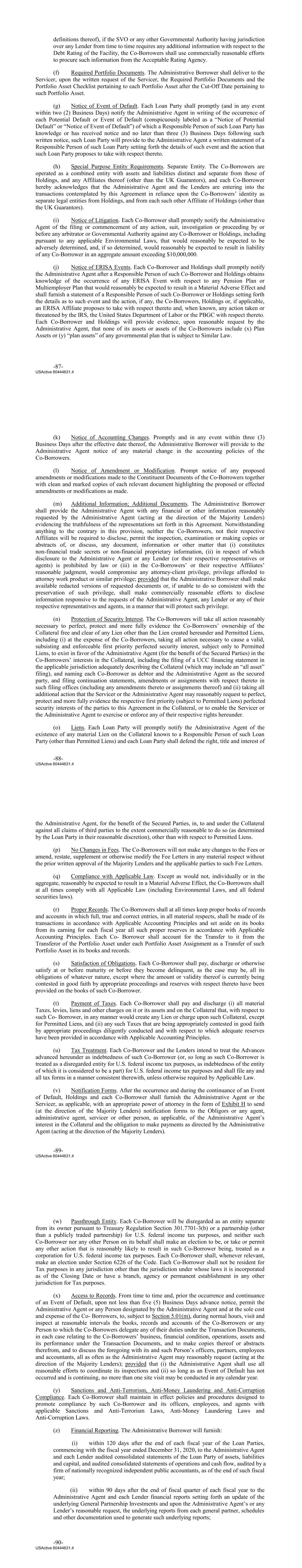 definitions thereof), if the SVO or any other Governmental Authority having jurisdiction over any Lender from time to time requires any additional information with respect to the Debt Rating of the Facility, the Co-Borrowers shall use commercially reasonable efforts to procure such information from the Acceptable Rating Agency. (f) Required Portfolio Documents. The Administrative Borrower shall deliver to the Servicer, upon the written request of the Servicer, the Required Portfolio Documents and the Portfolio Asset Checklist pertaining to each Portfolio Asset after the Cut‐Off Date pertaining to such Portfolio Asset. (g) Notice of Event of Default. Each Loan Party shall promptly (and in any event within two (2) Business Days) notify the Administrative Agent in writing of the occurrence of each Potential Default or Event of Default (conspicuously labeled as a “Notice of Potential Default” or “Notice of Event of Default”) of which a Responsible Person of such Loan Party has knowledge or has received notice and no later than three (3) Business Days following such written notice, such Loan Party will provide to the Administrative Agent a written statement of a Responsible Person of such Loan Party setting forth the details of such event and the action that such Loan Party proposes to take with respect thereto. (h) Special Purpose Entity Requirements. Separate Entity. The Co‐Borrowers are operated as a combined entity with assets and liabilities distinct and separate from those of Holdings, and any Affiliates thereof (other than the UK Guarantors), and each Co‐Borrower hereby acknowledges that the Administrative Agent and the Lenders are entering into the transactions contemplated by this Agreement in reliance upon the Co‐Borrowers’ identity as separate legal entities from Holdings, and from each such other Affiliate of Holdings (other than the UK Guarantors). (i) Notice of Litigation. Each Co‐Borrower shall promptly notify the Administrative Agent of the filing or commencement of any action, suit, investigation or proceeding by or before any arbitrator or Governmental Authority against any Co‐Borrower or Holdings, including pursuant to any applicable Environmental Laws, that would reasonably be expected to be adversely determined, and, if so determined, would reasonably be expected to result in liability of any Co‐Borrower in an aggregate amount exceeding $10,000,000. (j) Notice of ERISA Events. Each Co‐Borrower and Holdings shall promptly notify the Administrative Agent after a Responsible Person of such Co‐Borrower and Holdings obtains knowledge of the occurrence of any ERISA Event with respect to any Pension Plan or Multiemployer Plan that would reasonably be expected to result in a Material Adverse Effect and shall furnish a statement of a Responsible Person of such Co‐Borrower or Holdings setting forth the details as to such event and the action, if any, the Co‐Borrowers, Holdings or, if applicable, an ERISA Affiliate proposes to take with respect thereto and, when known, any action taken or threatened by the IRS, the United States Department of Labor or the PBGC with respect thereto. Each Co‐Borrower and Holdings will provide evidence, upon reasonable request by the Administrative Agent, that none of its assets or assets of the Co‐Borrowers include (x) Plan Assets or (y) “plan assets” of any governmental plan that is subject to Similar Law. -87- USActive 60444631.4 (k) Notice of Accounting Changes. Promptly and in any event within three (3) Business Days after the effective date thereof, the Administrative Borrower will provide to the Administrative Agent notice of any material change in the accounting policies of the Co‐Borrowers. (l) Notice of Amendment or Modification. Prompt notice of any proposed amendments or modifications made to the Constituent Documents of the Co‐Borrowers together with clean and marked copies of each relevant document highlighting the proposed or effected amendments or modifications as made. (m) Additional Information; Additional Documents. The Administrative Borrower shall provide the Administrative Agent with any financial or other information reasonably requested by the Administrative Agent (acting at the direction of the Majority Lenders) evidencing the truthfulness of the representations set forth in this Agreement. Notwithstanding anything to the contrary in this provision, neither the Co‐Borrowers, not their respective Affiliates will be required to disclose, permit the inspection, examination or making copies or abstracts of, or discuss, any document, information or other matter that (i) constitutes non‐financial trade secrets or non‐financial proprietary information, (ii) in respect of which disclosure to the Administrative Agent or any Lender (or their respective representatives or agents) is prohibited by law or (iii) in the Co‐Borrowers’ or their respective Affiliates’ reasonable judgment, would compromise any attorney‐client privilege, privilege afforded to attorney work product or similar privilege; provided that the Administrative Borrower shall make available redacted versions of requested documents or, if unable to do so consistent with the preservation of such privilege, shall make commercially reasonable efforts to disclose information responsive to the requests of the Administrative Agent, any Lender or any of their respective representatives and agents, in a manner that will protect such privilege. (n) Protection of Security Interest. The Co‐Borrowers will take all action reasonably necessary to perfect, protect and more fully evidence the Co‐Borrowers’ ownership of the Collateral free and clear of any Lien other than the Lien created hereunder and Permitted Liens, including (i) at the expense of the Co‐Borrowers, taking all action necessary to cause a valid, subsisting and enforceable first priority perfected security interest, subject only to Permitted Liens, to exist in