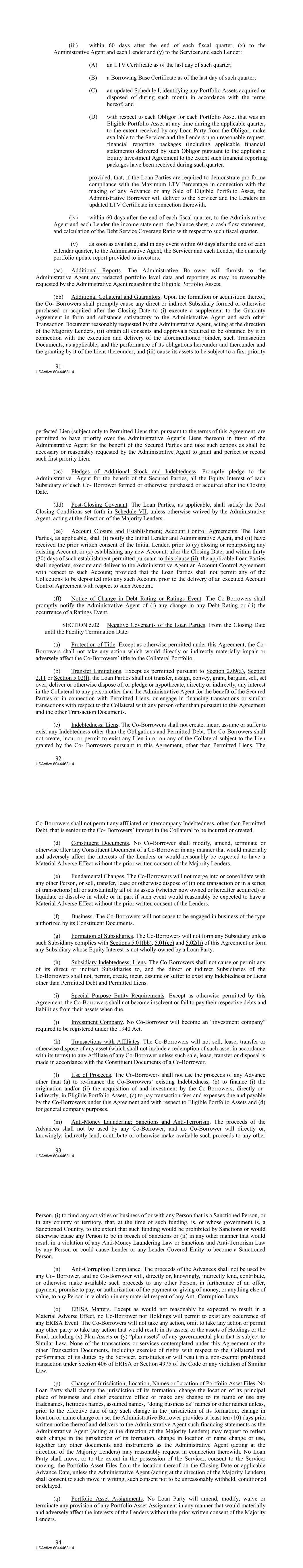 (iii) within 60 days after the end of each fiscal quarter, (x) to the Administrative Agent and each Lender and (y) to the Servicer and each Lender: (A) an LTV Certificate as of the last day of such quarter; (B) a Borrowing Base Certificate as of the last day of such quarter; (C) an updated Schedule I, identifying any Portfolio Assets acquired or disposed of during such month in accordance with the terms hereof; and (D) with respect to each Obligor for each Portfolio Asset that was an Eligible Portfolio Asset at any time during the applicable quarter, to the extent received by any Loan Party from the Obligor, make available to the Servicer and the Lenders upon reasonable request, financial reporting packages (including applicable financial statements) delivered by such Obligor pursuant to the applicable Equity Investment Agreement to the extent such financial reporting packages have been received during such quarter. provided, that, if the Loan Parties are required to demonstrate pro forma compliance with the Maximum LTV Percentage in connection with the making of any Advance or any Sale of Eligible Portfolio Asset, the Administrative Borrower will deliver to the Servicer and the Lenders an updated LTV Certificate in connection therewith. (iv) within 60 days after the end of each fiscal quarter, to the Administrative Agent and each Lender the income statement, the balance sheet, a cash flow statement, and calculation of the Debt Service Coverage Ratio with respect to such fiscal quarter. (v) as soon as available, and in any event within 60 days after the end of each calendar quarter, to the Administrative Agent, the Servicer and each Lender, the quarterly portfolio update report provided to investors. (aa) Additional Reports. The Administrative Borrower will furnish to the Administrative Agent any redacted portfolio level data and reporting as may be reasonably requested by the Administrative Agent regarding the Eligible Portfolio Assets. (bb) Additional Collateral and Guarantors. Upon the formation or acquisition thereof, the Co‐ Borrowers shall promptly cause any direct or indirect Subsidiary formed or otherwise purchased or acquired after the Closing Date to (i) execute a supplement to the Guaranty Agreement in form and substance satisfactory to the Administrative Agent and each other Transaction Document reasonably requested by the Administrative Agent, acting at the direction of the Majority Lenders, (ii) obtain all consents and approvals required to be obtained by it in connection with the execution and delivery of the aforementioned joinder, such Transaction Documents, as applicable, and the performance of its obligations hereunder and thereunder and the granting by it of the Liens thereunder, and (iii) cause its assets to be subject to a first priority -91- USActive 60444631.4 perfected Lien (subject only to Permitted Liens that, pursuant to the terms of this Agreement, are permitted to have priority over the Administrative Agent’s Liens thereon) in favor of the Administrative Agent for the benefit of the Secured Parties and take such actions as shall be necessary or reasonably requested by the Administrative Agent to grant and perfect or record such first priority Lien. (cc) Pledges of Additional Stock and Indebtedness. Promptly pledge to the Administrative Agent for the benefit of the Secured Parties, all the Equity Interest of each Subsidiary of each Co‐ Borrower formed or otherwise purchased or acquired after the Closing Date. (dd) Post‐Closing Covenant. The Loan Parties, as applicable, shall satisfy the Post Closing Conditions set forth in Schedule VII, unless otherwise waived by the Administrative Agent, acting at the direction of the Majority Lenders. (ee) Account Closure and Establishment; Account Control Agreements. The Loan Parties, as applicable, shall (i) notify the Initial Lender and Administrative Agent, and (ii) have received the prior written consent of the Initial Lender, prior to (y) closing or repurposing any existing Account, or (z) establishing any new Account, after the Closing Date, and within thirty (30) days of such establishment permitted pursuant to this clause (ii), the applicable Loan Parties shall negotiate, execute and deliver to the Administrative Agent an Account Control Agreement with respect to such Account; provided that the Loan Parties shall not permit any of the Collections to be deposited into any such Account prior to the delivery of an executed Account Control Agreement with respect to such Account. (ff) Notice of Change in Debt Rating or Ratings Event. The Co-Borrowers shall promptly notify the Administrative Agent of (i) any change in any Debt Rating or (ii) the occurrence of a Ratings Event. SECTION 5.02 Negative Covenants of the Loan Parties. From the Closing Date until the Facility Termination Date: (a) Protection of Title. Except as otherwise permitted under this Agreement, the Co‐ Borrowers shall not take any action which would directly or indirectly materially impair or adversely affect the Co‐Borrowers’ title to the Collateral Portfolio. (b) Transfer Limitations. Except as permitted pursuant to Section 2.09(a), Section 2.11 or Section 5.02(l), the Loan Parties shall not transfer, assign, convey, grant, bargain, sell, set over, deliver or otherwise dispose of, or pledge or hypothecate, directly or indirectly, any interest in the Collateral to any person other than the Administrative Agent for the benefit of the Secured Parties or in connection with Permitted Liens, or engage in financing transactions or similar transactions with respect to the Collateral with any person other than pursuant to this Agreement and the other Transaction Documents. (c) Indebtedness; Liens. The Co‐Borrowers shall not create, incur, assume or suffer to exist any Indebtedness other than the Obligations and Permitted Debt. The Co‐Borrowers shall not create, incur or permit to exist any Lien in or on any of the Collateral subject to the Lie