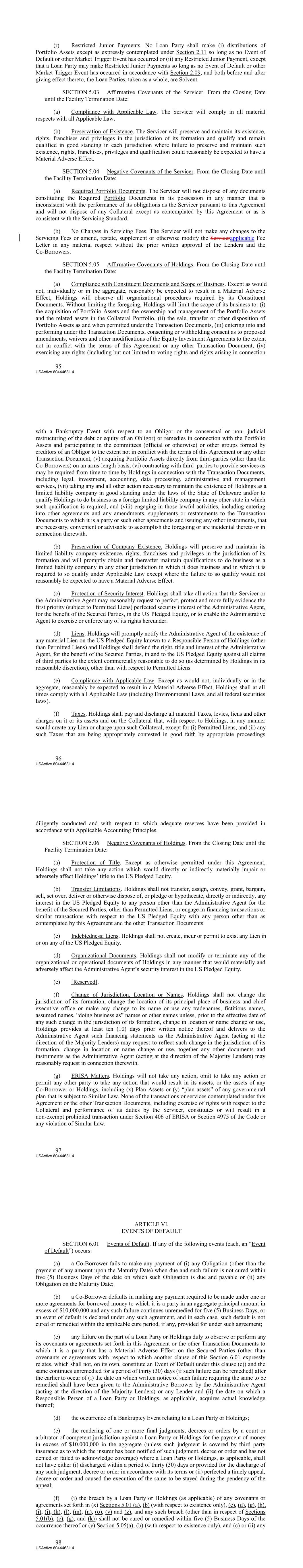 (r) Restricted Junior Payments. No Loan Party shall make (i) distributions of Portfolio Assets except as expressly contemplated under Section 2.11 so long as no Event of Default or other Market Trigger Event has occurred or (ii) any Restricted Junior Payment, except that a Loan Party may make Restricted Junior Payments so long as no Event of Default or other Market Trigger Event has occurred in accordance with Section 2.09, and both before and after giving effect thereto, the Loan Parties, taken as a whole, are Solvent. SECTION 5.03 Affirmative Covenants of the Servicer. From the Closing Date until the Facility Termination Date: (a) Compliance with Applicable Law. The Servicer will comply in all material respects with all Applicable Law. (b) Preservation of Existence. The Servicer will preserve and maintain its existence, rights, franchises and privileges in the jurisdiction of its formation and qualify and remain qualified in good standing in each jurisdiction where failure to preserve and maintain such existence, rights, franchises, privileges and qualification could reasonably be expected to have a Material Adverse Effect. SECTION 5.04 Negative Covenants of the Servicer. From the Closing Date until the Facility Termination Date: (a) Required Portfolio Documents. The Servicer will not dispose of any documents constituting the Required Portfolio Documents in its possession in any manner that is inconsistent with the performance of its obligations as the Servicer pursuant to this Agreement and will not dispose of any Collateral except as contemplated by this Agreement or as is consistent with the Servicing Standard. (b) No Changes in Servicing Fees. The Servicer will not make any changes to the Servicing Fees or amend, restate, supplement or otherwise modify the Servicerapplicable Fee Letter in any material respect without the prior written approval of the Lenders and the Co‐Borrowers. SECTION 5.05 Affirmative Covenants of Holdings. From the Closing Date until the Facility Termination Date: (a) Compliance with Constituent Documents and Scope of Business. Except as would not, individually or in the aggregate, reasonably be expected to result in a Material Adverse Effect, Holdings will observe all organizational procedures required by its Constituent Documents. Without limiting the foregoing, Holdings will limit the scope of its business to: (i) the acquisition of Portfolio Assets and the ownership and management of the Portfolio Assets and the related assets in the Collateral Portfolio, (ii) the sale, transfer or other disposition of Portfolio Assets as and when permitted under the Transaction Documents, (iii) entering into and performing under the Transaction Documents, consenting or withholding consent as to proposed amendments, waivers and other modifications of the Equity Investment Agreements to the extent not in conflict with the terms of this Agreement or any other Transaction Document, (iv) exercising any rights (including but not limited to voting rights and rights arising in connection -95- USActive 60444631.4 with a Bankruptcy Event with respect to an Obligor or the consensual or non‐ judicial restructuring of the debt or equity of an Obligor) or remedies in connection with the Portfolio Assets and participating in the committees (official or otherwise) or other groups formed by creditors of an Obligor to the extent not in conflict with the terms of this Agreement or any other Transaction Document, (v) acquiring Portfolio Assets directly from third‐parties (other than the Co‐Borrowers) on an arms‐length basis, (vi) contracting with third–parties to provide services as may be required from time to time by Holdings in connection with the Transaction Documents, including legal, investment, accounting, data processing, administrative and management services, (vii) taking any and all other action necessary to maintain the existence of Holdings as a limited liability company in good standing under the laws of the State of Delaware and/or to qualify Holdings to do business as a foreign limited liability company in any other state in which such qualification is required, and (viii) engaging in those lawful activities, including entering into other agreements and any amendments, supplements or restatements to the Transaction Documents to which it is a party or such other agreements and issuing any other instruments, that are necessary, convenient or advisable to accomplish the foregoing or are incidental thereto or in connection therewith. (b) Preservation of Company Existence. Holdings will preserve and maintain its limited liability company existence, rights, franchises and privileges in the jurisdiction of its formation and will promptly obtain and thereafter maintain qualifications to do business as a limited liability company in any other jurisdiction in which it does business and in which it is required to so qualify under Applicable Law except where the failure to so qualify would not reasonably be expected to have a Material Adverse Effect. (c) Protection of Security Interest. Holdings shall take all action that the Servicer or the Administrative Agent may reasonably request to perfect, protect and more fully evidence the first priority (subject to Permitted Liens) perfected security interest of the Administrative Agent, for the benefit of the Secured Parties, in the US Pledged Equity, or to enable the Administrative Agent to exercise or enforce any of its rights hereunder. (d) Liens. Holdings will promptly notify the Administrative Agent of the existence of any material Lien on the US Pledged Equity known to a Responsible Person of Holdings (other than Permitted Liens) and Holdings shall defend the right, title and interest of the Administrative Agent, for the benefit of the Secured Parties, in and to the US Pledged Equity against all claims of third parties to the extent commercially reasonable to do so (as determined by Holdings in its reasonable discretion), othe