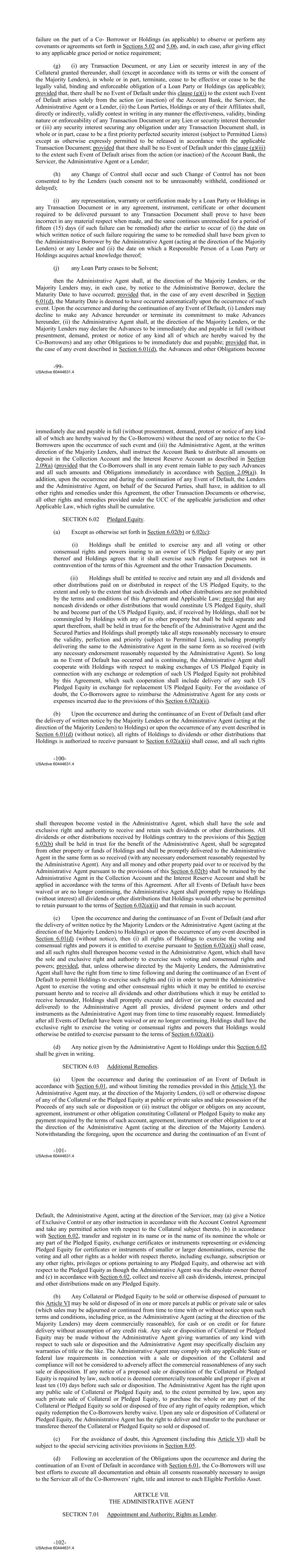 failure on the part of a Co‐ Borrower or Holdings (as applicable) to observe or perform any covenants or agreements set forth in Sections 5.02 and 5.06, and, in each case, after giving effect to any applicable grace period or notice requirement; (g) (i) any Transaction Document, or any Lien or security interest in any of the Collateral granted thereunder, shall (except in accordance with its terms or with the consent of the Majority Lenders), in whole or in part, terminate, cease to be effective or cease to be the legally valid, binding and enforceable obligation of a Loan Party or Holdings (as applicable); provided that, there shall be no Event of Default under this clause (g)(i) to the extent such Event of Default arises solely from the action (or inaction) of the Account Bank, the Servicer, the Administrative Agent or a Lender, (ii) the Loan Parties, Holdings or any of their Affiliates shall, directly or indirectly, validly contest in writing in any manner the effectiveness, validity, binding nature or enforceability of any Transaction Document or any Lien or security interest thereunder or (iii) any security interest securing any obligation under any Transaction Document shall, in whole or in part, cease to be a first priority perfected security interest (subject to Permitted Liens) except as otherwise expressly permitted to be released in accordance with the applicable Transaction Document; provided that there shall be no Event of Default under this clause (g)(iii) to the extent such Event of Default arises from the action (or inaction) of the Account Bank, the Servicer, the Administrative Agent or a Lender; (h) any Change of Control shall occur and such Change of Control has not been consented to by the Lenders (such consent not to be unreasonably withheld, conditioned or delayed); (i) any representation, warranty or certification made by a Loan Party or Holdings in any Transaction Document or in any agreement, instrument, certificate or other document required to be delivered pursuant to any Transaction Document shall prove to have been incorrect in any material respect when made, and the same continues unremedied for a period of fifteen (15) days (if such failure can be remedied) after the earlier to occur of (i) the date on which written notice of such failure requiring the same to be remedied shall have been given to the Administrative Borrower by the Administrative Agent (acting at the direction of the Majority Lenders) or any Lender and (ii) the date on which a Responsible Person of a Loan Party or Holdings acquires actual knowledge thereof; (j) any Loan Party ceases to be Solvent; then the Administrative Agent shall, at the direction of the Majority Lenders, or the Majority Lenders may, in each case, by notice to the Administrative Borrower, declare the Maturity Date to have occurred; provided that, in the case of any event described in Section 6.01(d), the Maturity Date is deemed to have occurred automatically upon the occurrence of such event. Upon the occurrence and during the continuation of any Event of Default, (i) Lenders may decline to make any Advance hereunder or terminate its commitment to make Advances hereunder, (ii) the Administrative Agent shall, at the direction of the Majority Lenders, or the Majority Lenders may declare the Advances to be immediately due and payable in full (without presentment, demand, protest or notice of any kind all of which are hereby waived by the Co‐Borrowers) and any other Obligations to be immediately due and payable; provided that, in the case of any event described in Section 6.01(d), the Advances and other Obligations become -99- USActive 60444631.4 immediately due and payable in full (without presentment, demand, protest or notice of any kind all of which are hereby waived by the Co‐Borrowers) without the need of any notice to the Co‐ Borrowers upon the occurrence of such event and (iii) the Administrative Agent, at the written direction of the Majority Lenders, shall instruct the Account Bank to distribute all amounts on deposit in the Collection Account and the Interest Reserve Account as described in Section 2.09(a) (provided that the Co‐Borrowers shall in any event remain liable to pay such Advances and all such amounts and Obligations immediately in accordance with Section 2.09(a)). In addition, upon the occurrence and during the continuation of any Event of Default, the Lenders and the Administrative Agent, on behalf of the Secured Parties, shall have, in addition to all other rights and remedies under this Agreement, the other Transaction Documents or otherwise, all other rights and remedies provided under the UCC of the applicable jurisdiction and other Applicable Law, which rights shall be cumulative. SECTION 6.02 Pledged Equity. (a) Except as otherwise set forth in Section 6.02(b) or 6.02(c): (i) Holdings shall be entitled to exercise any and all voting or other consensual rights and powers inuring to an owner of US Pledged Equity or any part thereof and Holdings agrees that it shall exercise such rights for purposes not in contravention of the terms of this Agreement and the other Transaction Documents. (ii) Holdings shall be entitled to receive and retain any and all dividends and other distributions paid on or distributed in respect of the US Pledged Equity, to the extent and only to the extent that such dividends and other distributions are not prohibited by the terms and conditions of this Agreement and Applicable Law; provided that any noncash dividends or other distributions that would constitute US Pledged Equity, shall be and become part of the US Pledged Equity, and, if received by Holdings, shall not be commingled by Holdings with any of its other property but shall be held separate and apart therefrom, shall be held in trust for the benefit of the Administrative Agent and the Secured Parties and Holdings shall promptly take all steps reasonably necessary to ensure the validity, perfection and pri