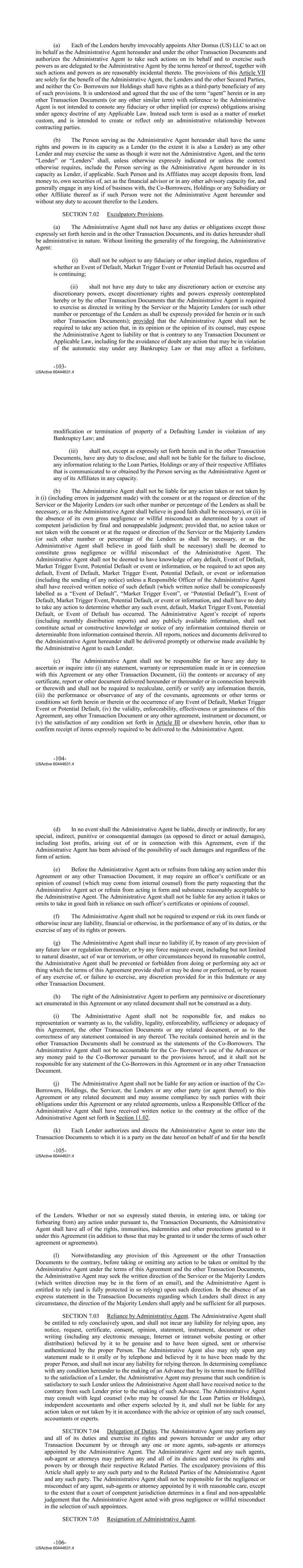(a) Each of the Lenders hereby irrevocably appoints Alter Domus (US) LLC to act on its behalf as the Administrative Agent hereunder and under the other Transaction Documents and authorizes the Administrative Agent to take such actions on its behalf and to exercise such powers as are delegated to the Administrative Agent by the terms hereof or thereof, together with such actions and powers as are reasonably incidental thereto. The provisions of this Article VII are solely for the benefit of the Administrative Agent, the Lenders and the other Secured Parties, and neither the Co‐ Borrowers nor Holdings shall have rights as a third‐party beneficiary of any of such provisions. It is understood and agreed that the use of the term “agent” herein or in any other Transaction Documents (or any other similar term) with reference to the Administrative Agent is not intended to connote any fiduciary or other implied (or express) obligations arising under agency doctrine of any Applicable Law. Instead such term is used as a matter of market custom, and is intended to create or reflect only an administrative relationship between contracting parties. (b) The Person serving as the Administrative Agent hereunder shall have the same rights and powers in its capacity as a Lender (to the extent it is also a Lender) as any other Lender and may exercise the same as though it were not the Administrative Agent, and the term “Lender” or “Lenders” shall, unless otherwise expressly indicated or unless the context otherwise requires, include the Person serving as the Administrative Agent hereunder in its capacity as Lender, if applicable. Such Person and its Affiliates may accept deposits from, lend money to, own securities of, act as the financial advisor or in any other advisory capacity for, and generally engage in any kind of business with, the Co‐Borrowers, Holdings or any Subsidiary or other Affiliate thereof as if such Person were not the Administrative Agent hereunder and without any duty to account therefor to the Lenders. SECTION 7.02 Exculpatory Provisions. (a) The Administrative Agent shall not have any duties or obligations except those expressly set forth herein and in the other Transaction Documents, and its duties hereunder shall be administrative in nature. Without limiting the generality of the foregoing, the Administrative Agent: (i) shall not be subject to any fiduciary or other implied duties, regardless of whether an Event of Default, Market Trigger Event or Potential Default has occurred and is continuing; (ii) shall not have any duty to take any discretionary action or exercise any discretionary powers, except discretionary rights and powers expressly contemplated hereby or by the other Transaction Documents that the Administrative Agent is required to exercise as directed in writing by the Servicer or the Majority Lenders (or such other number or percentage of the Lenders as shall be expressly provided for herein or in such other Transaction Documents); provided that the Administrative Agent shall not be required to take any action that, in its opinion or the opinion of its counsel, may expose the Administrative Agent to liability or that is contrary to any Transaction Document or Applicable Law, including for the avoidance of doubt any action that may be in violation of the automatic stay under any Bankruptcy Law or that may affect a forfeiture, -103- USActive 60444631.4 modification or termination of property of a Defaulting Lender in violation of any Bankruptcy Law; and (iii) shall not, except as expressly set forth herein and in the other Transaction Documents, have any duty to disclose, and shall not be liable for the failure to disclose, any information relating to the Loan Parties, Holdings or any of their respective Affiliates that is communicated to or obtained by the Person serving as the Administrative Agent or any of its Affiliates in any capacity. (b) The Administrative Agent shall not be liable for any action taken or not taken by it (i) (including errors in judgement made) with the consent or at the request or direction of the Servicer or the Majority Lenders (or such other number or percentage of the Lenders as shall be necessary, or as the Administrative Agent shall believe in good faith shall be necessary), or (ii) in the absence of its own gross negligence or willful misconduct as determined by a court of competent jurisdiction by final and nonappealable judgment; provided that, no action taken or not taken with the consent or at the request or direction of the Servicer or the Majority Lenders (or such other number or percentage of the Lenders as shall be necessary, or as the Administrative Agent shall believe in good faith shall be necessary) shall be deemed to constitute gross negligence or willful misconduct of the Administrative Agent. The Administrative Agent shall not be deemed to have knowledge of any default, Event of Default, Market Trigger Event, Potential Default or event or information, or be required to act upon any default, Event of Default, Market Trigger Event, Potential Default, or event or information (including the sending of any notice) unless a Responsible Officer of the Administrative Agent shall have received written notice of such default (which written notice shall be conspicuously labelled as a “Event of Default”, “Market Trigger Event”, or “Potential Default”), Event of Default, Market Trigger Event, Potential Default, or event or information, and shall have no duty to take any action to determine whether any such event, default, Market Trigger Event, Potential Default, or Event of Default has occurred. The Administrative Agent’s receipt of reports (including monthly distribution reports) and any publicly available information, shall not constitute actual or constructive knowledge or notice of any information contained therein or determinable from information contained therein. All reports, notices and documents del