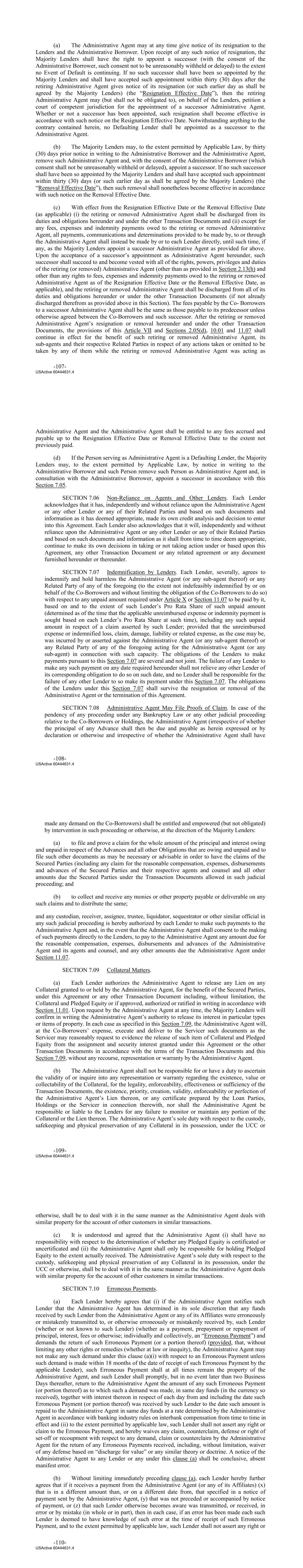 incurred by an Indemnified Party in connection with any enforcement (including by means of any action, claim or suit) by an Indemnified Party of any indemnification or other obligation of Holdings and the Co‐Borrowers, and the Indemnified Party shall only be required to make a request for payment. ARTICLE XI. MISCELLANEOUS SECTION 11.01 Amendments and Waivers. (a) Except as set forth herein, (i) no amendment or modification of any provision of this Agreement or any other Transaction Document shall be effective without the written agreement of Holdings, the Co‐Borrowers and the Majority Lenders and, solely if such amendment or modification would affect the rights or obligations of the Administrative Agent or the Servicer, the written agreement of the Administrative Agent or the Servicer, as applicable, and (ii) no termination or waiver of any provision of this Agreement or any other Transaction Document or consent to any departure therefrom by Holdings, the Co‐Borrowers or the Servicer shall be effective without the written consent of the Majority Lenders. Any waiver or consent shall be effective only in the specific instance and for the specific purpose for which given. Notwithstanding the foregoing, with respect to any amendment, waiver or modification to which the Administrative Agent’s consent is not required, the parties agree to deliver to the Administrative Agent a copy of each such amendment, waiver or modification; provided that, (i) no party shall be liable for its failure to comply with this sentence and (ii) the Administrative Agent shall not be bound by any such amendment unless and until it has received a copy thereof. (b) Notwithstanding the provisions of Section 11.01(a), the written consent of all of the Lenders affected thereby shall be required for any amendment, modification or waiver (i) reducing (without payment thereon) the principal amount due and owing under any outstanding Advance or the interest thereon (other than in connection with waiving any mandatory prepayment hereunder, including without limitation, payments required under Section 2.09), (ii) postponing any date for any payment of any Advance or the interest thereon, (iii) modifying the provisions of this Section 11.01 or the definition of Majority Lenders or changing any other provision specifying the number or percentage of Lenders required to amend, waive or otherwise modify any rights or make any determination or grant any consent, (iv) extending the Maturity Date, (v) of any provision of Section 2.09, (vi) extending or increasing any Commitment of any Lender, (viiother than in accordance with Section 2.14, (vi) changing Section 11.15 in a manner that would alter the pro rata sharing of payments required thereby without the written consent of each Lender directly and adversely affected thereby, (viiivii) waive any condition set forth in Section 3.01 or (ixviii) to consent to a Co‐Borrower’s assignment or transfer of its rights and obligations under this Agreement or any other Transaction Document or release all or substantially all of the Collateral except as expressly authorized in this Agreement. (c) Notwithstanding anything herein to the contrary, no Defaulting Lender shall have any right to approve or disapprove any amendment, waiver or consent hereunder, and any amendment, waiver or consent that by its terms requires the consent of all the Lenders or each affected Lender may be effected with the consent of the applicable Lenders other than Defaulting -123- USActive 60444631.4 Lenders, except that (x) the Commitment of any Defaulting Lender may not be increased or extended, or the maturity of any of its Advances may not be extended, the rate of interest on any of its Advances may not be reduced and the principal amount of any of its Advances may not be forgiven, in each case without the consent of such Defaulting Lender and (y) any amendment, waiver or consent requiring the consent of all the Lenders or each affected Lender that by its terms affects any Defaulting Lender more adversely than the other affected Lenders shall require the consent of such Defaulting Lender. SECTION 11.02 Notices, Etc. All notices and other communications hereunder shall, unless otherwise stated herein, be in writing (which shall include facsimile communication and communication by e‐mail) and faxed, e‐mailed or delivered, to each party hereto, at its address set forth on Schedule IV or at such other address as shall be designated by such party in a written notice to the other parties hereto. Notices and communications by facsimile and e‐mail shall be effective when sent during business hours on a Business Day, and notices and communications sent by other means shall be effective when received. SECTION 11.03 No Waiver Remedies. No failure on the part of the Administrative Agent or any Lender to exercise, and no delay in exercising, any right hereunder shall operate as a waiver thereof; nor shall any single or partial exercise of any right hereunder preclude any other or further exercise thereof or the exercise of any other right. The remedies herein provided are cumulative and not exclusive of any remedies provided by law. SECTION 11.04 Binding Effect; Assignability; Multiple Lenders. (a) This Agreement shall be binding upon and inure to the benefit of Holdings, the Co‐Borrowers, the Administrative Agent, each Lender, the Servicer and their respective successors and permitted assigns. Each Lender and their respective successors and assigns may assign, or grant a security interest in, (i) this Agreement and such Lender’s rights and obligations hereunder and interest herein in whole or in part or (ii) any Advance (or portion thereof) or any Revolving Loan Note (or any portion thereof), in each case, to any Eligible Assignee; provided that unless and until an Event of Default pursuant to Section 6.01(a) or Section 6.01(d) has occurred and is continuing, the consent of the Administrative Borrower (such