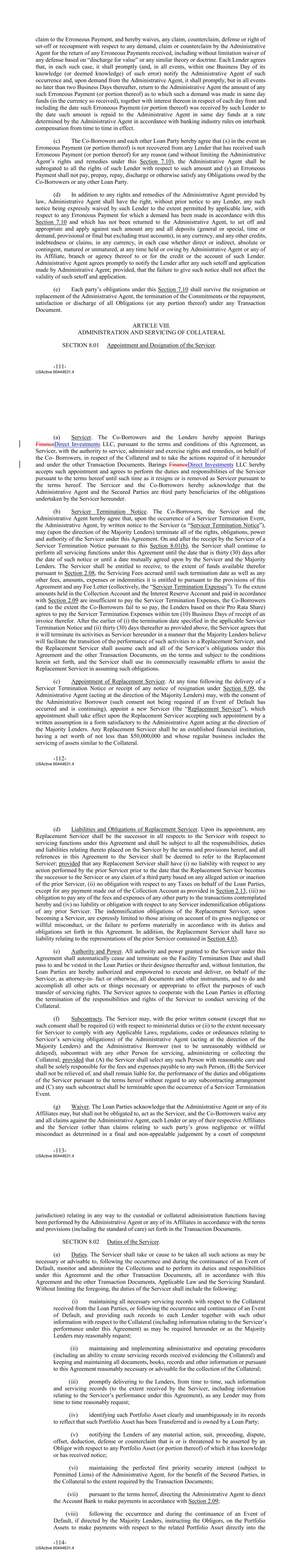 claim to the Erroneous Payment, and hereby waives, any claim, counterclaim, defense or right of set‐off or recoupment with respect to any demand, claim or counterclaim by the Administrative Agent for the return of any Erroneous Payments received, including without limitation waiver of any defense based on “discharge for value” or any similar theory or doctrine. Each Lender agrees that, in each such case, it shall promptly (and, in all events, within one Business Day of its knowledge (or deemed knowledge) of such error) notify the Administrative Agent of such occurrence and, upon demand from the Administrative Agent, it shall promptly, but in all events no later than two Business Days thereafter, return to the Administrative Agent the amount of any such Erroneous Payment (or portion thereof) as to which such a demand was made in same day funds (in the currency so received), together with interest thereon in respect of each day from and including the date such Erroneous Payment (or portion thereof) was received by such Lender to the date such amount is repaid to the Administrative Agent in same day funds at a rate determined by the Administrative Agent in accordance with banking industry rules on interbank compensation from time to time in effect. (c) The Co‐Borrowers and each other Loan Party hereby agree that (x) in the event an Erroneous Payment (or portion thereof) is not recovered from any Lender that has received such Erroneous Payment (or portion thereof) for any reason (and without limiting the Administrative Agent’s rights and remedies under this Section 7.10), the Administrative Agent shall be subrogated to all the rights of such Lender with respect to such amount and (y) an Erroneous Payment shall not pay, prepay, repay, discharge or otherwise satisfy any Obligations owed by the Co‐Borrowers or any other Loan Party. (d) In addition to any rights and remedies of the Administrative Agent provided by law, Administrative Agent shall have the right, without prior notice to any Lender, any such notice being expressly waived by such Lender to the extent permitted by applicable law, with respect to any Erroneous Payment for which a demand has been made in accordance with this Section 7.10 and which has not been returned to the Administrative Agent, to set off and appropriate and apply against such amount any and all deposits (general or special, time or demand, provisional or final but excluding trust accounts), in any currency, and any other credits, indebtedness or claims, in any currency, in each case whether direct or indirect, absolute or contingent, matured or unmatured, at any time held or owing by Administrative Agent or any of its Affiliate, branch or agency thereof to or for the credit or the account of such Lender. Administrative Agent agrees promptly to notify the Lender after any such setoff and application made by Administrative Agent; provided, that the failure to give such notice shall not affect the validity of such setoff and application. (e) Each party’s obligations under this Section 7.10 shall survive the resignation or replacement of the Administrative Agent, the termination of the Commitments or the repayment, satisfaction or discharge of all Obligations (or any portion thereof) under any Transaction Document. ARTICLE VIII. ADMINISTRATION AND SERVICING OF COLLATERAL SECTION 8.01 Appointment and Designation of the Servicer. -111- USActive 60444631.4 (a) Servicer. The Co‐Borrowers and the Lenders hereby appoint Barings FinanceDirect Investments LLC, pursuant to the terms and conditions of this Agreement, as Servicer, with the authority to service, administer and exercise rights and remedies, on behalf of the Co‐ Borrowers, in respect of the Collateral and to take the actions required of it hereunder and under the other Transaction Documents. Barings FinanceDirect Investments LLC hereby accepts such appointment and agrees to perform the duties and responsibilities of the Servicer pursuant to the terms hereof until such time as it resigns or is removed as Servicer pursuant to the terms hereof. The Servicer and the Co‐Borrowers hereby acknowledge that the Administrative Agent and the Secured Parties are third party beneficiaries of the obligations undertaken by the Servicer hereunder. (b) Servicer Termination Notice. The Co‐Borrowers, the Servicer and the Administrative Agent hereby agree that, upon the occurrence of a Servicer Termination Event, the Administrative Agent, by written notice to the Servicer (a “Servicer Termination Notice”), may (upon the direction of the Majority Lenders) terminate all of the rights, obligations, power and authority of the Servicer under this Agreement. On and after the receipt by the Servicer of a Servicer Termination Notice pursuant to this Section 8.01(b), the Servicer shall continue to perform all servicing functions under this Agreement until the date that is thirty (30) days after the date of such notice or until a date mutually agreed upon by the Servicer and the Majority Lenders. The Servicer shall be entitled to receive, to the extent of funds available therefor pursuant to Section 2.08, the Servicing Fees accrued until such termination date as well as any other fees, amounts, expenses or indemnities it is entitled to pursuant to the provisions of this Agreement and any Fee Letter (collectively, the “Servicer Termination Expenses”). To the extent amounts held in the Collection Account and the Interest Reserve Account and paid in accordance with Section 2.09 are insufficient to pay the Servicer Termination Expenses, the Co‐Borrowers (and to the extent the Co‐Borrowers fail to so pay, the Lenders based on their Pro Rata Share) agrees to pay the Servicer Termination Expenses within ten (10) Business Days of receipt of an invoice therefor. After the earlier of (i) the termination date specified in the applicable Servicer Termination Notice and (ii) thirty (30) days thereafter as provided above, the