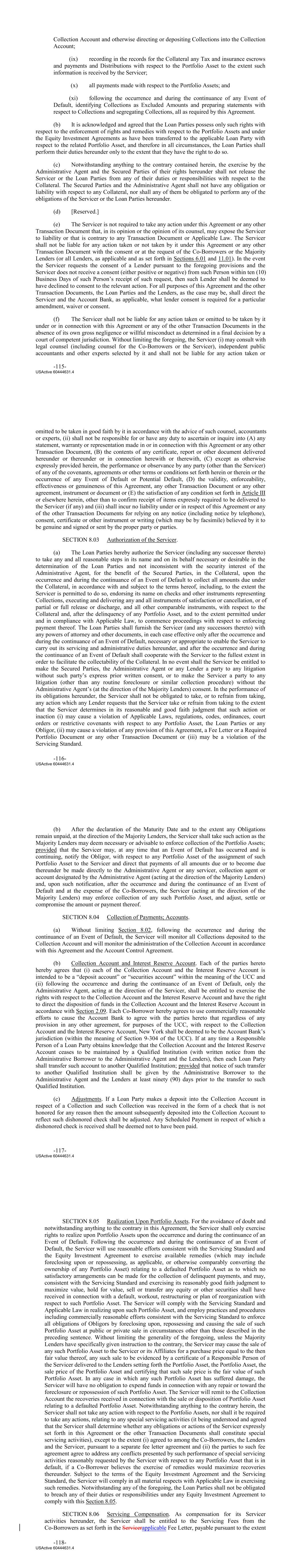 Collection Account and otherwise directing or depositing Collections into the Collection Account; (ix) recording in the records for the Collateral any Tax and insurance escrows and payments and Distributions with respect to the Portfolio Asset to the extent such information is received by the Servicer; (x) all payments made with respect to the Portfolio Assets; and (xi) following the occurrence and during the continuance of any Event of Default, identifying Collections as Excluded Amounts and preparing statements with respect to Collections and segregating Collections, all as required by this Agreement. (b) It is acknowledged and agreed that the Loan Parties possess only such rights with respect to the enforcement of rights and remedies with respect to the Portfolio Assets and under the Equity Investment Agreements as have been transferred to the applicable Loan Party with respect to the related Portfolio Asset, and therefore in all circumstances, the Loan Parties shall perform their duties hereunder only to the extent that they have the right to do so. (c) Notwithstanding anything to the contrary contained herein, the exercise by the Administrative Agent and the Secured Parties of their rights hereunder shall not release the Servicer or the Loan Parties from any of their duties or responsibilities with respect to the Collateral. The Secured Parties and the Administrative Agent shall not have any obligation or liability with respect to any Collateral, nor shall any of them be obligated to perform any of the obligations of the Servicer or the Loan Parties hereunder. (d) [Reserved.] (e) The Servicer is not required to take any action under this Agreement or any other Transaction Document that, in its opinion or the opinion of its counsel, may expose the Servicer to liability or that is contrary to any Transaction Document or Applicable Law. The Servicer shall not be liable for any action taken or not taken by it under this Agreement or any other Transaction Document with the consent or at the request of the Co‐Borrowers or the Majority Lenders (or all Lenders, as applicable and as set forth in Sections 6.01 and 11.01). In the event the Servicer requests the consent of a Lender pursuant to the foregoing provisions and the Servicer does not receive a consent (either positive or negative) from such Person within ten (10) Business Days of such Person’s receipt of such request, then such Lender shall be deemed to have declined to consent to the relevant action. For all purposes of this Agreement and the other Transaction Documents, the Loan Parties and the Lenders, as the case may be, shall direct the Servicer and the Account Bank, as applicable, what lender consent is required for a particular amendment, waiver or consent. (f) The Servicer shall not be liable for any action taken or omitted to be taken by it under or in connection with this Agreement or any of the other Transaction Documents in the absence of its own gross negligence or willful misconduct as determined in a final decision by a court of competent jurisdiction. Without limiting the foregoing, the Servicer (i) may consult with legal counsel (including counsel for the Co‐Borrowers or the Servicer), independent public accountants and other experts selected by it and shall not be liable for any action taken or -115- USActive 60444631.4 omitted to be taken in good faith by it in accordance with the advice of such counsel, accountants or experts, (ii) shall not be responsible for or have any duty to ascertain or inquire into (A) any statement, warranty or representation made in or in connection with this Agreement or any other Transaction Document, (B) the contents of any certificate, report or other document delivered hereunder or thereunder or in connection herewith or therewith, (C) except as otherwise expressly provided herein, the performance or observance by any party (other than the Servicer) of any of the covenants, agreements or other terms or conditions set forth herein or therein or the occurrence of any Event of Default or Potential Default, (D) the validity, enforceability, effectiveness or genuineness of this Agreement, any other Transaction Document or any other agreement, instrument or document or (E) the satisfaction of any condition set forth in Article III or elsewhere herein, other than to confirm receipt of items expressly required to be delivered to the Servicer (if any) and (iii) shall incur no liability under or in respect of this Agreement or any of the other Transaction Documents for relying on any notice (including notice by telephone), consent, certificate or other instrument or writing (which may be by facsimile) believed by it to be genuine and signed or sent by the proper party or parties. SECTION 8.03 Authorization of the Servicer. (a) The Loan Parties hereby authorize the Servicer (including any successor thereto) to take any and all reasonable steps in its name and on its behalf necessary or desirable in the determination of the Loan Parties and not inconsistent with the security interest of the Administrative Agent, for the benefit of the Secured Parties, in the Collateral, upon the occurrence and during the continuance of an Event of Default to collect all amounts due under the Collateral, in accordance with and subject to the terms hereof, including, to the extent the Servicer is permitted to do so, endorsing its name on checks and other instruments representing Collections, executing and delivering any and all instruments of satisfaction or cancellation, or of partial or full release or discharge, and all other comparable instruments, with respect to the Collateral and, after the delinquency of any Portfolio Asset, and to the extent permitted under and in compliance with Applicable Law, to commence proceedings with respect to enforcing payment thereof. The Loan Parties shall furnish the Servicer (and any successors thereto) with any powers of attorney and other documents, in each case effect