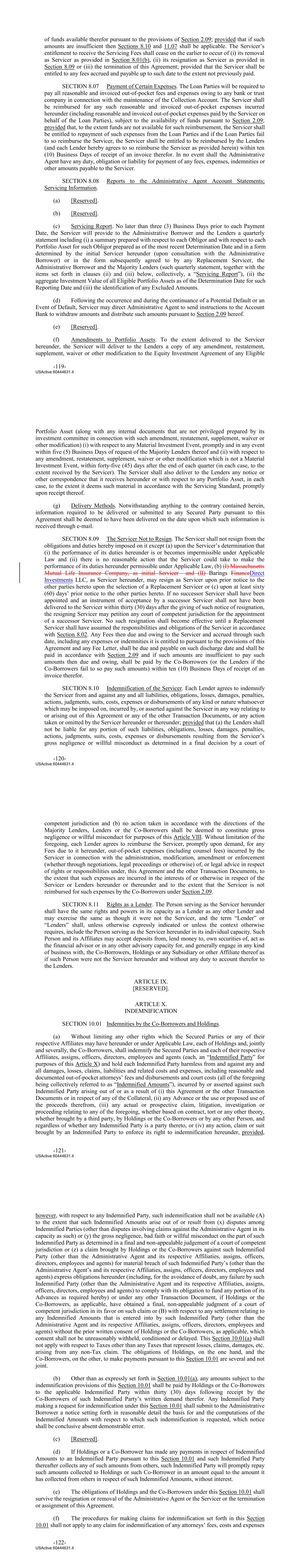 of funds available therefor pursuant to the provisions of Section 2.09; provided that if such amounts are insufficient then Sections 8.10 and 11.07 shall be applicable. The Servicer’s entitlement to receive the Servicing Fees shall cease on the earlier to occur of (i) its removal as Servicer as provided in Section 8.01(b), (ii) its resignation as Servicer as provided in Section 8.09 or (iii) the termination of this Agreement; provided that the Servicer shall be entitled to any fees accrued and payable up to such date to the extent not previously paid. SECTION 8.07 Payment of Certain Expenses. The Loan Parties will be required to pay all reasonable and invoiced out‐of‐pocket fees and expenses owing to any bank or trust company in connection with the maintenance of the Collection Account. The Servicer shall be reimbursed for any such reasonable and invoiced out‐of‐pocket expenses incurred hereunder (including reasonable and invoiced out‐of‐pocket expenses paid by the Servicer on behalf of the Loan Parties), subject to the availability of funds pursuant to Section 2.09; provided that, to the extent funds are not available for such reimbursement, the Servicer shall be entitled to repayment of such expenses from the Loan Parties and if the Loan Parties fail to so reimburse the Servicer, the Servicer shall be entitled to be reimbursed by the Lenders (and each Lender hereby agrees to so reimburse the Servicer as provided herein) within ten (10) Business Days of receipt of an invoice therefor. In no event shall the Administrative Agent have any duty, obligation or liability for payment of any fees, expenses, indemnities or other amounts payable to the Servicer. SECTION 8.08 Reports to the Administrative Agent Account Statements; Servicing Information. (a) [Reserved]. (b) [Reserved]. (c) Servicing Report. No later than three (3) Business Days prior to each Payment Date, the Servicer will provide to the Administrative Borrower and the Lenders a quarterly statement including (i) a summary prepared with respect to each Obligor and with respect to each Portfolio Asset for such Obligor prepared as of the most recent Determination Date and in a form determined by the initial Servicer hereunder (upon consultation with the Administrative Borrower) or in the form subsequently agreed to by any Replacement Servicer, the Administrative Borrower and the Majority Lenders (such quarterly statement, together with the items set forth in clauses (ii) and (iii) below, collectively, a “Servicing Report”), (ii) the aggregate Investment Value of all Eligible Portfolio Assets as of the Determination Date for such Reporting Date and (iii) the identification of any Excluded Amounts. (d) Following the occurrence and during the continuance of a Potential Default or an Event of Default, Servicer may direct Administrative Agent to send instructions to the Account Bank to withdraw amounts and distribute such amounts pursuant to Section 2.09 hereof. (e) [Reserved]. (f) Amendments to Portfolio Assets. To the extent delivered to the Servicer hereunder, the Servicer will deliver to the Lenders a copy of any amendment, restatement, supplement, waiver or other modification to the Equity Investment Agreement of any Eligible -119- USActive 60444631.4 Portfolio Asset (along with any internal documents that are not privileged prepared by its investment committee in connection with such amendment, restatement, supplement, waiver or other modification) (i) with respect to any Material Investment Event, promptly and in any event within five (5) Business Days of request of the Majority Lenders thereof and (ii) with respect to any amendment, restatement, supplement, waiver or other modification which is not a Material Investment Event, within forty‐five (45) days after the end of each quarter (in each case, to the extent received by the Servicer). The Servicer shall also deliver to the Lenders any notice or other correspondence that it receives hereunder or with respect to any Portfolio Asset, in each case, to the extent it deems such material in accordance with the Servicing Standard, promptly upon receipt thereof. (g) Delivery Methods. Notwithstanding anything to the contrary contained herein, information required to be delivered or submitted to any Secured Party pursuant to this Agreement shall be deemed to have been delivered on the date upon which such information is received through e‐mail. SECTION 8.09 The Servicer Not to Resign. The Servicer shall not resign from the obligations and duties hereby imposed on it except (a) upon the Servicer’s determination that (i) the performance of its duties hereunder is or becomes impermissible under Applicable Law and (ii) there is no reasonable action that the Servicer could take to make the performance of its duties hereunder permissible under Applicable Law, (b) (I) Massachusetts Mutual Life Insurance Company, as initial Servicer and (II) Barings FinanceDirect Investments LLC, as Servicer hereunder, may resign as Servicer upon prior notice to the other parties hereto upon the selection of a Replacement Servicer or (c) upon at least sixty (60) days’ prior notice to the other parties hereto. If no successor Servicer shall have been appointed and an instrument of acceptance by a successor Servicer shall not have been delivered to the Servicer within thirty (30) days after the giving of such notice of resignation, the resigning Servicer may petition any court of competent jurisdiction for the appointment of a successor Servicer. No such resignation shall become effective until a Replacement Servicer shall have assumed the responsibilities and obligations of the Servicer in accordance with Section 8.02. Any Fees then due and owing to the Servicer and accrued through such date, including any expenses or indemnities it is entitled to pursuant to the provisions of this Agreement and any Fee Letter, shall be due and payable on such discharge date and shall be paid in accordanc