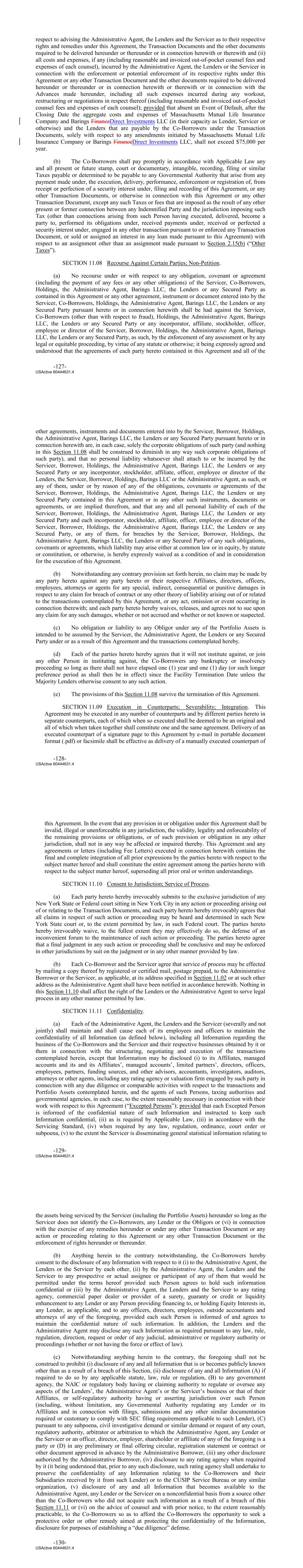 respect to advising the Administrative Agent, the Lenders and the Servicer as to their respective rights and remedies under this Agreement, the Transaction Documents and the other documents required to be delivered hereunder or thereunder or in connection herewith or therewith and (ii) all costs and expenses, if any (including reasonable and invoiced out‐of‐pocket counsel fees and expenses of each counsel), incurred by the Administrative Agent, the Lenders or the Servicer in connection with the enforcement or potential enforcement of its respective rights under this Agreement or any other Transaction Document and the other documents required to be delivered hereunder or thereunder or in connection herewith or therewith or in connection with the Advances made hereunder, including all such expenses incurred during any workout, restructuring or negotiations in respect thereof (including reasonable and invoiced out‐of‐pocket counsel fees and expenses of each counsel); provided that absent an Event of Default, after the Closing Date the aggregate costs and expenses of Massachusetts Mutual Life Insurance Company and Barings FinanceDirect Investments LLC (in their capacity as Lender, Servicer or otherwise) and the Lenders that are payable by the Co‐Borrowers under the Transaction Documents, solely with respect to any amendments initiated by Massachusetts Mutual Life Insurance Company or Barings FinanceDirect Investments LLC, shall not exceed $75,000 per year. (b) The Co‐Borrowers shall pay promptly in accordance with Applicable Law any and all present or future stamp, court or documentary, intangible, recording, filing or similar Taxes payable or determined to be payable to any Governmental Authority that arise from any payment made under, the execution, delivery, performance, enforcement or registration of, from receipt or perfection of a security interest under, filing and recording of this Agreement, or any other Transaction Documents, or otherwise in connection with this Agreement or any other Transaction Document, except any such Taxes or fees that are imposed as the result of any other present or former connection between any Indemnified Party and the jurisdiction imposing such Tax (other than connections arising from such Person having executed, delivered, become a party to, performed its obligations under, received payments under, received or perfected a security interest under, engaged in any other transaction pursuant to or enforced any Transaction Document, or sold or assigned an interest in any loan made pursuant to this Agreement) with respect to an assignment other than an assignment made pursuant to Section 2.15(b) (“Other Taxes”). SECTION 11.08 Recourse Against Certain Parties; Non‐Petition. (a) No recourse under or with respect to any obligation, covenant or agreement (including the payment of any fees or any other obligations) of the Servicer, Co‐Borrowers, Holdings, the Administrative Agent, Barings LLC, the Lenders or any Secured Party as contained in this Agreement or any other agreement, instrument or document entered into by the Servicer, Co‐Borrowers, Holdings, the Administrative Agent, Barings LLC, the Lenders or any Secured Party pursuant hereto or in connection herewith shall be had against the Servicer, Co‐Borrowers (other than with respect to fraud), Holdings, the Administrative Agent, Barings LLC, the Lenders or any Secured Party or any incorporator, affiliate, stockholder, officer, employee or director of the Servicer, Borrower, Holdings, the Administrative Agent, Barings LLC, the Lenders or any Secured Party, as such, by the enforcement of any assessment or by any legal or equitable proceeding, by virtue of any statute or otherwise; it being expressly agreed and understood that the agreements of each party hereto contained in this Agreement and all of the -127- USActive 60444631.4 other agreements, instruments and documents entered into by the Servicer, Borrower, Holdings, the Administrative Agent, Barings LLC, the Lenders or any Secured Party pursuant hereto or in connection herewith are, in each case, solely the corporate obligations of such party (and nothing in this Section 11.08 shall be construed to diminish in any way such corporate obligations of such party), and that no personal liability whatsoever shall attach to or be incurred by the Servicer, Borrower, Holdings, the Administrative Agent, Barings LLC, the Lenders or any Secured Party or any incorporator, stockholder, affiliate, officer, employee or director of the Lenders, the Servicer, Borrower, Holdings, Barings LLC or the Administrative Agent, as such, or any of them, under or by reason of any of the obligations, covenants or agreements of the Servicer, Borrower, Holdings, the Administrative Agent, Barings LLC, the Lenders or any Secured Party contained in this Agreement or in any other such instruments, documents or agreements, or are implied therefrom, and that any and all personal liability of each of the Servicer, Borrower, Holdings, the Administrative Agent, Barings LLC, the Lenders or any Secured Party and each incorporator, stockholder, affiliate, officer, employee or director of the Servicer, Borrower, Holdings, the Administrative Agent, Barings LLC, the Lenders or any Secured Party, or any of them, for breaches by the Servicer, Borrower, Holdings, the Administrative Agent, Barings LLC, the Lenders or any Secured Party of any such obligations, covenants or agreements, which liability may arise either at common law or in equity, by statute or constitution, or otherwise, is hereby expressly waived as a condition of and in consideration for the execution of this Agreement. (b) Notwithstanding any contrary provision set forth herein, no claim may be made by any party hereto against any party hereto or their respective Affiliates, directors, officers, employees, attorneys or agents for any special, indirect, consequential or punitive damages in respect to any claim for br