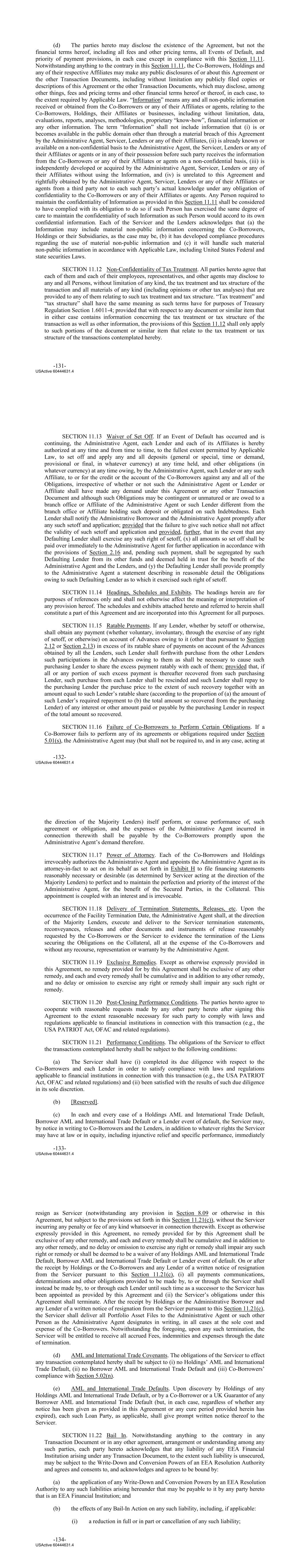 (d) The parties hereto may disclose the existence of the Agreement, but not the financial terms hereof, including all fees and other pricing terms, all Events of Default, and priority of payment provisions, in each case except in compliance with this Section 11.11. Notwithstanding anything to the contrary in this Section 11.11, the Co‐Borrowers, Holdings and any of their respective Affiliates may make any public disclosures of or about this Agreement or the other Transaction Documents, including without limitation any publicly filed copies or descriptions of this Agreement or the other Transaction Documents, which may disclose, among other things, fees and pricing terms and other financial terms hereof or thereof, in each case, to the extent required by Applicable Law. “Information” means any and all non‐public information received or obtained from the Co‐Borrowers or any of their Affiliates or agents, relating to the Co‐Borrowers, Holdings, their Affiliates or businesses, including without limitation, data, evaluations, reports, analyses, methodologies, proprietary “know‐how”, financial information or any other information. The term “Information” shall not include information that (i) is or becomes available in the public domain other than through a material breach of this Agreement by the Administrative Agent, Servicer, Lenders or any of their Affiliates, (ii) is already known or available on a non-confidential basis to the Administrative Agent, the Servicer, Lenders or any of their Affiliates or agents or in any of their possession before such party receives the information from the Co‐Borrowers or any of their Affiliates or agents on a non‐confidential basis, (iii) is independently developed or acquired by the Administrative Agent, Servicer, Lenders or any of their Affiliates without using the Information, and (iv) is unrelated to this Agreement and rightfully obtained by the Administrative Agent, Servicer, Lenders or any of their Affiliates or agents from a third party not to each such party’s actual knowledge under any obligation of confidentiality to the Co‐Borrowers or any of their Affiliates or agents. Any Person required to maintain the confidentiality of Information as provided in this Section 11.11 shall be considered to have complied with its obligation to do so if such Person has exercised the same degree of care to maintain the confidentiality of such Information as such Person would accord to its own confidential information. Each of the Servicer and the Lenders acknowledges that (a) the Information may include material non‐public information concerning the Co‐Borrowers, Holdings or their Subsidiaries, as the case may be, (b) it has developed compliance procedures regarding the use of material non‐public information and (c) it will handle such material non‐public information in accordance with Applicable Law, including United States Federal and state securities Laws. SECTION 11.12 Non‐Confidentiality of Tax Treatment. All parties hereto agree that each of them and each of their employees, representatives, and other agents may disclose to any and all Persons, without limitation of any kind, the tax treatment and tax structure of the transaction and all materials of any kind (including opinions or other tax analyses) that are provided to any of them relating to such tax treatment and tax structure. “Tax treatment” and “tax structure” shall have the same meaning as such terms have for purposes of Treasury Regulation Section 1.6011‐4; provided that with respect to any document or similar item that in either case contains information concerning the tax treatment or tax structure of the transaction as well as other information, the provisions of this Section 11.12 shall only apply to such portions of the document or similar item that relate to the tax treatment or tax structure of the transactions contemplated hereby. -131- USActive 60444631.4 SECTION 11.13 Waiver of Set Off. If an Event of Default has occurred and is continuing, the Administrative Agent, each Lender and each of its Affiliates is hereby authorized at any time and from time to time, to the fullest extent permitted by Applicable Law, to set off and apply any and all deposits (general or special, time or demand, provisional or final, in whatever currency) at any time held, and other obligations (in whatever currency) at any time owing, by the Administrative Agent, such Lender or any such Affiliate, to or for the credit or the account of the Co‐Borrowers against any and all of the Obligations, irrespective of whether or not such the Administrative Agent or Lender or Affiliate shall have made any demand under this Agreement or any other Transaction Document and although such Obligations may be contingent or unmatured or are owed to a branch office or Affiliate of the Administrative Agent or such Lender different from the branch office or Affiliate holding such deposit or obligated on such Indebtedness. Each Lender shall notify the Administrative Borrower and the Administrative Agent promptly after any such setoff and application; provided that the failure to give such notice shall not affect the validity of such setoff and application and provided, further, that in the event that any Defaulting Lender shall exercise any such right of setoff, (x) all amounts so set off shall be paid over immediately to the Administrative Agent for further application in accordance with the provisions of Section 2.16 and, pending such payment, shall be segregated by such Defaulting Lender from its other funds and deemed held in trust for the benefit of the Administrative Agent and the Lenders, and (y) the Defaulting Lender shall provide promptly to the Administrative Agent a statement describing in reasonable detail the Obligations owing to such Defaulting Lender as to which it exercised such right of setoff. SECTION 11.14 Headings, Schedules and Exhibits. The headings herein are for