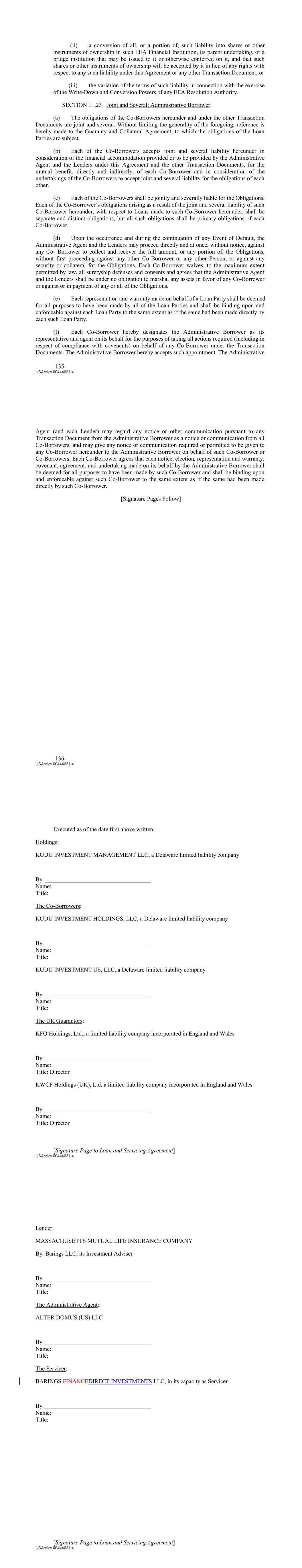 (ii) a conversion of all, or a portion of, such liability into shares or other instruments of ownership in such EEA Financial Institution, its parent undertaking, or a bridge institution that may be issued to it or otherwise conferred on it, and that such shares or other instruments of ownership will be accepted by it in lieu of any rights with respect to any such liability under this Agreement or any other Transaction Document; or (iii) the variation of the terms of such liability in connection with the exercise of the Write‐Down and Conversion Powers of any EEA Resolution Authority. SECTION 11.23 Joint and Several; Administrative Borrower. (a) The obligations of the Co‐Borrowers hereunder and under the other Transaction Documents are joint and several. Without limiting the generality of the foregoing, reference is hereby made to the Guaranty and Collateral Agreement, to which the obligations of the Loan Parties are subject. (b) Each of the Co‐Borrowers accepts joint and several liability hereunder in consideration of the financial accommodation provided or to be provided by the Administrative Agent and the Lenders under this Agreement and the other Transaction Documents, for the mutual benefit, directly and indirectly, of each Co‐Borrower and in consideration of the undertakings of the Co‐Borrowers to accept joint and several liability for the obligations of each other. (c) Each of the Co‐Borrowers shall be jointly and severally liable for the Obligations. Each of the Co‐Borrower’s obligations arising as a result of the joint and several liability of such Co‐Borrower hereunder, with respect to Loans made to such Co‐Borrower hereunder, shall be separate and distinct obligations, but all such obligations shall be primary obligations of each Co‐Borrower. (d) Upon the occurrence and during the continuation of any Event of Default, the Administrative Agent and the Lenders may proceed directly and at once, without notice, against any Co‐ Borrower to collect and recover the full amount, or any portion of, the Obligations, without first proceeding against any other Co‐Borrower or any other Person, or against any security or collateral for the Obligations. Each Co‐Borrower waives, to the maximum extent permitted by law, all suretyship defenses and consents and agrees that the Administrative Agent and the Lenders shall be under no obligation to marshal any assets in favor of any Co‐Borrower or against or in payment of any or all of the Obligations. (e) Each representation and warranty made on behalf of a Loan Party shall be deemed for all purposes to have been made by all of the Loan Parties and shall be binding upon and enforceable against each Loan Party to the same extent as if the same had been made directly by each such Loan Party. (f) Each Co‐Borrower hereby designates the Administrative Borrower as its representative and agent on its behalf for the purposes of taking all actions required (including in respect of compliance with covenants) on behalf of any Co‐Borrower under the Transaction Documents. The Administrative Borrower hereby accepts such appointment. The Administrative -135- USActive 60444631.4 Agent (and each Lender) may regard any notice or other communication pursuant to any Transaction Document from the Administrative Borrower as a notice or communication from all Co‐Borrowers, and may give any notice or communication required or permitted to be given to any Co‐Borrower hereunder to the Administrative Borrower on behalf of such Co‐Borrower or Co‐Borrowers. Each Co‐Borrower agrees that each notice, election, representation and warranty, covenant, agreement, and undertaking made on its behalf by the Administrative Borrower shall be deemed for all purposes to have been made by such Co‐Borrower and shall be binding upon and enforceable against such Co‐Borrower to the same extent as if the same had been made directly by such Co‐Borrower. [Signature Pages Follow] -136- USActive 60444631.4 Executed as of the date first above written. Holdings: KUDU INVESTMENT MANAGEMENT LLC, a Delaware limited liability company By: Name: Title: The Co‐Borrowers: KUDU INVESTMENT HOLDINGS, LLC, a Delaware limited liability company By: Name: Title: KUDU INVESTMENT US, LLC, a Delaware limited liability company By: Name: Title: The UK Guarantors: KFO Holdings, Ltd., a limited liability company incorporated in England and Wales By: Name: Title: Director KWCP Holdings (UK), Ltd. a limited liability company incorporated in England and Wales By: Name: Title: Director [Signature Page to Loan and Servicing Agreement] USActive 60444631.4 Lender: MASSACHUSETTS MUTUAL LIFE INSURANCE COMPANY By: Barings LLC, its Investment Adviser By: Name: Title: The Administrative Agent: ALTER DOMUS (US) LLC By: Name: Title: The Servicer: BARINGS FINANCEDIRECT INVESTMENTS LLC, in its capacity as Servicer By: Name: Title: [Signature Page to Loan and Servicing Agreement] USActive 60444631.4