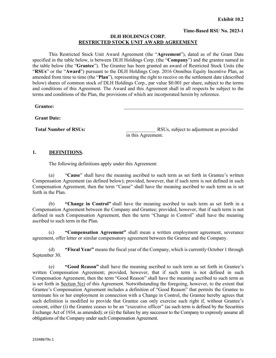 Exhibit 10.2 Time-Based RSU No. 2023-1 23348679v.1 DLH HOLDINGS CORP. RESTRICTED STOCK UNIT AWARD AGREEMENT This Restricted Stock Unit Award Agreement (the “Agreement”), dated as of the Grant Date specified in the table below, is between DLH Holdings Corp. (the “Company”) and the grantee named in the table below (the “Grantee”). The Grantee has been granted an award of Restricted Stock Units (the “RSUs” or the “Award”) pursuant to the DLH Holdings Corp. 2016 Omnibus Equity Incentive Plan, as amended from time to time (the “Plan”), representing the right to receive on the settlement date (described below) shares of common stock of DLH Holdings Corp., par value $0.001 per share, subject to the terms and conditions of this Agreement. The Award and this Agreement shall in all respects be subject to the terms and conditions of the Plan, the provisions of which are incorporated herein by reference. Grantee: Grant Date: Total Number of RSUs: ____________ RSUs, subject to adjustment as provided in this Agreement. 1. DEFINITIONS. The following definitions apply under this Agreement: (a) “Cause” shall have the meaning ascribed to such term as set forth in Grantee’s written Compensation Agreement (as defined below); provided, however, that if such term is not defined in such Compensation Agreement, then the term “Cause” shall have the meaning ascribed to such term as is set forth in the Plan. (b) “Change in Control” shall have the meaning ascribed to such term as set forth in a Compensation Agreement between the Company and Grantee; provided, however, that if such term is not defined in such Compensation Agreement, then the term “Change in Control” shall have the meaning ascribed to such term in the Plan. (c) “Compensation Agreement” shall mean a written employment agreement, severance agreement, offer letter or similar compensatory agreement between the Grantee and the Company. (d) “Fiscal Year” means the fiscal year of the Company, which is currently October 1 through September 30. (e) “Good Reason” shall have the meaning ascribed to such term as set forth in Grantee’s written Compensation Agreement; provided, however, that if such term is not defined in such Compensation Agreement, then the term “Good Reason” shall have the meaning ascribed to such term as is set forth in Section 5(e) of this Agreement. Notwithstanding the foregoing, however, to the extent that Grantee’s Compensation Agreement includes a definition of “Good Reason” that permits the Grantee to terminate his or her employment in connection with a Change in Control, the Grantee hereby agrees that such definition is modified to provide that Grantee can only exercise such right if, without Grantee’s consent, either (i) the Grantee ceases to be an “executive officer” (as such term is defined by the Securities Exchange Act of 1934, as amended); or (ii) the failure by any successor to the Company to expressly assume all obligations of the Company under such Compensation Agreement.