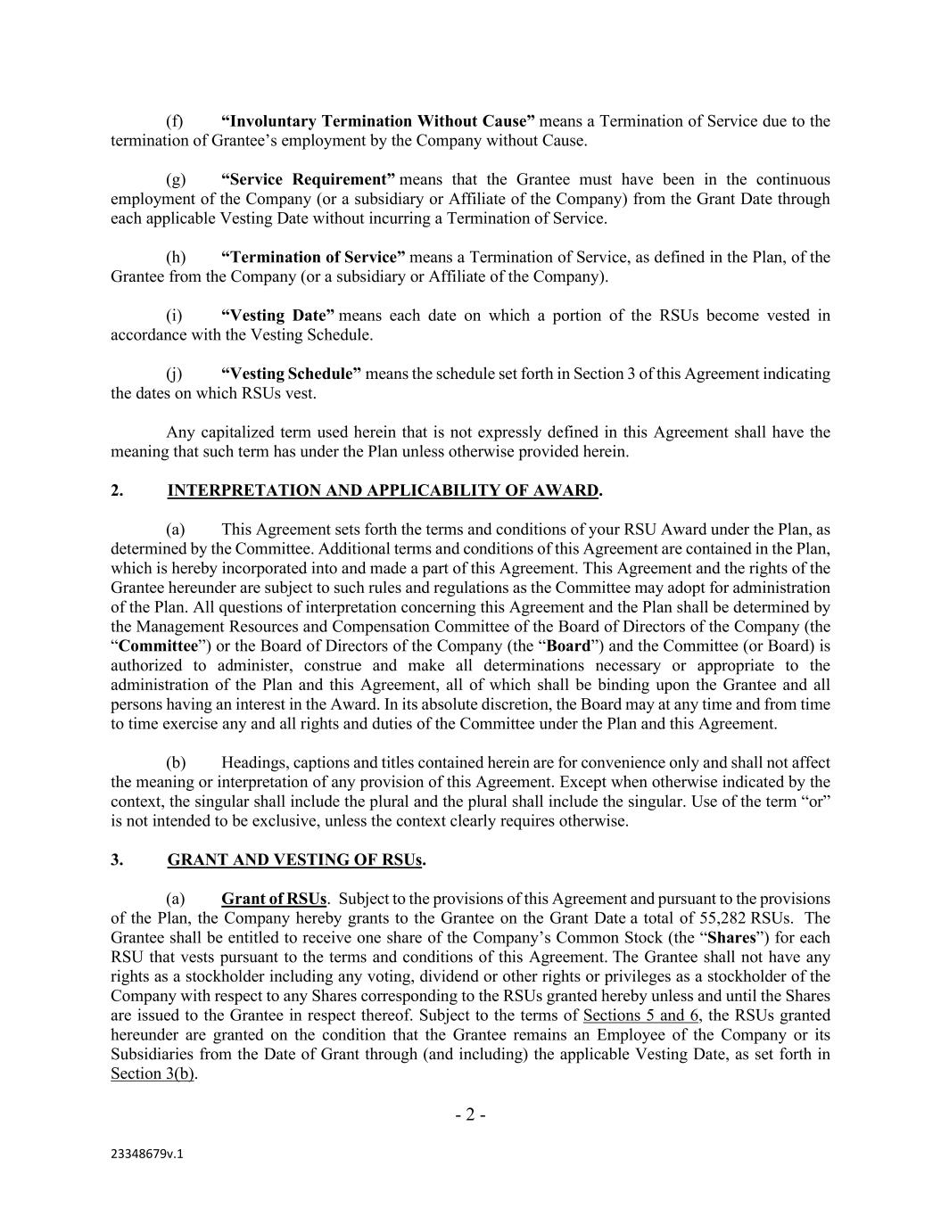 - 2 - 23348679v.1 (f) “Involuntary Termination Without Cause” means a Termination of Service due to the termination of Grantee’s employment by the Company without Cause. (g) “Service Requirement” means that the Grantee must have been in the continuous employment of the Company (or a subsidiary or Affiliate of the Company) from the Grant Date through each applicable Vesting Date without incurring a Termination of Service. (h) “Termination of Service” means a Termination of Service, as defined in the Plan, of the Grantee from the Company (or a subsidiary or Affiliate of the Company). (i) “Vesting Date” means each date on which a portion of the RSUs become vested in accordance with the Vesting Schedule. (j) “Vesting Schedule” means the schedule set forth in Section 3 of this Agreement indicating the dates on which RSUs vest. Any capitalized term used herein that is not expressly defined in this Agreement shall have the meaning that such term has under the Plan unless otherwise provided herein. 2. INTERPRETATION AND APPLICABILITY OF AWARD. (a) This Agreement sets forth the terms and conditions of your RSU Award under the Plan, as determined by the Committee. Additional terms and conditions of this Agreement are contained in the Plan, which is hereby incorporated into and made a part of this Agreement. This Agreement and the rights of the Grantee hereunder are subject to such rules and regulations as the Committee may adopt for administration of the Plan. All questions of interpretation concerning this Agreement and the Plan shall be determined by the Management Resources and Compensation Committee of the Board of Directors of the Company (the “Committee”) or the Board of Directors of the Company (the “Board”) and the Committee (or Board) is authorized to administer, construe and make all determinations necessary or appropriate to the administration of the Plan and this Agreement, all of which shall be binding upon the Grantee and all persons having an interest in the Award. In its absolute discretion, the Board may at any time and from time to time exercise any and all rights and duties of the Committee under the Plan and this Agreement. (b) Headings, captions and titles contained herein are for convenience only and shall not affect the meaning or interpretation of any provision of this Agreement. Except when otherwise indicated by the context, the singular shall include the plural and the plural shall include the singular. Use of the term “or” is not intended to be exclusive, unless the context clearly requires otherwise. 3. GRANT AND VESTING OF RSUs. (a) Grant of RSUs. Subject to the provisions of this Agreement and pursuant to the provisions of the Plan, the Company hereby grants to the Grantee on the Grant Date a total of 55,282 RSUs. The Grantee shall be entitled to receive one share of the Company’s Common Stock (the “Shares”) for each RSU that vests pursuant to the terms and conditions of this Agreement. The Grantee shall not have any rights as a stockholder including any voting, dividend or other rights or privileges as a stockholder of the Company with respect to any Shares corresponding to the RSUs granted hereby unless and until the Shares are issued to the Grantee in respect thereof. Subject to the terms of Sections 5 and 6, the RSUs granted hereunder are granted on the condition that the Grantee remains an Employee of the Company or its Subsidiaries from the Date of Grant through (and including) the applicable Vesting Date, as set forth in Section 3(b).