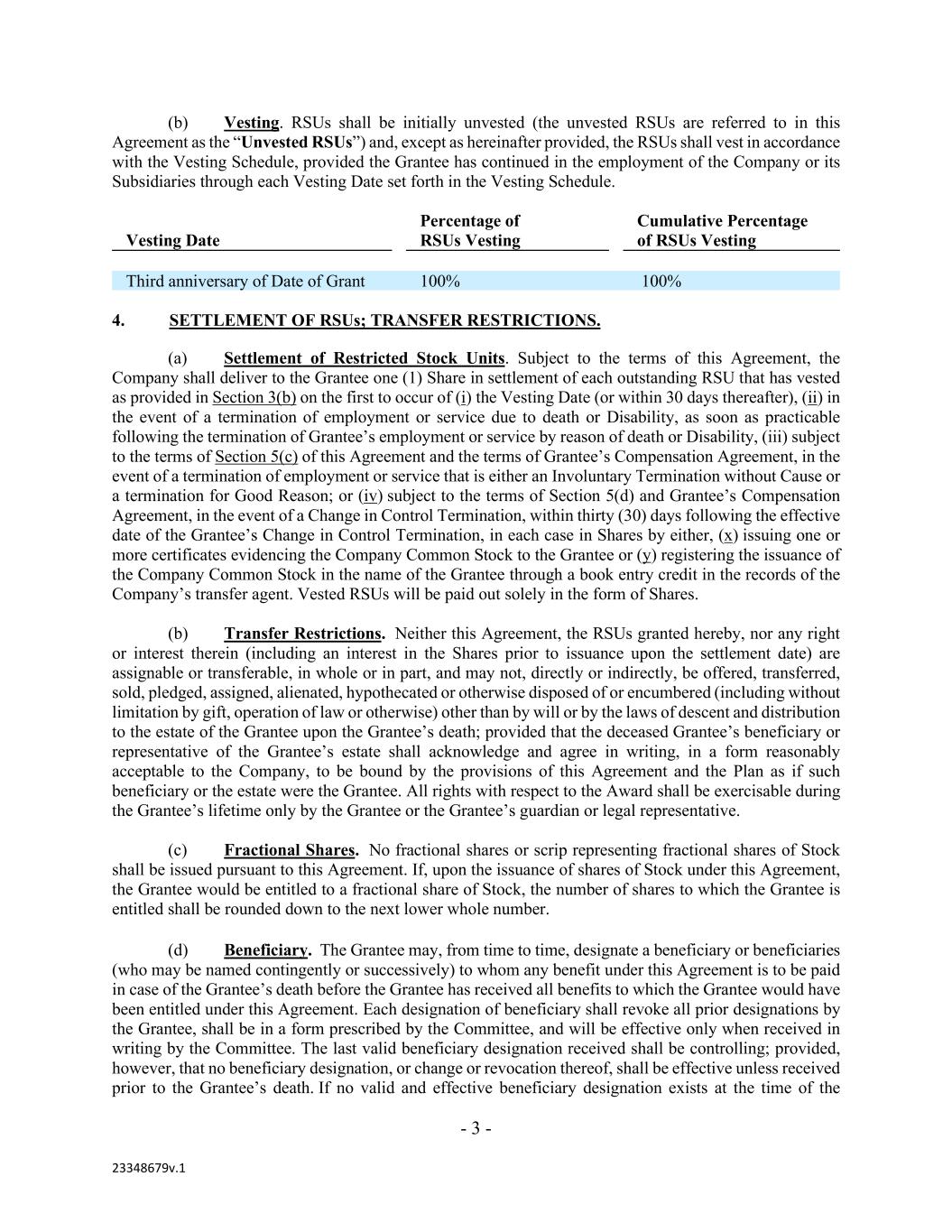 - 3 - 23348679v.1 (b) Vesting. RSUs shall be initially unvested (the unvested RSUs are referred to in this Agreement as the “Unvested RSUs”) and, except as hereinafter provided, the RSUs shall vest in accordance with the Vesting Schedule, provided the Grantee has continued in the employment of the Company or its Subsidiaries through each Vesting Date set forth in the Vesting Schedule. Vesting Date Percentage of RSUs Vesting Cumulative Percentage of RSUs Vesting Third anniversary of Date of Grant 100% 100% 4. SETTLEMENT OF RSUs; TRANSFER RESTRICTIONS. (a) Settlement of Restricted Stock Units. Subject to the terms of this Agreement, the Company shall deliver to the Grantee one (1) Share in settlement of each outstanding RSU that has vested as provided in Section 3(b) on the first to occur of (i) the Vesting Date (or within 30 days thereafter), (ii) in the event of a termination of employment or service due to death or Disability, as soon as practicable following the termination of Grantee’s employment or service by reason of death or Disability, (iii) subject to the terms of Section 5(c) of this Agreement and the terms of Grantee’s Compensation Agreement, in the event of a termination of employment or service that is either an Involuntary Termination without Cause or a termination for Good Reason; or (iv) subject to the terms of Section 5(d) and Grantee’s Compensation Agreement, in the event of a Change in Control Termination, within thirty (30) days following the effective date of the Grantee’s Change in Control Termination, in each case in Shares by either, (x) issuing one or more certificates evidencing the Company Common Stock to the Grantee or (y) registering the issuance of the Company Common Stock in the name of the Grantee through a book entry credit in the records of the Company’s transfer agent. Vested RSUs will be paid out solely in the form of Shares. (b) Transfer Restrictions. Neither this Agreement, the RSUs granted hereby, nor any right or interest therein (including an interest in the Shares prior to issuance upon the settlement date) are assignable or transferable, in whole or in part, and may not, directly or indirectly, be offered, transferred, sold, pledged, assigned, alienated, hypothecated or otherwise disposed of or encumbered (including without limitation by gift, operation of law or otherwise) other than by will or by the laws of descent and distribution to the estate of the Grantee upon the Grantee’s death; provided that the deceased Grantee’s beneficiary or representative of the Grantee’s estate shall acknowledge and agree in writing, in a form reasonably acceptable to the Company, to be bound by the provisions of this Agreement and the Plan as if such beneficiary or the estate were the Grantee. All rights with respect to the Award shall be exercisable during the Grantee’s lifetime only by the Grantee or the Grantee’s guardian or legal representative. (c) Fractional Shares. No fractional shares or scrip representing fractional shares of Stock shall be issued pursuant to this Agreement. If, upon the issuance of shares of Stock under this Agreement, the Grantee would be entitled to a fractional share of Stock, the number of shares to which the Grantee is entitled shall be rounded down to the next lower whole number. (d) Beneficiary. The Grantee may, from time to time, designate a beneficiary or beneficiaries (who may be named contingently or successively) to whom any benefit under this Agreement is to be paid in case of the Grantee’s death before the Grantee has received all benefits to which the Grantee would have been entitled under this Agreement. Each designation of beneficiary shall revoke all prior designations by the Grantee, shall be in a form prescribed by the Committee, and will be effective only when received in writing by the Committee. The last valid beneficiary designation received shall be controlling; provided, however, that no beneficiary designation, or change or revocation thereof, shall be effective unless received prior to the Grantee’s death. If no valid and effective beneficiary designation exists at the time of the