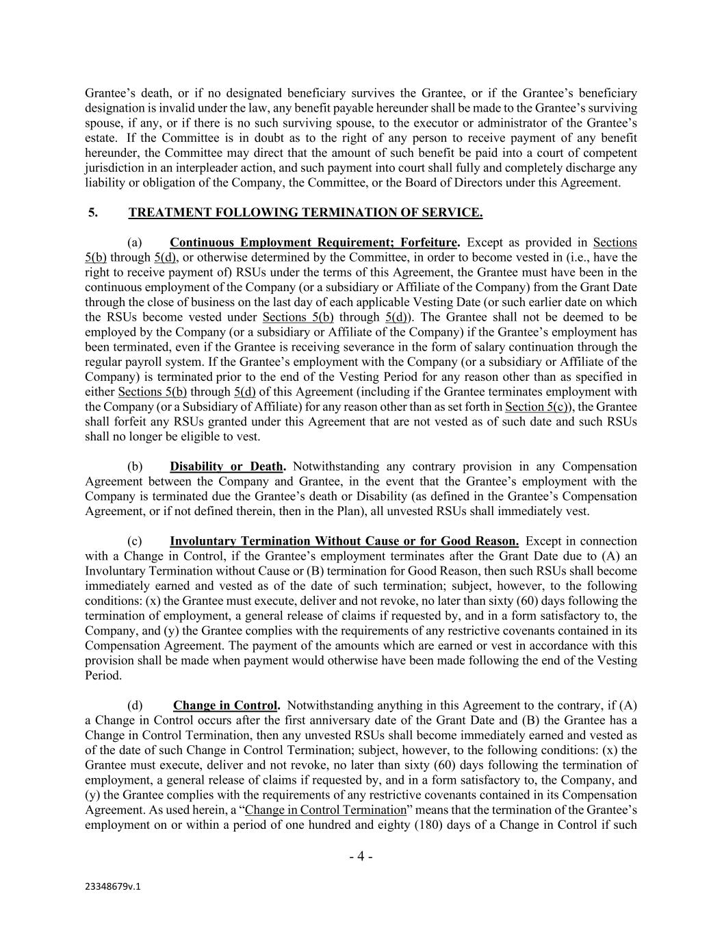- 4 - 23348679v.1 Grantee’s death, or if no designated beneficiary survives the Grantee, or if the Grantee’s beneficiary designation is invalid under the law, any benefit payable hereunder shall be made to the Grantee’s surviving spouse, if any, or if there is no such surviving spouse, to the executor or administrator of the Grantee’s estate. If the Committee is in doubt as to the right of any person to receive payment of any benefit hereunder, the Committee may direct that the amount of such benefit be paid into a court of competent jurisdiction in an interpleader action, and such payment into court shall fully and completely discharge any liability or obligation of the Company, the Committee, or the Board of Directors under this Agreement. 5. TREATMENT FOLLOWING TERMINATION OF SERVICE. (a) Continuous Employment Requirement; Forfeiture. Except as provided in Sections 5(b) through 5(d), or otherwise determined by the Committee, in order to become vested in (i.e., have the right to receive payment of) RSUs under the terms of this Agreement, the Grantee must have been in the continuous employment of the Company (or a subsidiary or Affiliate of the Company) from the Grant Date through the close of business on the last day of each applicable Vesting Date (or such earlier date on which the RSUs become vested under Sections 5(b) through 5(d)). The Grantee shall not be deemed to be employed by the Company (or a subsidiary or Affiliate of the Company) if the Grantee’s employment has been terminated, even if the Grantee is receiving severance in the form of salary continuation through the regular payroll system. If the Grantee’s employment with the Company (or a subsidiary or Affiliate of the Company) is terminated prior to the end of the Vesting Period for any reason other than as specified in either Sections 5(b) through 5(d) of this Agreement (including if the Grantee terminates employment with the Company (or a Subsidiary of Affiliate) for any reason other than as set forth in Section 5(c)), the Grantee shall forfeit any RSUs granted under this Agreement that are not vested as of such date and such RSUs shall no longer be eligible to vest. (b) Disability or Death. Notwithstanding any contrary provision in any Compensation Agreement between the Company and Grantee, in the event that the Grantee’s employment with the Company is terminated due the Grantee’s death or Disability (as defined in the Grantee’s Compensation Agreement, or if not defined therein, then in the Plan), all unvested RSUs shall immediately vest. (c) Involuntary Termination Without Cause or for Good Reason. Except in connection with a Change in Control, if the Grantee’s employment terminates after the Grant Date due to (A) an Involuntary Termination without Cause or (B) termination for Good Reason, then such RSUs shall become immediately earned and vested as of the date of such termination; subject, however, to the following conditions: (x) the Grantee must execute, deliver and not revoke, no later than sixty (60) days following the termination of employment, a general release of claims if requested by, and in a form satisfactory to, the Company, and (y) the Grantee complies with the requirements of any restrictive covenants contained in its Compensation Agreement. The payment of the amounts which are earned or vest in accordance with this provision shall be made when payment would otherwise have been made following the end of the Vesting Period. (d) Change in Control. Notwithstanding anything in this Agreement to the contrary, if (A) a Change in Control occurs after the first anniversary date of the Grant Date and (B) the Grantee has a Change in Control Termination, then any unvested RSUs shall become immediately earned and vested as of the date of such Change in Control Termination; subject, however, to the following conditions: (x) the Grantee must execute, deliver and not revoke, no later than sixty (60) days following the termination of employment, a general release of claims if requested by, and in a form satisfactory to, the Company, and (y) the Grantee complies with the requirements of any restrictive covenants contained in its Compensation Agreement. As used herein, a “Change in Control Termination” means that the termination of the Grantee’s employment on or within a period of one hundred and eighty (180) days of a Change in Control if such