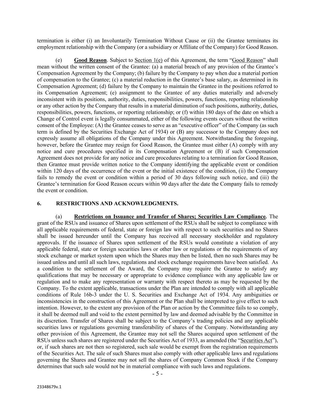 - 5 - 23348679v.1 termination is either (i) an Involuntarily Termination Without Cause or (ii) the Grantee terminates its employment relationship with the Company (or a subsidiary or Affiliate of the Company) for Good Reason. (e) Good Reason. Subject to Section 1(e) of this Agreement, the term “Good Reason” shall mean without the written consent of the Grantee: (a) a material breach of any provision of the Grantee’s Compensation Agreement by the Company; (b) failure by the Company to pay when due a material portion of compensation to the Grantee; (c) a material reduction in the Grantee’s base salary, as determined in its Compensation Agreement; (d) failure by the Company to maintain the Grantee in the positions referred to its Compensation Agreement; (e) assignment to the Grantee of any duties materially and adversely inconsistent with its positions, authority, duties, responsibilities, powers, functions, reporting relationship or any other action by the Company that results in a material diminution of such positions, authority, duties, responsibilities, powers, functions, or reporting relationship; or (f) within 180 days of the date on which a Change of Control event is legally consummated, either of the following events occurs without the written consent of the Employee: (A) the Grantee ceases to serve as an “executive officer” of the Company (as such term is defined by the Securities Exchange Act of 1934) or (B) any successor to the Company does not expressly assume all obligations of the Company under this Agreement. Notwithstanding the foregoing, however, before the Grantee may resign for Good Reason, the Grantee must either (A) comply with any notice and cure procedures specified in its Compensation Agreement or (B) if such Compensation Agreement does not provide for any notice and cure procedures relating to a termination for Good Reason, then Grantee must provide written notice to the Company identifying the applicable event or condition within 120 days of the occurrence of the event or the initial existence of the condition, (ii) the Company fails to remedy the event or condition within a period of 30 days following such notice, and (iii) the Grantee’s termination for Good Reason occurs within 90 days after the date the Company fails to remedy the event or condition. 6. RESTRICTIONS AND ACKNOWLEDGMENTS. (a) Restrictions on Issuance and Transfer of Shares; Securities Law Compliance. The grant of the RSUs and issuance of Shares upon settlement of the RSUs shall be subject to compliance with all applicable requirements of federal, state or foreign law with respect to such securities and no Shares shall be issued hereunder until the Company has received all necessary stockholder and regulatory approvals. If the issuance of Shares upon settlement of the RSUs would constitute a violation of any applicable federal, state or foreign securities laws or other law or regulations or the requirements of any stock exchange or market system upon which the Shares may then be listed, then no such Shares may be issued unless and until all such laws, regulations and stock exchange requirements have been satisfied. As a condition to the settlement of the Award, the Company may require the Grantee to satisfy any qualifications that may be necessary or appropriate to evidence compliance with any applicable law or regulation and to make any representation or warranty with respect thereto as may be requested by the Company. To the extent applicable, transactions under the Plan are intended to comply with all applicable conditions of Rule 16b-3 under the U. S. Securities and Exchange Act of 1934. Any ambiguities or inconsistencies in the construction of this Agreement or the Plan shall be interpreted to give effect to such intention. However, to the extent any provision of the Plan or action by the Committee fails to so comply, it shall be deemed null and void to the extent permitted by law and deemed advisable by the Committee in its discretion. Transfer of Shares shall be subject to the Company’s trading policies and any applicable securities laws or regulations governing transferability of shares of the Company. Notwithstanding any other provision of this Agreement, the Grantee may not sell the Shares acquired upon settlement of the RSUs unless such shares are registered under the Securities Act of 1933, as amended (the “Securities Act”), or, if such shares are not then so registered, such sale would be exempt from the registration requirements of the Securities Act. The sale of such Shares must also comply with other applicable laws and regulations governing the Shares and Grantee may not sell the shares of Company Common Stock if the Company determines that such sale would not be in material compliance with such laws and regulations.