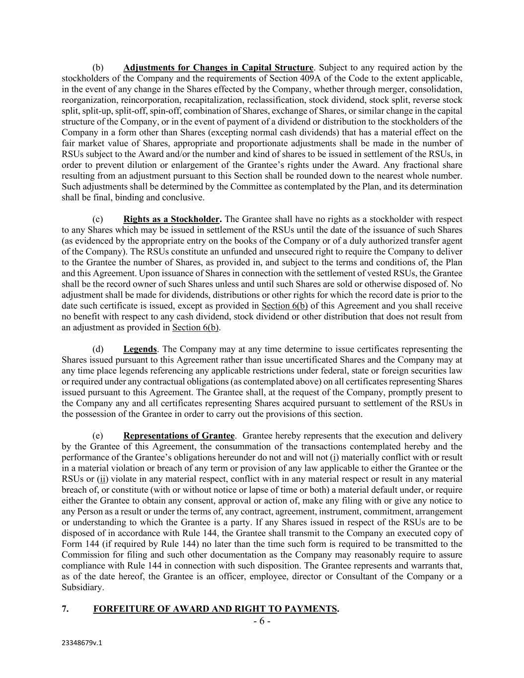 - 6 - 23348679v.1 (b) Adjustments for Changes in Capital Structure. Subject to any required action by the stockholders of the Company and the requirements of Section 409A of the Code to the extent applicable, in the event of any change in the Shares effected by the Company, whether through merger, consolidation, reorganization, reincorporation, recapitalization, reclassification, stock dividend, stock split, reverse stock split, split-up, split-off, spin-off, combination of Shares, exchange of Shares, or similar change in the capital structure of the Company, or in the event of payment of a dividend or distribution to the stockholders of the Company in a form other than Shares (excepting normal cash dividends) that has a material effect on the fair market value of Shares, appropriate and proportionate adjustments shall be made in the number of RSUs subject to the Award and/or the number and kind of shares to be issued in settlement of the RSUs, in order to prevent dilution or enlargement of the Grantee’s rights under the Award. Any fractional share resulting from an adjustment pursuant to this Section shall be rounded down to the nearest whole number. Such adjustments shall be determined by the Committee as contemplated by the Plan, and its determination shall be final, binding and conclusive. (c) Rights as a Stockholder. The Grantee shall have no rights as a stockholder with respect to any Shares which may be issued in settlement of the RSUs until the date of the issuance of such Shares (as evidenced by the appropriate entry on the books of the Company or of a duly authorized transfer agent of the Company). The RSUs constitute an unfunded and unsecured right to require the Company to deliver to the Grantee the number of Shares, as provided in, and subject to the terms and conditions of, the Plan and this Agreement. Upon issuance of Shares in connection with the settlement of vested RSUs, the Grantee shall be the record owner of such Shares unless and until such Shares are sold or otherwise disposed of. No adjustment shall be made for dividends, distributions or other rights for which the record date is prior to the date such certificate is issued, except as provided in Section 6(b) of this Agreement and you shall receive no benefit with respect to any cash dividend, stock dividend or other distribution that does not result from an adjustment as provided in Section 6(b). (d) Legends. The Company may at any time determine to issue certificates representing the Shares issued pursuant to this Agreement rather than issue uncertificated Shares and the Company may at any time place legends referencing any applicable restrictions under federal, state or foreign securities law or required under any contractual obligations (as contemplated above) on all certificates representing Shares issued pursuant to this Agreement. The Grantee shall, at the request of the Company, promptly present to the Company any and all certificates representing Shares acquired pursuant to settlement of the RSUs in the possession of the Grantee in order to carry out the provisions of this section. (e) Representations of Grantee. Grantee hereby represents that the execution and delivery by the Grantee of this Agreement, the consummation of the transactions contemplated hereby and the performance of the Grantee’s obligations hereunder do not and will not (i) materially conflict with or result in a material violation or breach of any term or provision of any law applicable to either the Grantee or the RSUs or (ii) violate in any material respect, conflict with in any material respect or result in any material breach of, or constitute (with or without notice or lapse of time or both) a material default under, or require either the Grantee to obtain any consent, approval or action of, make any filing with or give any notice to any Person as a result or under the terms of, any contract, agreement, instrument, commitment, arrangement or understanding to which the Grantee is a party. If any Shares issued in respect of the RSUs are to be disposed of in accordance with Rule 144, the Grantee shall transmit to the Company an executed copy of Form 144 (if required by Rule 144) no later than the time such form is required to be transmitted to the Commission for filing and such other documentation as the Company may reasonably require to assure compliance with Rule 144 in connection with such disposition. The Grantee represents and warrants that, as of the date hereof, the Grantee is an officer, employee, director or Consultant of the Company or a Subsidiary. 7. FORFEITURE OF AWARD AND RIGHT TO PAYMENTS.