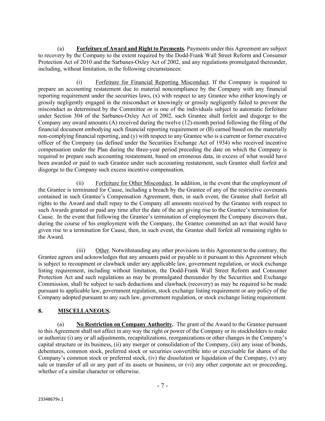 - 7 - 23348679v.1 (a) Forfeiture of Award and Right to Payments. Payments under this Agreement are subject to recovery by the Company to the extent required by the Dodd-Frank Wall Street Reform and Consumer Protection Act of 2010 and the Sarbanes-Oxley Act of 2002, and any regulations promulgated thereunder, including, without limitation, in the following circumstances: (i) Forfeiture for Financial Reporting Misconduct. If the Company is required to prepare an accounting restatement due to material noncompliance by the Company with any financial reporting requirement under the securities laws, (x) with respect to any Grantee who either knowingly or grossly negligently engaged in the misconduct or knowingly or grossly negligently failed to prevent the misconduct as determined by the Committee or is one of the individuals subject to automatic forfeiture under Section 304 of the Sarbanes-Oxley Act of 2002, such Grantee shall forfeit and disgorge to the Company any award amounts (A) received during the twelve (12)-month period following the filing of the financial document embodying such financial reporting requirement or (B) earned based on the materially non-complying financial reporting, and (y) with respect to any Grantee who is a current or former executive officer of the Company (as defined under the Securities Exchange Act of 1934) who received incentive compensation under the Plan during the three-year period preceding the date on which the Company is required to prepare such accounting restatement, based on erroneous data, in excess of what would have been awarded or paid to such Grantee under such accounting restatement, such Grantee shall forfeit and disgorge to the Company such excess incentive compensation. (ii) Forfeiture for Other Misconduct. In addition, in the event that the employment of the Grantee is terminated for Cause, including a breach by the Grantee of any of the restrictive covenants contained in such Grantee’s Compensation Agreement, then, in such event, the Grantee shall forfeit all rights to the Award and shall repay to the Company all amounts received by the Grantee with respect to such Awards granted or paid any time after the date of the act giving rise to the Grantee’s termination for Cause. In the event that following the Grantee’s termination of employment the Company discovers that, during the course of his employment with the Company, the Grantee committed an act that would have given rise to a termination for Cause, then, in such event, the Grantee shall forfeit all remaining rights to the Award. (iii) Other. Notwithstanding any other provisions in this Agreement to the contrary, the Grantee agrees and acknowledges that any amounts paid or payable to it pursuant to this Agreement which is subject to recoupment or clawback under any applicable law, government regulation, or stock exchange listing requirement, including without limitation, the Dodd-Frank Wall Street Reform and Consumer Protection Act and such regulations as may be promulgated thereunder by the Securities and Exchange Commission, shall be subject to such deductions and clawback (recovery) as may be required to be made pursuant to applicable law, government regulation, stock exchange listing requirement or any policy of the Company adopted pursuant to any such law, government regulation, or stock exchange listing requirement. 8. MISCELLANEOUS. (a) No Restriction on Company Authority. The grant of the Award to the Grantee pursuant to this Agreement shall not affect in any way the right or power of the Company or its stockholders to make or authorize (i) any or all adjustments, recapitalizations, reorganizations or other changes in the Company’s capital structure or its business, (ii) any merger or consolidation of the Company, (iii) any issue of bonds, debentures, common stock, preferred stock or securities convertible into or exercisable for shares of the Company’s common stock or preferred stock, (iv) the dissolution or liquidation of the Company, (v) any sale or transfer of all or any part of its assets or business, or (vi) any other corporate act or proceeding, whether of a similar character or otherwise.