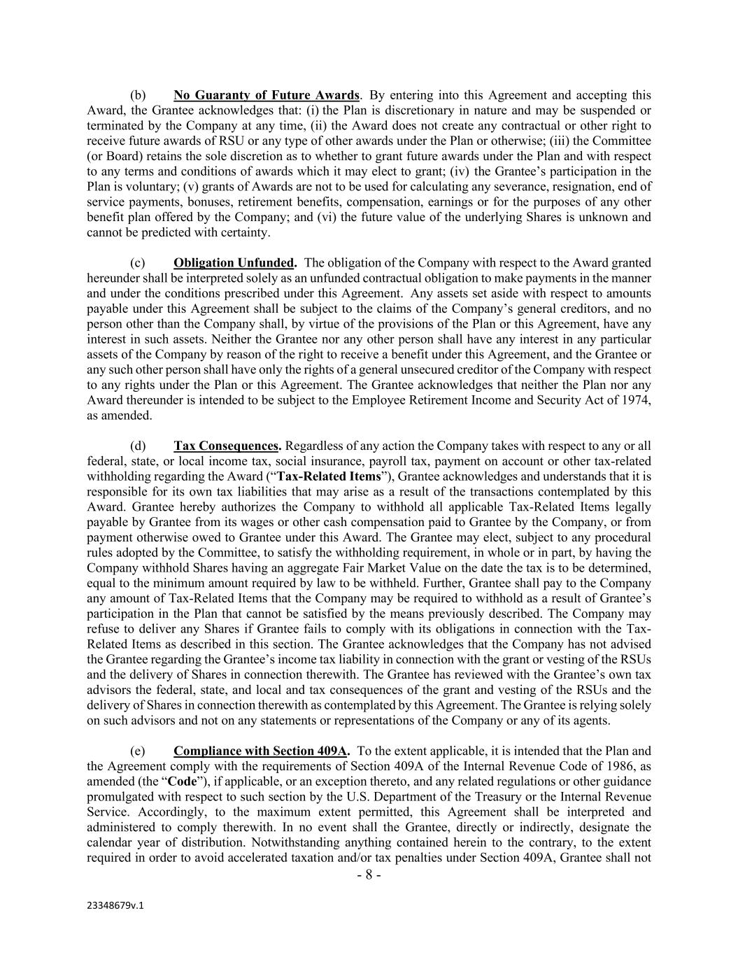 - 8 - 23348679v.1 (b) No Guaranty of Future Awards. By entering into this Agreement and accepting this Award, the Grantee acknowledges that: (i) the Plan is discretionary in nature and may be suspended or terminated by the Company at any time, (ii) the Award does not create any contractual or other right to receive future awards of RSU or any type of other awards under the Plan or otherwise; (iii) the Committee (or Board) retains the sole discretion as to whether to grant future awards under the Plan and with respect to any terms and conditions of awards which it may elect to grant; (iv) the Grantee’s participation in the Plan is voluntary; (v) grants of Awards are not to be used for calculating any severance, resignation, end of service payments, bonuses, retirement benefits, compensation, earnings or for the purposes of any other benefit plan offered by the Company; and (vi) the future value of the underlying Shares is unknown and cannot be predicted with certainty. (c) Obligation Unfunded. The obligation of the Company with respect to the Award granted hereunder shall be interpreted solely as an unfunded contractual obligation to make payments in the manner and under the conditions prescribed under this Agreement. Any assets set aside with respect to amounts payable under this Agreement shall be subject to the claims of the Company’s general creditors, and no person other than the Company shall, by virtue of the provisions of the Plan or this Agreement, have any interest in such assets. Neither the Grantee nor any other person shall have any interest in any particular assets of the Company by reason of the right to receive a benefit under this Agreement, and the Grantee or any such other person shall have only the rights of a general unsecured creditor of the Company with respect to any rights under the Plan or this Agreement. The Grantee acknowledges that neither the Plan nor any Award thereunder is intended to be subject to the Employee Retirement Income and Security Act of 1974, as amended. (d) Tax Consequences. Regardless of any action the Company takes with respect to any or all federal, state, or local income tax, social insurance, payroll tax, payment on account or other tax-related withholding regarding the Award (“Tax-Related Items”), Grantee acknowledges and understands that it is responsible for its own tax liabilities that may arise as a result of the transactions contemplated by this Award. Grantee hereby authorizes the Company to withhold all applicable Tax-Related Items legally payable by Grantee from its wages or other cash compensation paid to Grantee by the Company, or from payment otherwise owed to Grantee under this Award. The Grantee may elect, subject to any procedural rules adopted by the Committee, to satisfy the withholding requirement, in whole or in part, by having the Company withhold Shares having an aggregate Fair Market Value on the date the tax is to be determined, equal to the minimum amount required by law to be withheld. Further, Grantee shall pay to the Company any amount of Tax-Related Items that the Company may be required to withhold as a result of Grantee’s participation in the Plan that cannot be satisfied by the means previously described. The Company may refuse to deliver any Shares if Grantee fails to comply with its obligations in connection with the Tax- Related Items as described in this section. The Grantee acknowledges that the Company has not advised the Grantee regarding the Grantee’s income tax liability in connection with the grant or vesting of the RSUs and the delivery of Shares in connection therewith. The Grantee has reviewed with the Grantee’s own tax advisors the federal, state, and local and tax consequences of the grant and vesting of the RSUs and the delivery of Shares in connection therewith as contemplated by this Agreement. The Grantee is relying solely on such advisors and not on any statements or representations of the Company or any of its agents. (e) Compliance with Section 409A. To the extent applicable, it is intended that the Plan and the Agreement comply with the requirements of Section 409A of the Internal Revenue Code of 1986, as amended (the “Code”), if applicable, or an exception thereto, and any related regulations or other guidance promulgated with respect to such section by the U.S. Department of the Treasury or the Internal Revenue Service. Accordingly, to the maximum extent permitted, this Agreement shall be interpreted and administered to comply therewith. In no event shall the Grantee, directly or indirectly, designate the calendar year of distribution. Notwithstanding anything contained herein to the contrary, to the extent required in order to avoid accelerated taxation and/or tax penalties under Section 409A, Grantee shall not