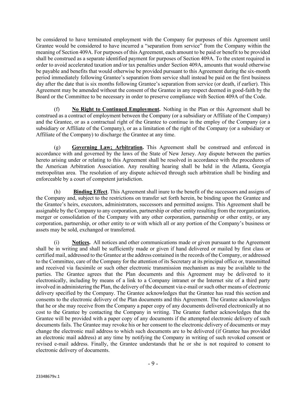 - 9 - 23348679v.1 be considered to have terminated employment with the Company for purposes of this Agreement until Grantee would be considered to have incurred a “separation from service” from the Company within the meaning of Section 409A. For purposes of this Agreement, each amount to be paid or benefit to be provided shall be construed as a separate identified payment for purposes of Section 409A. To the extent required in order to avoid accelerated taxation and/or tax penalties under Section 409A, amounts that would otherwise be payable and benefits that would otherwise be provided pursuant to this Agreement during the six-month period immediately following Grantee’s separation from service shall instead be paid on the first business day after the date that is six months following Grantee’s separation from service (or death, if earlier). This Agreement may be amended without the consent of the Grantee in any respect deemed in good-faith by the Board or the Committee to be necessary in order to preserve compliance with Section 409A of the Code. (f) No Right to Continued Employment. Nothing in the Plan or this Agreement shall be construed as a contract of employment between the Company (or a subsidiary or Affiliate of the Company) and the Grantee, or as a contractual right of the Grantee to continue in the employ of the Company (or a subsidiary or Affiliate of the Company), or as a limitation of the right of the Company (or a subsidiary or Affiliate of the Company) to discharge the Grantee at any time. (g) Governing Law; Arbitration. This Agreement shall be construed and enforced in accordance with and governed by the laws of the State of New Jersey. Any dispute between the parties hereto arising under or relating to this Agreement shall be resolved in accordance with the procedures of the American Arbitration Association. Any resulting hearing shall be held in the Atlanta, Georgia metropolitan area. The resolution of any dispute achieved through such arbitration shall be binding and enforceable by a court of competent jurisdiction. (h) Binding Effect. This Agreement shall inure to the benefit of the successors and assigns of the Company and, subject to the restrictions on transfer set forth herein, be binding upon the Grantee and the Grantee’s heirs, executors, administrators, successors and permitted assigns. This Agreement shall be assignable by the Company to any corporation, partnership or other entity resulting from the reorganization, merger or consolidation of the Company with any other corporation, partnership or other entity, or any corporation, partnership, or other entity to or with which all or any portion of the Company’s business or assets may be sold, exchanged or transferred. (i) Notices. All notices and other communications made or given pursuant to the Agreement shall be in writing and shall be sufficiently made or given if hand delivered or mailed by first class or certified mail, addressed to the Grantee at the address contained in the records of the Company, or addressed to the Committee, care of the Company for the attention of its Secretary at its principal office or, transmitted and received via facsimile or such other electronic transmission mechanism as may be available to the parties. The Grantee agrees that the Plan documents and this Agreement may be delivered to it electronically, including by means of a link to a Company intranet or the Internet site of a third party involved in administering the Plan, the delivery of the document via e-mail or such other means of electronic delivery specified by the Company. The Grantee acknowledges that the Grantee has read this section and consents to the electronic delivery of the Plan documents and this Agreement. The Grantee acknowledges that he or she may receive from the Company a paper copy of any documents delivered electronically at no cost to the Grantee by contacting the Company in writing. The Grantee further acknowledges that the Grantee will be provided with a paper copy of any documents if the attempted electronic delivery of such documents fails. The Grantee may revoke his or her consent to the electronic delivery of documents or may change the electronic mail address to which such documents are to be delivered (if Grantee has provided an electronic mail address) at any time by notifying the Company in writing of such revoked consent or revised e-mail address. Finally, the Grantee understands that he or she is not required to consent to electronic delivery of documents.