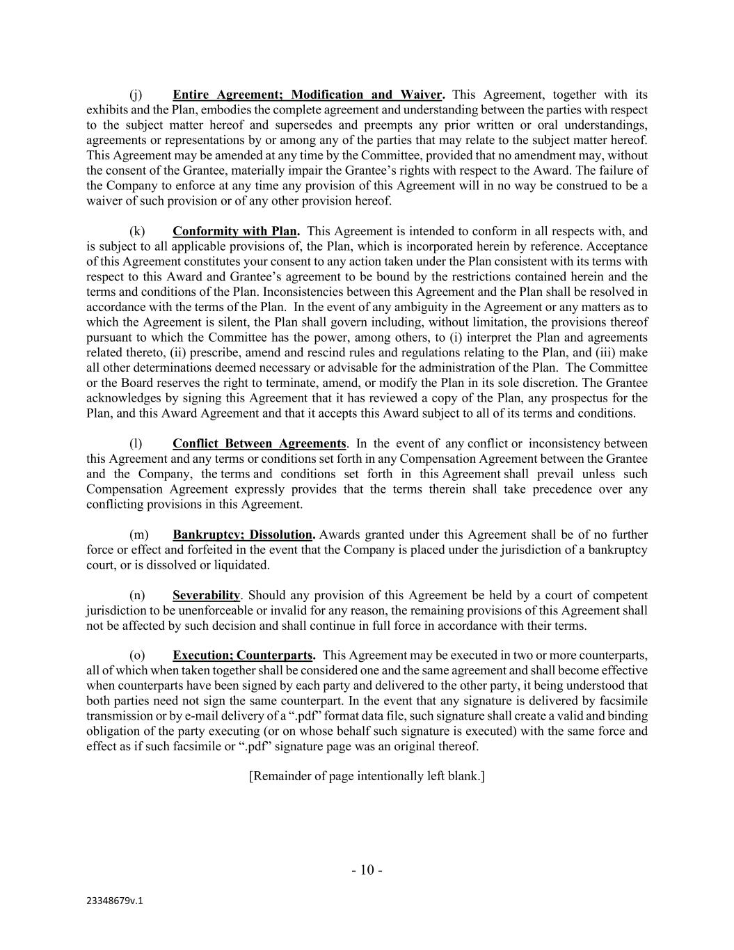 - 10 - 23348679v.1 (j) Entire Agreement; Modification and Waiver. This Agreement, together with its exhibits and the Plan, embodies the complete agreement and understanding between the parties with respect to the subject matter hereof and supersedes and preempts any prior written or oral understandings, agreements or representations by or among any of the parties that may relate to the subject matter hereof. This Agreement may be amended at any time by the Committee, provided that no amendment may, without the consent of the Grantee, materially impair the Grantee’s rights with respect to the Award. The failure of the Company to enforce at any time any provision of this Agreement will in no way be construed to be a waiver of such provision or of any other provision hereof. (k) Conformity with Plan. This Agreement is intended to conform in all respects with, and is subject to all applicable provisions of, the Plan, which is incorporated herein by reference. Acceptance of this Agreement constitutes your consent to any action taken under the Plan consistent with its terms with respect to this Award and Grantee’s agreement to be bound by the restrictions contained herein and the terms and conditions of the Plan. Inconsistencies between this Agreement and the Plan shall be resolved in accordance with the terms of the Plan. In the event of any ambiguity in the Agreement or any matters as to which the Agreement is silent, the Plan shall govern including, without limitation, the provisions thereof pursuant to which the Committee has the power, among others, to (i) interpret the Plan and agreements related thereto, (ii) prescribe, amend and rescind rules and regulations relating to the Plan, and (iii) make all other determinations deemed necessary or advisable for the administration of the Plan. The Committee or the Board reserves the right to terminate, amend, or modify the Plan in its sole discretion. The Grantee acknowledges by signing this Agreement that it has reviewed a copy of the Plan, any prospectus for the Plan, and this Award Agreement and that it accepts this Award subject to all of its terms and conditions. (l) Conflict Between Agreements. In the event of any conflict or inconsistency between this Agreement and any terms or conditions set forth in any Compensation Agreement between the Grantee and the Company, the terms and conditions set forth in this Agreement shall prevail unless such Compensation Agreement expressly provides that the terms therein shall take precedence over any conflicting provisions in this Agreement. (m) Bankruptcy; Dissolution. Awards granted under this Agreement shall be of no further force or effect and forfeited in the event that the Company is placed under the jurisdiction of a bankruptcy court, or is dissolved or liquidated. (n) Severability. Should any provision of this Agreement be held by a court of competent jurisdiction to be unenforceable or invalid for any reason, the remaining provisions of this Agreement shall not be affected by such decision and shall continue in full force in accordance with their terms. (o) Execution; Counterparts. This Agreement may be executed in two or more counterparts, all of which when taken together shall be considered one and the same agreement and shall become effective when counterparts have been signed by each party and delivered to the other party, it being understood that both parties need not sign the same counterpart. In the event that any signature is delivered by facsimile transmission or by e-mail delivery of a “.pdf” format data file, such signature shall create a valid and binding obligation of the party executing (or on whose behalf such signature is executed) with the same force and effect as if such facsimile or “.pdf” signature page was an original thereof. [Remainder of page intentionally left blank.]