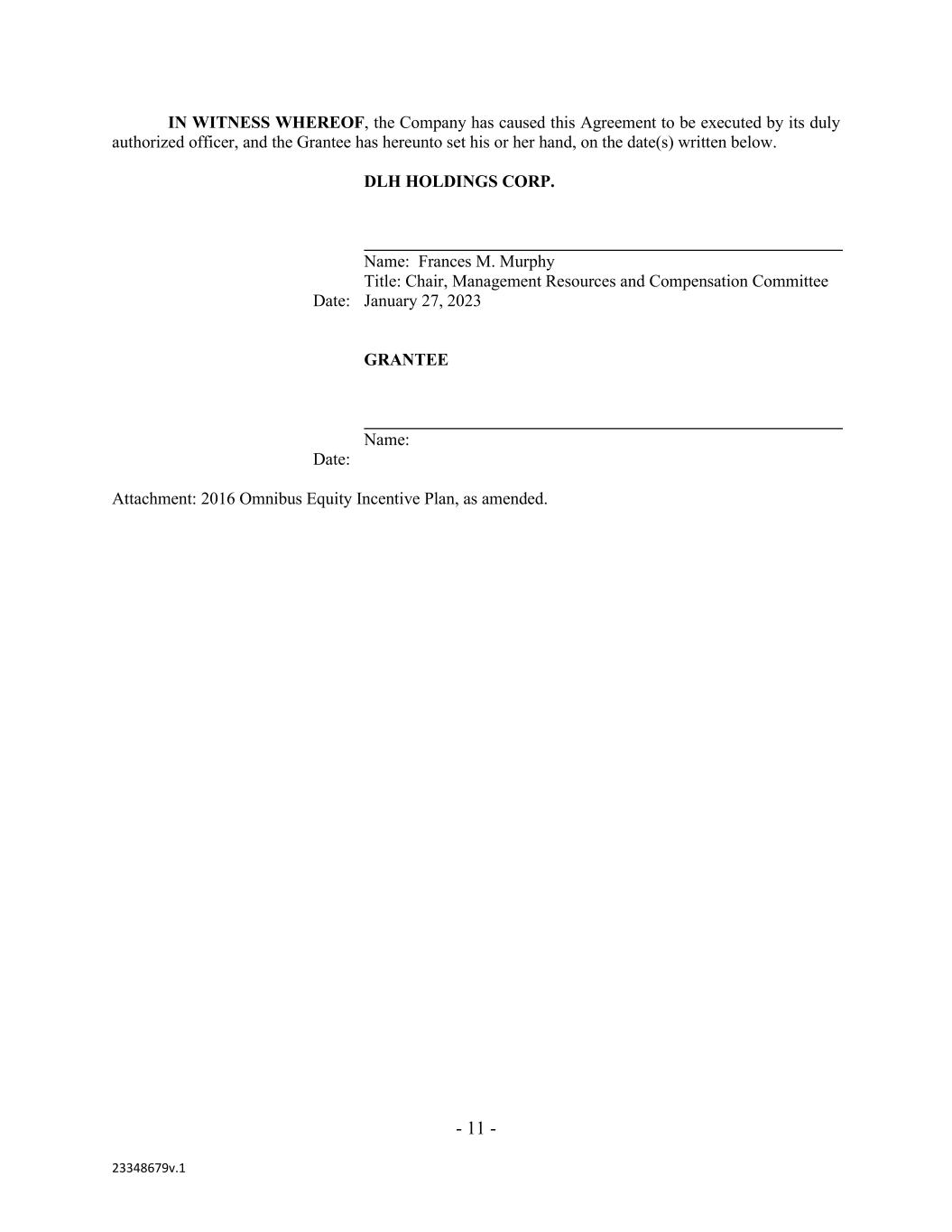- 11 - 23348679v.1 IN WITNESS WHEREOF, the Company has caused this Agreement to be executed by its duly authorized officer, and the Grantee has hereunto set his or her hand, on the date(s) written below. DLH HOLDINGS CORP. Name: Frances M. Murphy Title: Chair, Management Resources and Compensation Committee Date: January 27, 2023 GRANTEE Name: Date: Attachment: 2016 Omnibus Equity Incentive Plan, as amended.
