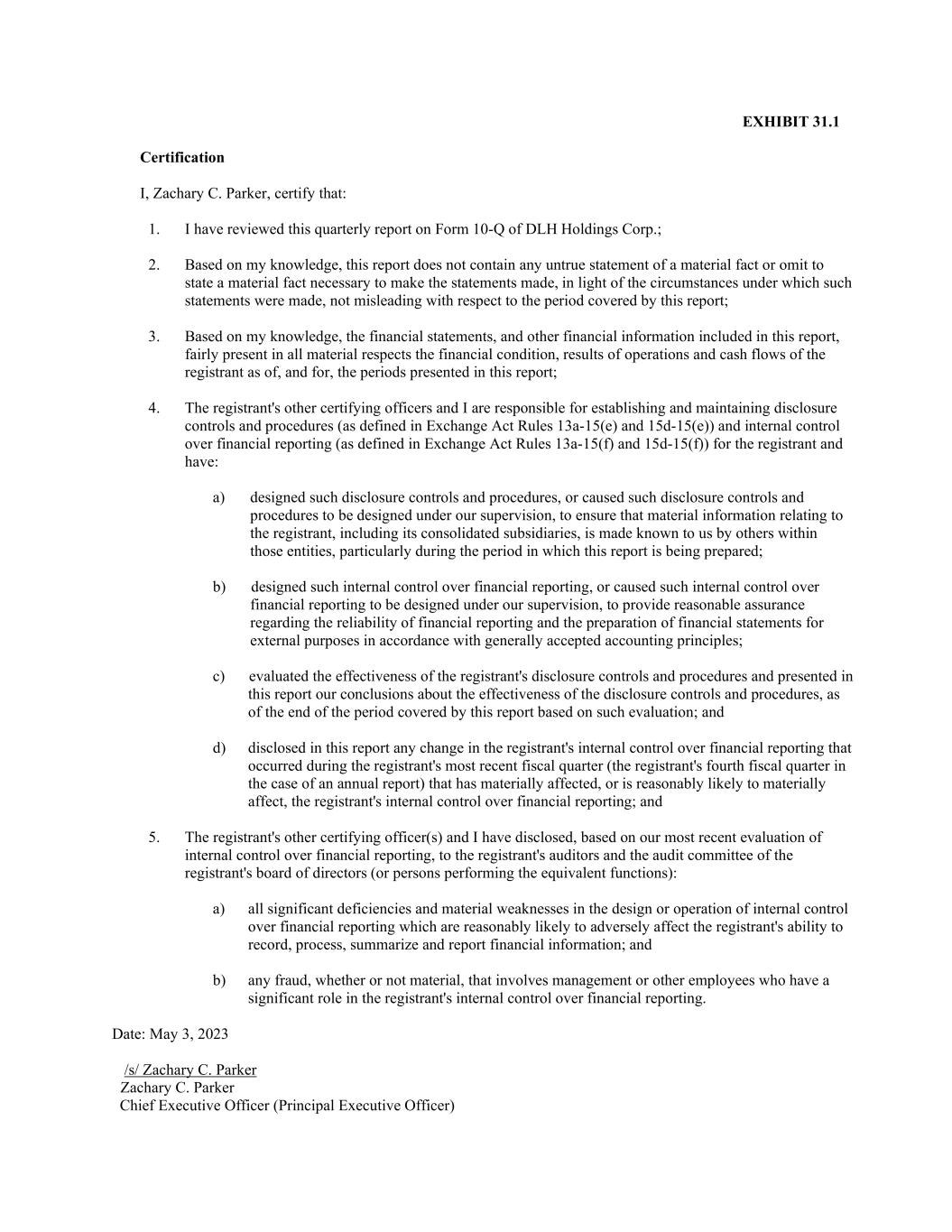 EXHIBIT 31.1 Certification I, Zachary C. Parker, certify that: 1. I have reviewed this quarterly report on Form 10-Q of DLH Holdings Corp.; 2. Based on my knowledge, this report does not contain any untrue statement of a material fact or omit to state a material fact necessary to make the statements made, in light of the circumstances under which such statements were made, not misleading with respect to the period covered by this report; 3. Based on my knowledge, the financial statements, and other financial information included in this report, fairly present in all material respects the financial condition, results of operations and cash flows of the registrant as of, and for, the periods presented in this report; 4. The registrant's other certifying officers and I are responsible for establishing and maintaining disclosure controls and procedures (as defined in Exchange Act Rules 13a-15(e) and 15d-15(e)) and internal control over financial reporting (as defined in Exchange Act Rules 13a-15(f) and 15d-15(f)) for the registrant and have: a) designed such disclosure controls and procedures, or caused such disclosure controls and procedures to be designed under our supervision, to ensure that material information relating to the registrant, including its consolidated subsidiaries, is made known to us by others within those entities, particularly during the period in which this report is being prepared; b) designed such internal control over financial reporting, or caused such internal control over financial reporting to be designed under our supervision, to provide reasonable assurance regarding the reliability of financial reporting and the preparation of financial statements for external purposes in accordance with generally accepted accounting principles; c) evaluated the effectiveness of the registrant's disclosure controls and procedures and presented in this report our conclusions about the effectiveness of the disclosure controls and procedures, as of the end of the period covered by this report based on such evaluation; and d) disclosed in this report any change in the registrant's internal control over financial reporting that occurred during the registrant's most recent fiscal quarter (the registrant's fourth fiscal quarter in the case of an annual report) that has materially affected, or is reasonably likely to materially affect, the registrant's internal control over financial reporting; and 5. The registrant's other certifying officer(s) and I have disclosed, based on our most recent evaluation of internal control over financial reporting, to the registrant's auditors and the audit committee of the registrant's board of directors (or persons performing the equivalent functions): a) all significant deficiencies and material weaknesses in the design or operation of internal control over financial reporting which are reasonably likely to adversely affect the registrant's ability to record, process, summarize and report financial information; and b) any fraud, whether or not material, that involves management or other employees who have a significant role in the registrant's internal control over financial reporting. Date: May 3, 2023 /s/ Zachary C. Parker Zachary C. Parker Chief Executive Officer (Principal Executive Officer)